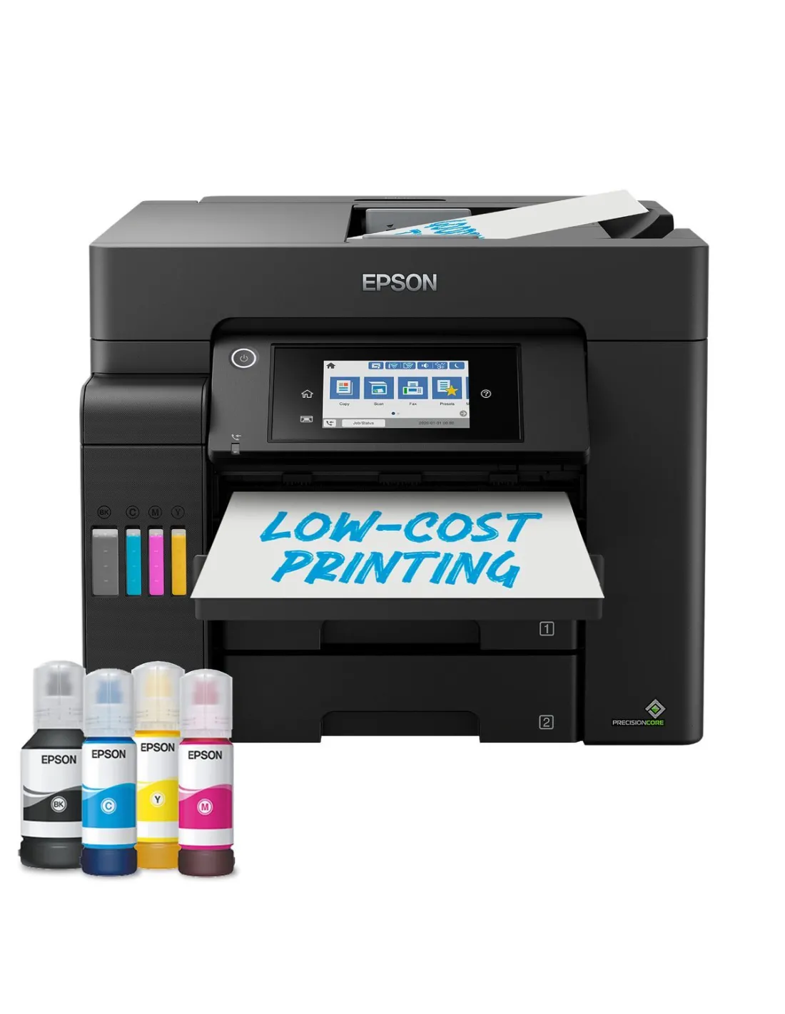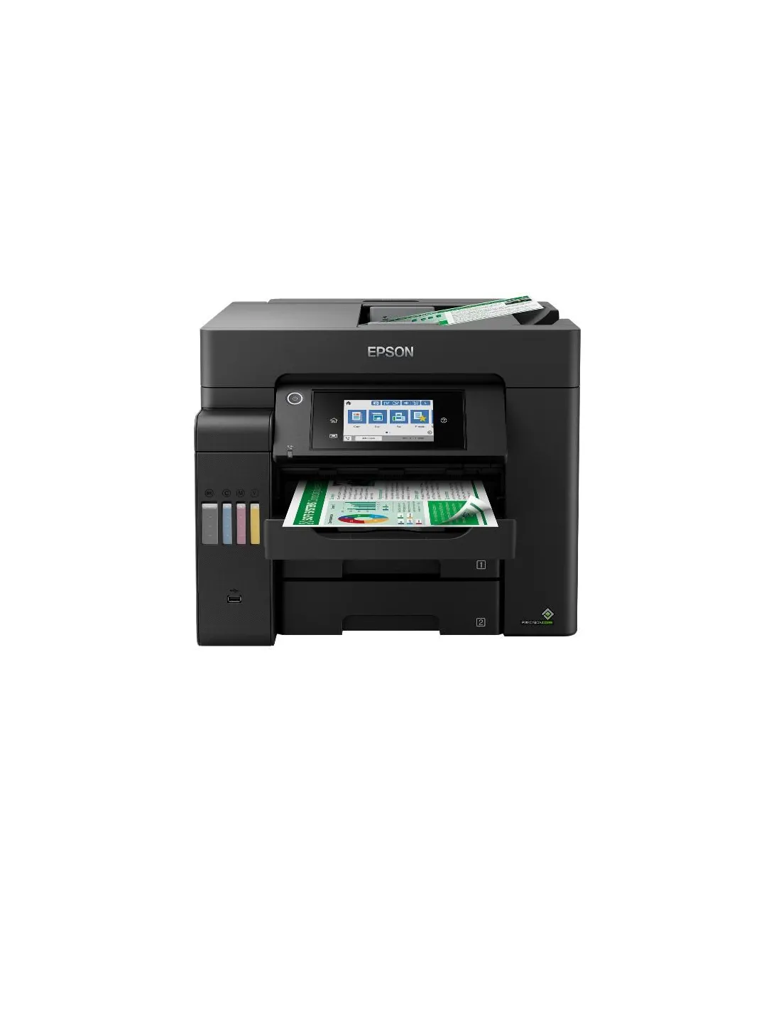 Con le funzioni di stampa, scansione, copia e fax, questa stampante EcoTank è intuitiva e assicura un bassissimo costo pagina. L’ampia capacità di caricamento della carta è garantita dai due vassoi frontali da 250 fogli e dall’alimentatore posteriore da 50 fogli; l’ADF in A4 contiene fino a 50 fogli. I documenti in A4 possono essere gestiti rapidamente grazie all’elevata velocità di stampa e scansione. Stampa in tutta comodità con la stampa da mobile, con la connettività di rete Wi-Fi ed Ethernet, e grazie al display touch-screen da 10,9 cm.