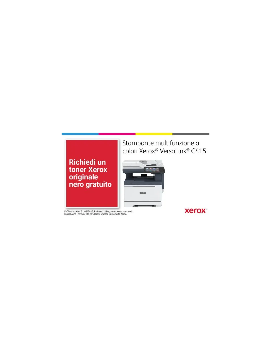 Stampante multifunzione a colori Xerox VersaLink C415:Produttività, affidabilità e sicurezza senza compromessi Il tuo lavoro continua a richiedere di più: maggiore mobilità, maggiore sicurezzae modi più semplici per fare di più. Ecco perché le funzionalità di livello superiore sono fornite di serie con la stampante multifunzione a colori (MFP) Xerox® VersaLink® C415. Dotata dell'avanzata tecnologia Xerox® ConnectKey®, questa moderna stampante multifunzione è pronta per qualsiasi cosa, oggi o domani.