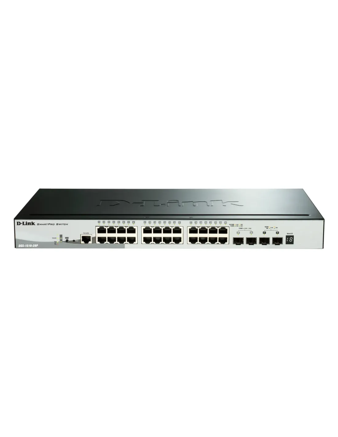 D-Link DGS-1510-28P. Tipo interruttore: Gestito, Livello del commutatore: L3. Tipo di porte RJ-45: Gigabit Ethernet (10/100/1000), Quantità di porte RJ-45: 24. Full duplex. Dimensioni tavola MAC: 16000 voci, Capacità di commutazione: 92 Gbit/s. Standard di rete: IEEE 802.1D, IEEE 802.1p, IEEE 802.1s, IEEE 802.1w, IEEE 802.1x, IEEE 802.3, IEEE 802.3ab, IEEE.... Connettore di alimentazione: Jack DC-ingresso. Supporto Power over Ethernet (PoE). Montaggio rack