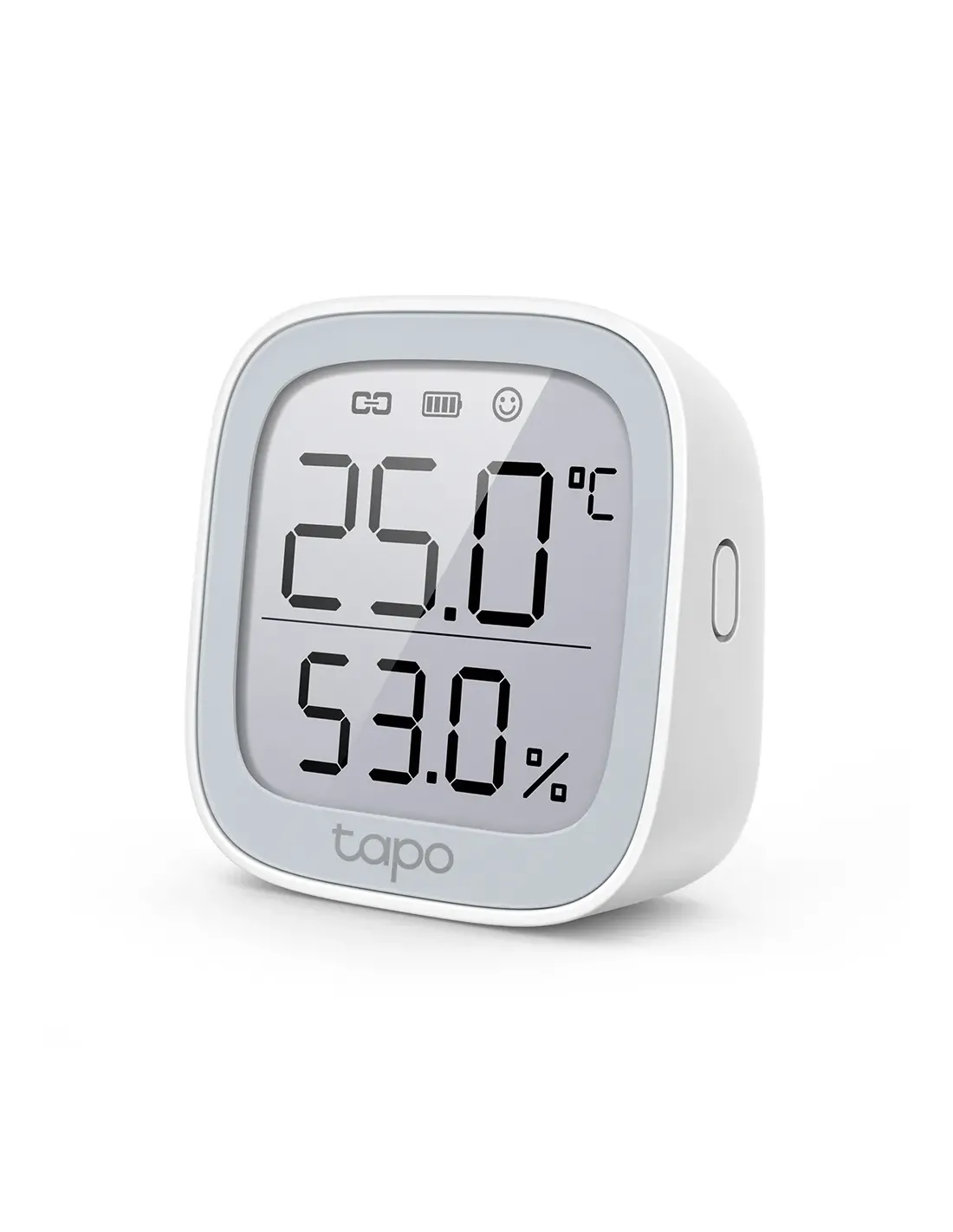 TP-Link Tapo T315. Utilizzo: Interno, Tipo sensore: Temperature & humidity sensor, Tipo: Libera installazione. Tipo batteria: AAA/LR03, Tecnologia batteria: Alcalino, Voltaggio della batteria: 3 V. Larghezza: 62 mm, Profondità: 62 mm, Altezza: 24,5 mm. Larghezza imballo: 65 mm, Profondità imballo: 77 mm, Altezza imballo: 30 mm. Contenuto della confezione: Tapo T315 × 1 AAA/LR03 battery × 2 3M Adhesive × 1 Quick Start Guide × 1