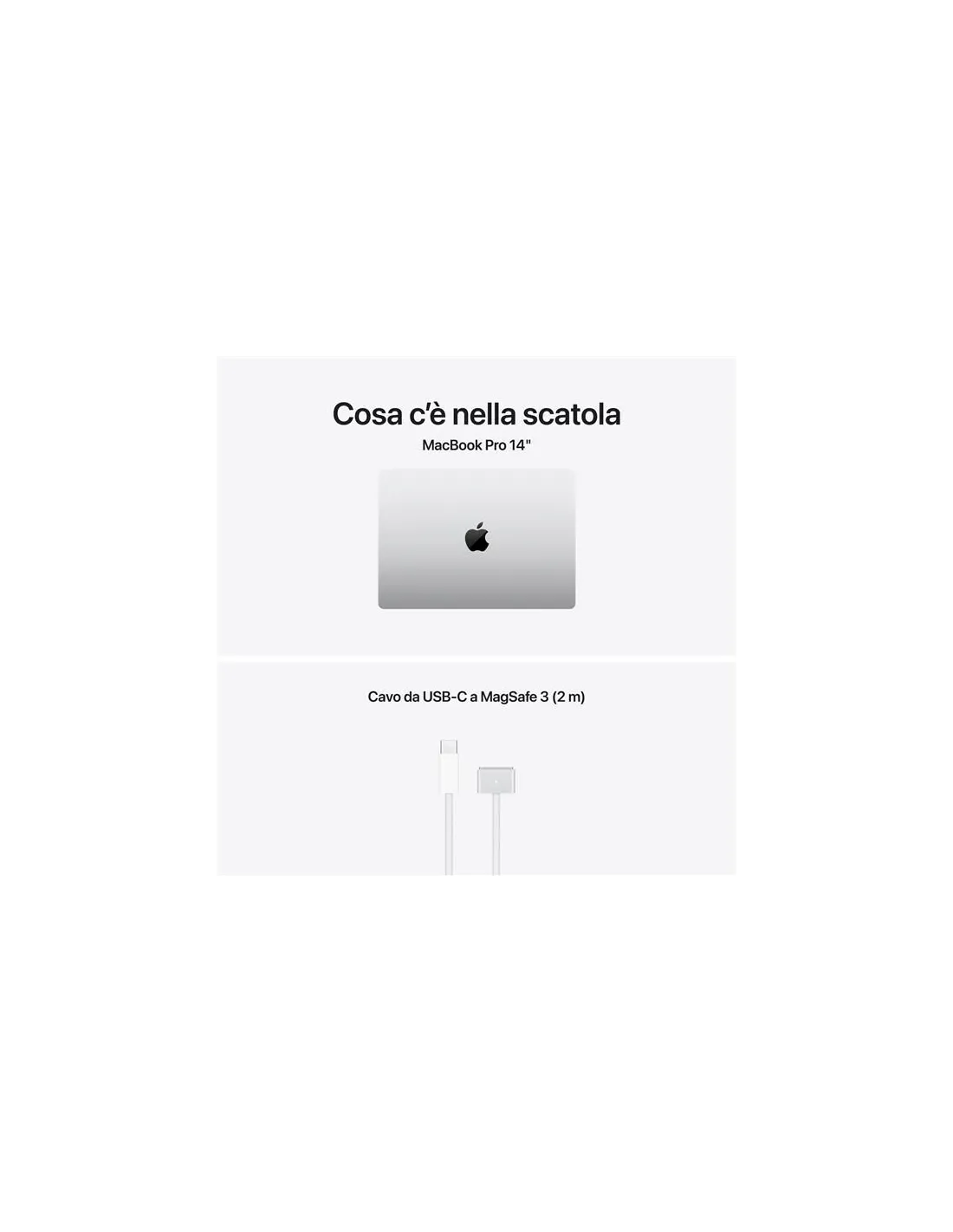 Apple MacBook Pro 14" Chip M5 10-core CPU 10-core GPU, 24GB, 1TB SSD ArgentoMacBook Pro 14". Con i superpoteri di M5.MacBook Pro 14" con chip M5 ti offre una velocità eccezionale e una potente AI on device per lavorare, creare e fare tutto ciò che ami. Ha fino a 24 ore di autonomia e un display Liquid Retina XDR.Caratteristiche principali- CON I SUPERPOTERI DI M5 – Oltre a una CPU e una memoria più veloci, il chip M5 ha una GPU più potente con un Neural Accelerator in ogni core, per mettere il turbo quando si usa l’AI. Così puoi sfrecciare a velocità incredibili anche nei lavori più complessi.- PROGETTATO PER APPLE INTELLIGENCE – Apple Intelligence è il sistema di intelligenza personale che rende più facile scrivere, creare e fare tutto ciò che vuoi. E grazie a una protezione totale della privacy, hai la certezza che nessuno potrà accedere ai tuoi dati, nemmeno Apple.- FINO A 24 ORE DI BATTERIA – MacBook Pro 14" ti dà performance incredibili costantemente, anche quando non è collegato alla corrente.- I CHIP APPLE METTONO IL TURBO ALLE APP – Tutti i tuoi programmi preferiti, da Microsoft 365 a Adobe Creative Cloud, vanno a tutta velocità su macOS.- SE AMI IL TUO IPHONE, AMERAI ANCHE IL MAC – Il Mac funziona in perfetta sintonia con gli altri dispositivi Apple. Puoi fare copia e incolla dall’iPhone al Mac. E anche usare il computer per inviare messaggi di testo o fare e ricevere chiamate FaceTime.- BRILLANTE DISPLAY PRO – Il display Liquid Retina XDR da 14,2" ha 1600 nit di luminosità di picco, fino a 1000 nit di luminosità costante e un contrasto di 1.000.000:1.- VIDEOCAMERA E AUDIO EVOLUTI – La videocamera Center Stage da 12MP ti tiene sempre al centro della scena, mentre i tre microfoni di livello professionale e i sei altoparlanti con audio spaziale e supporto per Dolby Atmos garantiscono un sonoro ottimale.- SI CONNETTE A TUTTO – Questo MacBook Pro ha tre porte Thunderbolt 4 e una porta MagSafe 3 per la ricarica, uno slot SDXC card, una porta HDMI e un jack per le cuffie. E ti permette di collegare fino a due monitor esterni.- PRIVACY E SICUREZZA SONO DI SERIE – Ogni Mac è dotato di robuste protezioni contro virus e malware. Se perdi il tuo Mac o ti viene rubato, l’app Dov’è può aiutarti a ritrovarlo. FileVault si assicura che i tuoi file siano protetti dalla crittografia, così solo tu puoi accedere. E gli aggiornamenti di sicurezza gratuiti contribuiscono a proteggerlo ancora di più.Sono forti e vanno forte.M5 si aggiunge a M4 Pro e M4 Max formando una squadra straordinaria: sono i tre chip più evoluti mai progettati per un portatile professionale. Con le fenomenali prestazioni della CPU single-thread e multi-thread e una memoria unificata più rapida, questi chip ti danno una velocità che sfiora l’impossibile. E grazie ai potenti Neural Accelerator di M5, sfrecci anche nelle attività che usano l’intelligenza artificiale.Fino a 6 volte più veloce con l’AI rispetto a M1Nel chip M5 ogni core della GPU ha un Neural Accelerator, per mettere il turbo all’intelligenza artificiale, per esempio durante la generazione di immagini con modelli di diffusione o nell’elaborazione dei prompt dei modelli linguistici di grandi dimensioni (LLM). E grazie al Neural Engine 16-core, base portante di Apple Intelligence, l’AI on-device è più potente e consuma meno batteria.M5Con M5, chi studia, lavora o ha voglia di creare può contare su una velocità eccezionale e su potenti funzioni AI on-device.Mac fa volare le app con AI.Ottimizzato per gestire app all’avanguardia nell’uso dell’intelligenza artificiale, Mac spinge al massimo programmi come DiffusionBee per la generazione di immagini, come Msty AI e LM Studio per i modelli LLM, e come Topaz Video per l’ottimizzazione video.Strumenti di AI nelle app: la magia è su Mac.Trasforma le registrazioni vocali grazie a plug-in basati sull’AI come MicDrop per Logic Pro. E ritocca le immagini apportando in pochi secondi modifiche complesse con il Riempimento generativo di Adobe Photoshop.Apple Intelligence, al tuo servizio.Con Apple Intelligence scrivere, creare e fare tutto ciò che vuoi diventa più facile. Trasforma una nota preparata al volo in un annuncio impeccabile. Elimina gli elementi di distrazione dalle foto con lo strumento Ripulisci. Crea immagini sfruttando i nuovi stili di ChatGPT su Image Playground. E usa le azioni intelligenti nell’app Comandi Rapidi per costruirti le automazioni che preferisci: per esempio confrontare la trascrizione di un audio con gli appunti che hai preso ed estrarre informazioni da un PDF. Apple Intelligence è l’intelligenza artificiale pensata apposta per te.Batteria. Un giorno intero di autonomia. Molla la presa.MacBook Pro ha l’autonomia migliore di sempre su un Mac: fino a 24 ore. E con la ricarica rapida arrivi al 50% della carica in soli 30 minuti. Tutti i modelli mantengono lo stesso livello di prestazioni anche quando non sono collegati alla corrente, così puoi concentrarti sulle tue attività senza perdere tempo a cercare una presa.macOS Tahoe. Ha un’altra faccia, ma il carattere rimane Mac.Il design con Liquid Glass dà a macOS Tahoe un look rinnovato, ma l’esperienza è la stessa che ami e conosci già. Grazie ai nuovi modi per lavorare meglio, interagire all’istante con iPhone e sfruttare al massimo Apple Intelligence, questa è la versione di macOS più potente e bella di sempre.Liquid Glass, il look da fare tuo.Con il nuovo design, il display sembra ancora più ampio e hai più possibilità di personalizzazione. Scegli tra icone chiare e scure, o prova l’elegante look trasparente.Spotlight passa subito all’azione.Con Spotlight puoi fare di tutto senza dover alzare un dito dalla tastiera: inviare un messaggio, eliminare una nota e tanto altro.“Traduzione in tempo reale” parla la tua linguaUsa questa funzione per tradurre automaticamente i testi nell’app Messaggi.Comandi rapidi. Come per magia.Velocizza il lavoro c