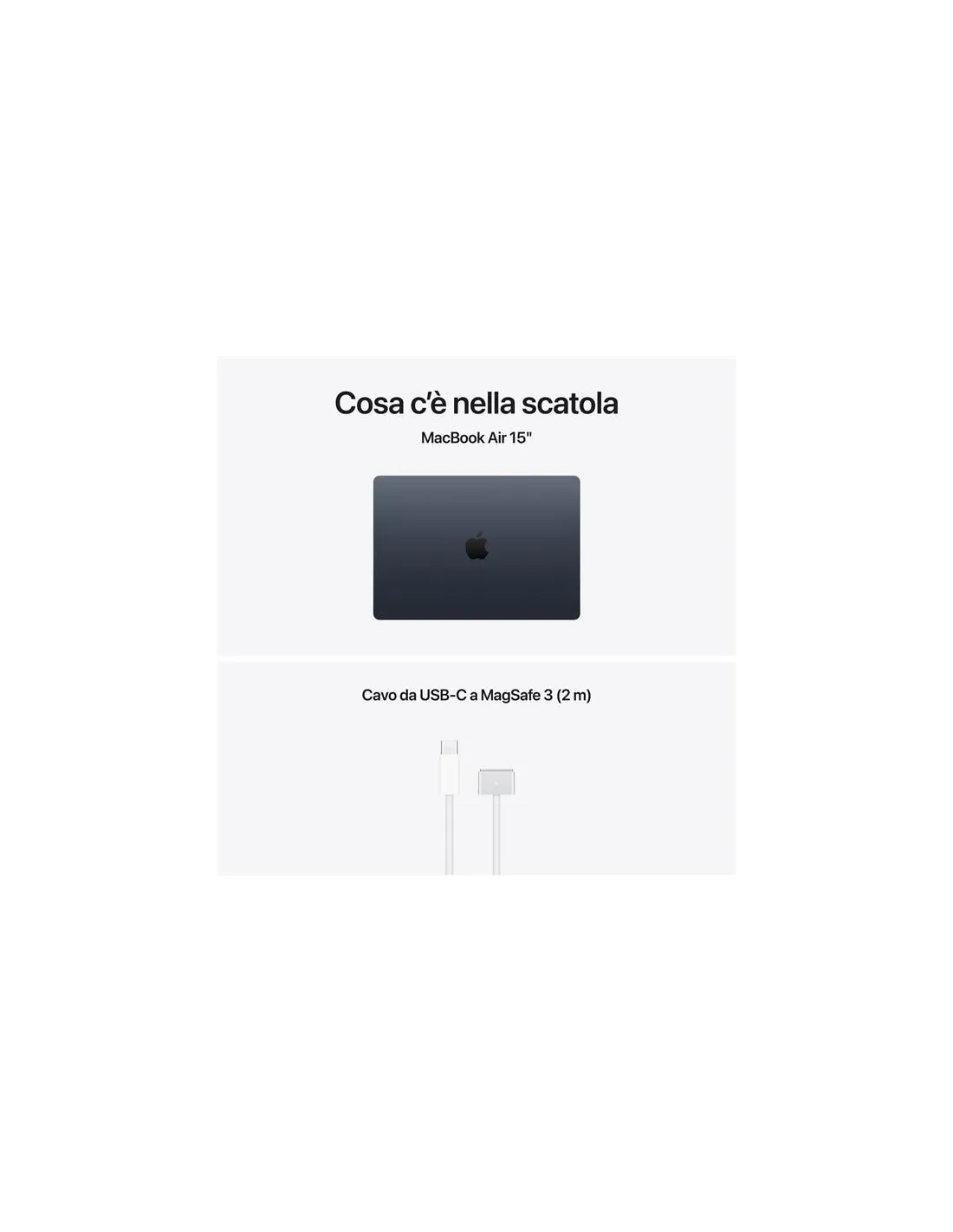 Apple MacBook Air 15" M5 chip 10-core CPU 10-core GPU, 24GB, 1TB SSD - MezzanotteMacBook Air 15". La potenza vola alto.MacBook Air con chip M5 offre prestazioni fulminee e potenti funzioni AI in un design incredibilmente portatile. Ha Apple Intelligence, fino a 18 ore di autonomia, e un’archiviazione SSD veloce che parte da 512GB, così puoi lavorare, creare e giocare ovunque le tue giornate ti portino.Caratteristiche principali- CON I SUPERPOTERI DI M5 — Con CPU e memoria unificata più veloci, il chip M5 ti dà prestazioni ancora migliori e più fluidità quando ti muovi tra le app, così tutto fila che è un piacere, dal multitasking ai flussi di lavoro creativi. Il potente Neural Engine e la GPU di nuova generazione con Neural Accelerator ti offrono una piattaforma straordinaria per l’AI.- APPLE INTELLIGENCE — Apple Intelligence è il sistema di intelligenza personale che rende più facile scrivere, creare e fare tutto ciò che vuoi. E grazie a funzioni di ultima generazione per la tutela della privacy, hai la certezza che nessuno potrà accedere ai tuoi dati, nemmeno Apple.- FINO A 18 ORE DI AUTONOMIA — MacBook Air ha un’autonomia incredibile con prestazioni straordinarie, così puoi affrontare un’intera giornata di lavoro o studio senza preoccuparti di ricaricare.- BRILLANTE DISPLAY DA 15,3" — Il display Liquid Retina supporta un miliardo di colori. Grazie all’elevato contrasto e alla nitidezza dei dettagli, foto e video sembrano saltar fuori dallo schermo. E anche il testo è ultradefinito.- VIDEOCAMERA CENTER STAGE DA 12MP — La funzione Inquadratura automatica ti tiene al centro della scena durante le videochiamate, e con Panoramica Scrivania puoi condividere una vista dall’alto del tuo spazio di lavoro. Anche l’audio è spettacolare, grazie ai tre microfoni in array e al sistema a sei altoparlanti con audio spaziale e supporto per Dolby Atmos.- SI CONNETTE A TUTTO — MacBook Air ha due porte Thunderbolt 4, una porta di ricarica MagSafe e un jack per cuffie, oltre al chip Apple N1 wireless per il Wi Fi 7 e il Bluetooth 6. E ti permette di collegare fino a due monitor esterni.- MACOS METTE IL TURBO ALLE APP — Le tue app preferite, anche quelle incluse come FaceTime e Messaggi, vanno a tutta velocità su macOS. E grazie alla protezione integrata contro i virus e agli aggiornamenti software gratuiti, il tuo Mac resta sempre efficiente e sicuro.- TI PIACE L’IPHONE? ANCHE IL MAC TI CONQUISTERÀ – Il Mac funziona in perfetta sintonia con gli altri dispositivi Apple. Puoi fare copia e incolla dall’iPhone al Mac, e anche usare il Mac per inviare messaggi di testo o fare e ricevere chiamate FaceTime.- ALIMENTATORI – N.B. MacBook Air (15") include un cavo di ricarica da USB C a MagSafe 3 senza alimentatore. Per ricaricare questo dispositivo è necessario un alimentatore USB C o un’altra fonte di alimentazione USB PD da almeno 35W. Per una ricarica ottimale, Apple consiglia l’alimentatore Apple da 35W a doppia porta USB C, oppure l’alimentatore USB C Apple da 70W per sfruttare la ricarica rapida (fino al 50% di carica in 35 minuti).Fatto per fare strada.Con soli 1,23 kg di peso e uno spessore di poco più di un centimetro, MacBook Air è perfetto per infilarsi comodamente nella tua borsa e accompagnarti dovunque. È fatto per oltre il 50% di materiali riciclati e anche il robusto guscio, pensato per resistere all’uso quotidiano, è in alluminio riciclato.M5. Una scheggia.AI a tutta velocità. MacBook Air offre prestazioni AI ultrarapide grazie alla potente combinazione di GPU, Neural Engine e memoria unificata del chip M5. E con un Neural Accelerator integrato in ogni core della GPU, le attività AI sono ancora più efficienti: dall’upscaling di immagini con AI all’esecuzione dei più recenti modelli linguistici di grandi dimensioni, potrai raggiungere livelli di produttività e creatività senza precedenti.