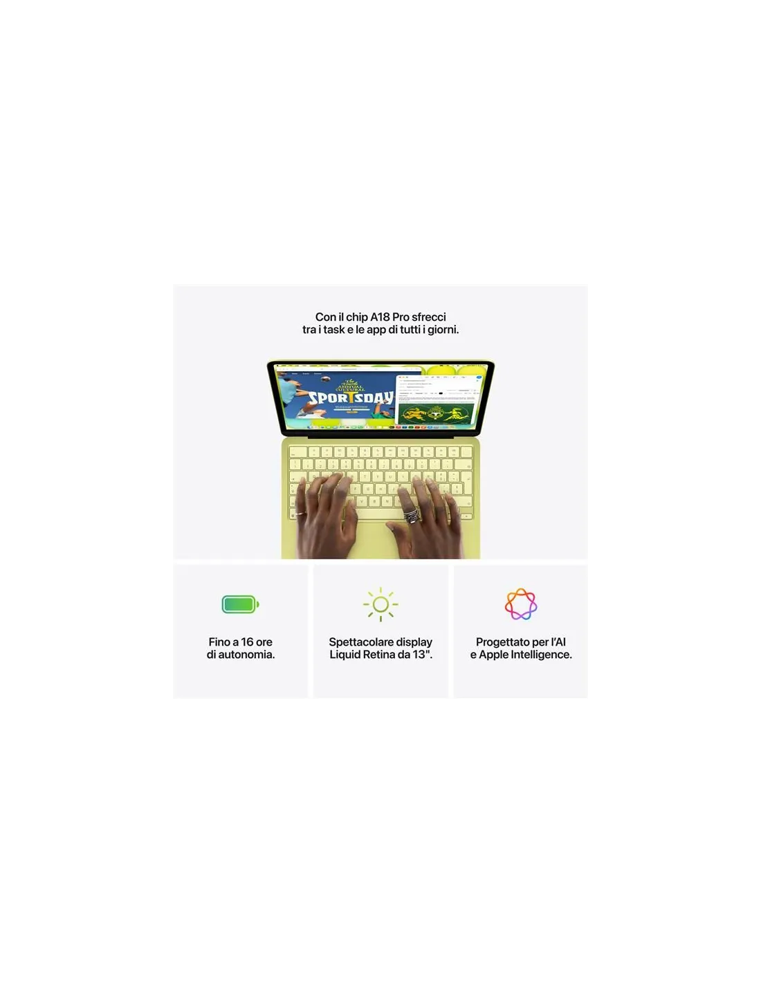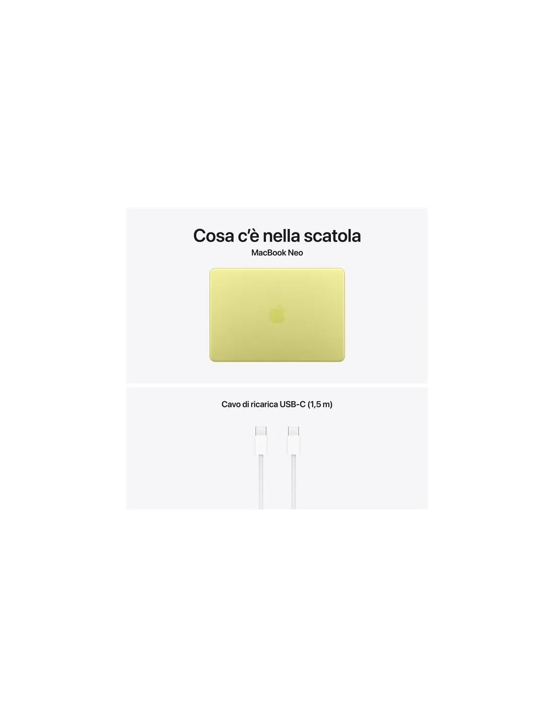 Apple MacBook Neo 13"A18 Pro chip 6-core CPU 5-core GPU 8GB 512GB SSD Touch ID - Giallo agrumeMacBook Neo. Un Mac eccezionale. A un prezzo che non ti aspetti.Pronto ad affrontare ogni giornata insieme a te, MacBook Neo sfreccia tra i task e le app di tutti i giorni. Ha un robusto design in alluminio in quattro splendidi colori, uno spettacolare display Liquid Retina da 13", il chip A18 Pro progettato per l’AI e Apple Intelligence, e fino a 16 ore di autonomia. È un Mac eccezionale, a un prezzo che non ti aspetti.Caratteristiche principali- LA LINEA DI MACBOOK PIÙ VARIOPINTA DI SEMPRE – Scegli tra argento, rosa pastello, giallo agrume e indaco: ciascuno con tastiera in tinta per creare un look coordinato. E grazie al suo robusto design in alluminio, MacBook Neo ti segue ovunque.- PRESTAZIONI PER LE ATTIVITÀ QUOTIDIANE – Sin da subito, MacBook Neo con il chip A18 Pro offre performance e funzioni AI che ti aiutano a fare tutto in scioltezza: ritoccare le foto di famiglia, lavorare con i fogli di calcolo, riassumere gli appunti delle lezioni con l’AI, o lanciarti nell’ultimo gioco di Apple Arcade.- FINO A 16 ORE DI AUTONOMIA – Con una batteria che dura una giornata intera, MacBook Neo è pronto a seguirti nelle tue attività quotidiane e negli studi, dalle lezioni del mattino alle maratone notturne prima dell’esame.- SPETTACOLARE DISPLAY DA 13" — Lo splendido display Liquid Retina è una gioia per gli occhi. Con una risoluzione di 2408×1506 pixel, fino a 500 nit di luminosità e il supporto per un miliardo di colori, le immagini sono brillanti e il testo nitidissimo.- FATTI VEDERE E SENTIRE ALLA GRANDE — MacBook Neo ha una videocamera FaceTime HD a 1080p, due microfoni in array che rendono più chiara la tua voce durante le chiamate, e due altoparlanti a diffusione laterale con audio spaziale per offrirti un suono avvolgente.- PROGETTATO PER L’AI – Il chip Apple e i suoi principali componenti sono progettati per gestire in modo efficiente le attività AI on device. Apple Intelligence rende più facile scrivere, creare e fare tutto ciò che vuoi, con funzioni di ultima generazione per la tutela della privacy.- MACOS METTE IL TURBO ALLE APP – Su macOS le tue app preferite vanno a tutta velocità, comprese quelle di serie come FaceTime e Messaggi.- SE AMI IL TUO IPHONE, AMERAI ANCHE IL MAC – Il Mac funziona in perfetta sintonia con gli altri dispositivi Apple. Puoi copiare e incollare dall’iPhone al Mac, e usare il Mac per inviare messaggi di testo o rispondere alle chiamate FaceTime.- PRIVACY E SICUREZZA — La protezione antivirus integrata e gli aggiornamenti software gratuiti aiutano a mantenere il tuo MacBook Neo sicuro e perfettamente efficiente. FileVault protegge i tuoi file con la crittografia, così solo tu potrai accedervi. Se perdi il tuo Mac o ti viene rubato, l’app Dov’è può aiutarti a ritrovarlo. Sul modello di MacBook Neo con tasto Blocco, ti basta premerlo per riattivare e bloccare lo schermo e accendere o spegnere il Mac. E sul modello con Touch ID, puoi usare la tua impronta digitale per sbloccare il Mac, autorizzare i pagamenti, e accedere alle app e ai siti web.- ALIMENTATORI – N.B. MacBook Neo include un cavo di ricarica USB C senza alimentatore. Per ricaricare questo dispositivo è necessario un alimentatore USB C o un’altra fonte di alimentazione USB PD da almeno 20W. Per una ricarica ottimale, Apple consiglia l’alimentatore USB C Apple da 20W.Un colpo di fulmine.Questo è MacBook Neo, un Mac eccezionale a un prezzo che non ti aspetti. Con un design robusto, splendidi colori e potenti funzioni, ha tutto per farti scoprire la magia di Mac ogni giorno. Dai il benvenuto all’ultimo arrivato in famiglia.La sua potenza è la tua forza.Il chip A18 Pro è un gran tuttofare: puoi usare le tue app preferite, svolgere in scioltezza le attività di ogni giorno, scatenare la creatività e lanciarti nei giochi più pazzeschi. Ovunque ti porti la tua giornata, hai la velocità che serve per tenere il passo delle idee.