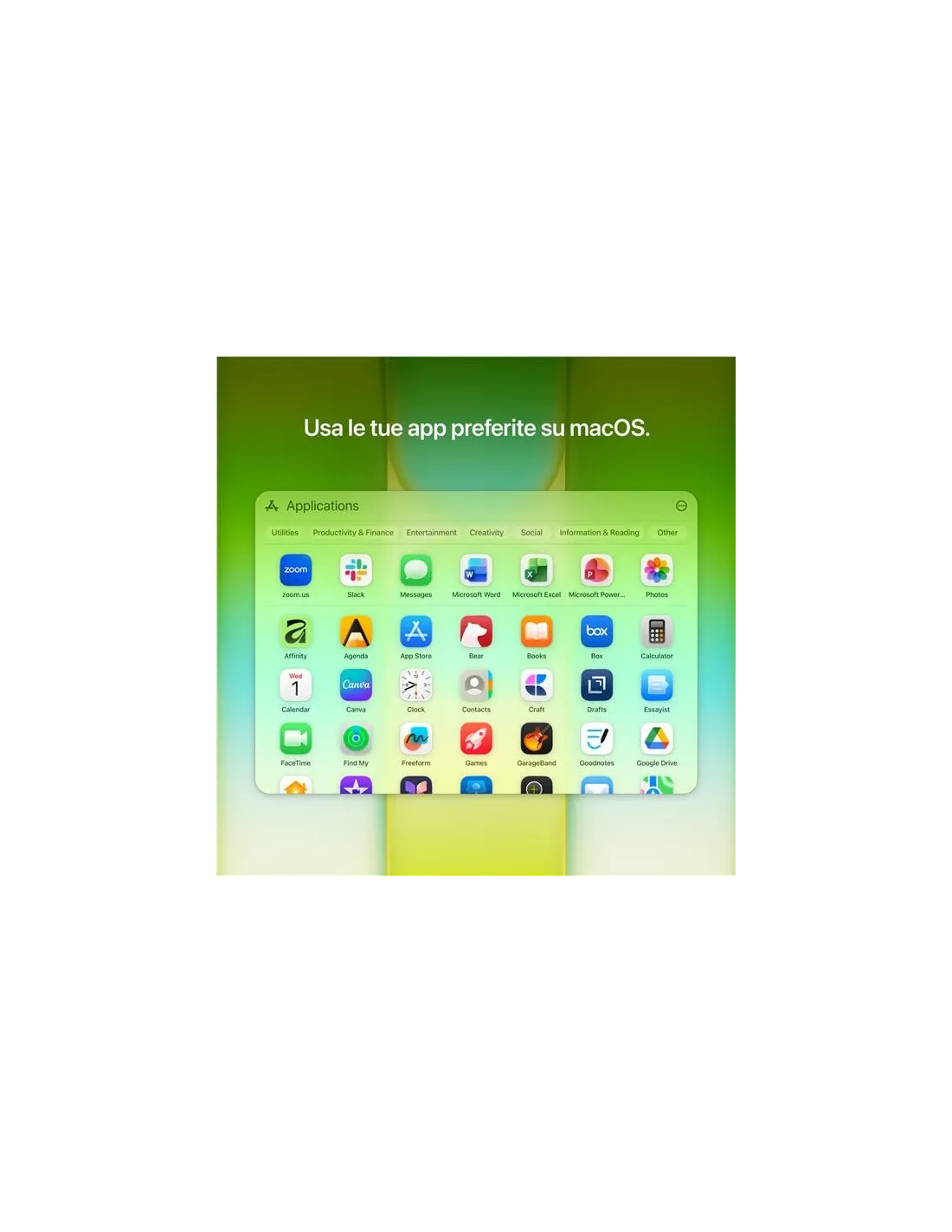 Sfreccia tra i task di tutti i giorni. Il chip A18 Pro è l’unione perfetta tra prestazioni ed efficienza, per far volare le tue app preferite e svolgere attività AI in scioltezza.Il trionfo dei sensi.Foto e video sembrano prendere vita grazie al grande contrasto e alla nitidezza dei dettagli. Il testo è ben definito per una lettura confortevole. E i due altoparlanti a diffusione laterale ti avvolgono con un suono bello pieno.Da detto a fatto.Le app e gli strumenti di intelligenza artificiale che usi di più, come ChatGPT e Canva, girano che è una bellezza su MacBook Neo. Con un’esperienza AI così fluida e versatile, il tuo lavoro e le tue passioni si aprono a nuovi orizzonti.Progettato per Apple Intelligence.Apple Intelligence è il sistema di intelligenza personale che rende più facile scrivere, creare e fare tutto ciò che vuoi. Ed è già integrata in MacBook Neo.