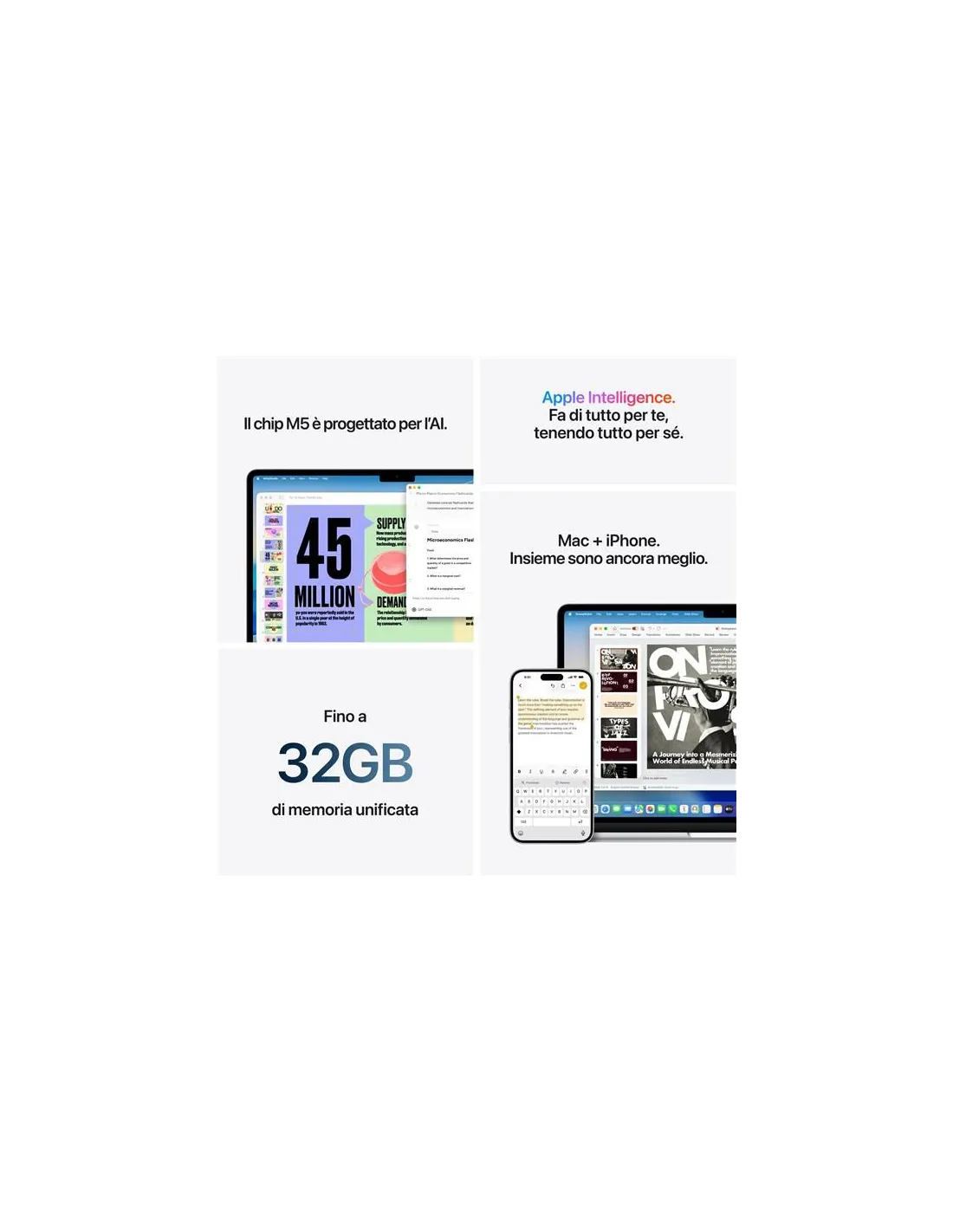 - CON I SUPERPOTERI DI M5 — Con CPU e memoria unificata più veloci, il chip M5 ti dà prestazioni ancora migliori e più fluidità quando ti muovi tra le app, così tutto fila che è un piacere, dal multitasking ai flussi di lavoro creativi. Il potente Neural Engine e la GPU di nuova generazione con Neural Accelerator ti offrono una piattaforma straordinaria per l’AI.