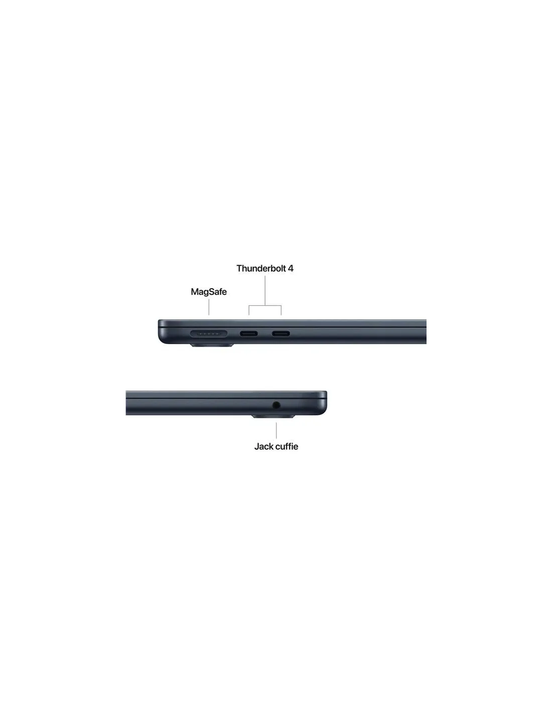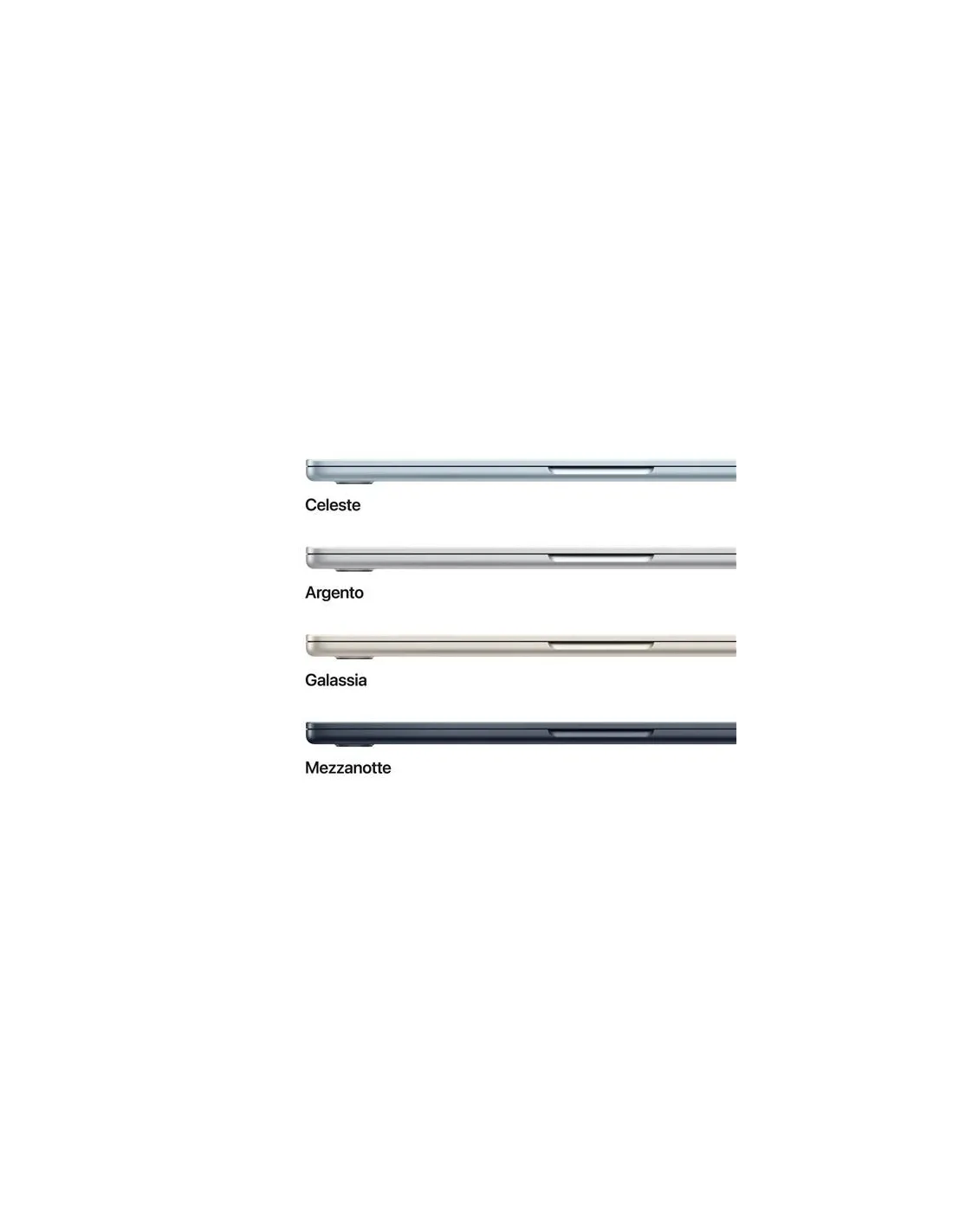 Apple MacBook Air 13" M5 chip 10-core CPU 8-core GPU, 16GB, 512GB SSD - MezzanotteMacBook Air 13". La potenza vola alto.MacBook Air con chip M5 offre prestazioni fulminee e potenti funzioni AI in un design incredibilmente portatile. Ha Apple Intelligence, fino a 18 ore di autonomia, e un’archiviazione SSD veloce che parte da 512GB, così puoi lavorare, creare e giocare ovunque le tue giornate ti portino.Caratteristiche principali - CON I SUPERPOTERI DI M5 — Con CPU e memoria unificata più veloci, il chip M5 ti dà prestazioni ancora migliori e più fluidità quando ti muovi tra le app, così tutto fila che è un piacere, dal multitasking ai flussi di lavoro creativi. Il potente Neural Engine e la GPU di nuova generazione con Neural Accelerator ti offrono una piattaforma straordinaria per l’AI.- APPLE INTELLIGENCE — Apple Intelligence è il sistema di intelligenza personale che rende più facile scrivere, creare e fare tutto ciò che vuoi. E grazie a funzioni di ultima generazione per la tutela della privacy, hai la certezza che nessuno potrà accedere ai tuoi dati, nemmeno Apple.- FINO A 18 ORE DI AUTONOMIA — MacBook Air ha un’autonomia incredibile con prestazioni straordinarie, così puoi affrontare un’intera giornata di lavoro o studio senza preoccuparti di ricaricare.- BRILLANTE DISPLAY DA 13,6" — Il display Liquid Retina supporta un miliardo di colori. Grazie all’elevato contrasto e alla nitidezza dei dettagli, foto e video sembrano saltar fuori dallo schermo. E anche il testo è ultradefinito.- VIDEOCAMERA CENTER STAGE DA 12MP — La funzione Inquadratura automatica ti tiene al centro della scena durante le videochiamate, e con Panoramica Scrivania puoi condividere una vista dall’alto del tuo spazio di lavoro. Anche l’audio è spettacolare, grazie ai tre microfoni in array e al sistema a quattro altoparlanti con audio spaziale e supporto per Dolby Atmos.- SI CONNETTE A TUTTO — MacBook Air ha due porte Thunderbolt 4, una porta di ricarica MagSafe e un jack per cuffie, oltre al chip Apple N1 wireless per il Wi Fi 7 e il Bluetooth 6. E ti permette di collegare fino a due monitor esterni.- MACOS METTE IL TURBO ALLE APP — Le tue app preferite, anche quelle incluse come FaceTime e Messaggi, vanno a tutta velocità su macOS. E grazie alla protezione integrata contro i virus e agli aggiornamenti software gratuiti, il tuo Mac resta sempre efficiente e sicuro.- TI PIACE L’IPHONE? ANCHE IL MAC TI CONQUISTERÀ – Il Mac funziona in perfetta sintonia con gli altri dispositivi Apple. Puoi fare copia e incolla dall’iPhone al Mac, e anche usare il Mac per inviare messaggi di testo o fare e ricevere chiamate FaceTime. - ALIMENTATORI – N.B. MacBook Air (13") include un cavo di ricarica da USB C a MagSafe 3 senza alimentatore. Per ricaricare questo dispositivo è necessario un alimentatore USB C o un’altra fonte di alimentazione USB PD da almeno 30W. Per una ricarica ottimale, Apple consiglia l’alimentatore USB C Apple da 30W, oppure l’alimentatore USB C Apple da 70W per sfruttare la ricarica rapida (fino al 50% di carica in 30 minuti).Fatto per fare strada.Con soli 1,23 kg di peso e uno spessore di poco più di un centimetro, MacBook Air è perfetto per infilarsi comodamente nella tua borsa e accompagnarti dovunque. È fatto per oltre il 50% di materiali riciclati e anche il robusto guscio, pensato per resistere all’uso quotidiano, è in alluminio riciclato.M5. Una scheggia.AI a tutta velocità. MacBook Air offre prestazioni AI ultrarapide grazie alla potente combinazione di GPU, Neural Engine e memoria unificata del chip M5. E con un Neural Accelerator integrato in ogni core della GPU, le attività AI sono ancora più efficienti: dall’upscaling di immagini con AI all’esecuzione dei più recenti modelli linguistici di grandi dimensioni, potrai raggiungere livelli di produttività e creatività senza precedenti.