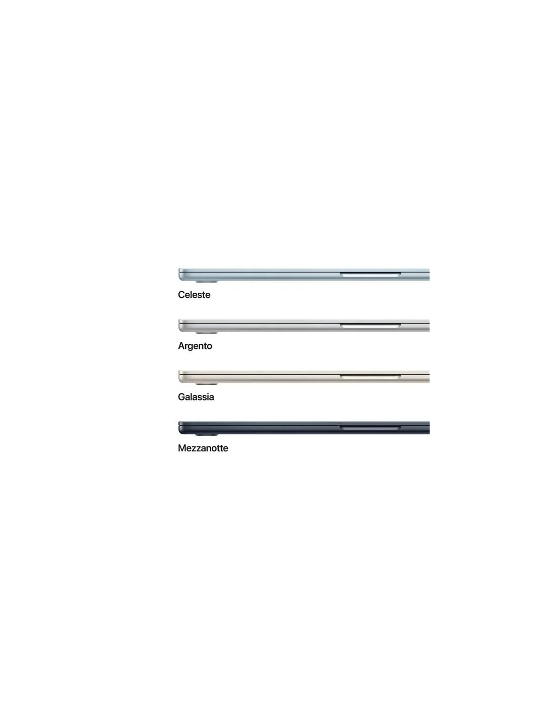 Apple MacBook Air 15" M5 chip 10-core CPU 10-core GPU, 16GB, 512GB SSD - GalassiaMacBook Air 15". La potenza vola alto.MacBook Air con chip M5 offre prestazioni fulminee e potenti funzioni AI in un design incredibilmente portatile. Ha Apple Intelligence, fino a 18 ore di autonomia, e un’archiviazione SSD veloce che parte da 512GB, così puoi lavorare, creare e giocare ovunque le tue giornate ti portino.Caratteristiche principali- CON I SUPERPOTERI DI M5 — Con CPU e memoria unificata più veloci, il chip M5 ti dà prestazioni ancora migliori e più fluidità quando ti muovi tra le app, così tutto fila che è un piacere, dal multitasking ai flussi di lavoro creativi. Il potente Neural Engine e la GPU di nuova generazione con Neural Accelerator ti offrono una piattaforma straordinaria per l’AI.- APPLE INTELLIGENCE — Apple Intelligence è il sistema di intelligenza personale che rende più facile scrivere, creare e fare tutto ciò che vuoi. E grazie a funzioni di ultima generazione per la tutela della privacy, hai la certezza che nessuno potrà accedere ai tuoi dati, nemmeno Apple.- FINO A 18 ORE DI AUTONOMIA — MacBook Air ha un’autonomia incredibile con prestazioni straordinarie, così puoi affrontare un’intera giornata di lavoro o studio senza preoccuparti di ricaricare.- BRILLANTE DISPLAY DA 15,3" — Il display Liquid Retina supporta un miliardo di colori. Grazie all’elevato contrasto e alla nitidezza dei dettagli, foto e video sembrano saltar fuori dallo schermo. E anche il testo è ultradefinito.- VIDEOCAMERA CENTER STAGE DA 12MP — La funzione Inquadratura automatica ti tiene al centro della scena durante le videochiamate, e con Panoramica Scrivania puoi condividere una vista dall’alto del tuo spazio di lavoro. Anche l’audio è spettacolare, grazie ai tre microfoni in array e al sistema a sei altoparlanti con audio spaziale e supporto per Dolby Atmos.- SI CONNETTE A TUTTO — MacBook Air ha due porte Thunderbolt 4, una porta di ricarica MagSafe e un jack per cuffie, oltre al chip Apple N1 wireless per il Wi Fi 7 e il Bluetooth 6. E ti permette di collegare fino a due monitor esterni.- MACOS METTE IL TURBO ALLE APP — Le tue app preferite, anche quelle incluse come FaceTime e Messaggi, vanno a tutta velocità su macOS. E grazie alla protezione integrata contro i virus e agli aggiornamenti software gratuiti, il tuo Mac resta sempre efficiente e sicuro.- TI PIACE L’IPHONE? ANCHE IL MAC TI CONQUISTERÀ – Il Mac funziona in perfetta sintonia con gli altri dispositivi Apple. Puoi fare copia e incolla dall’iPhone al Mac, e anche usare il Mac per inviare messaggi di testo o fare e ricevere chiamate FaceTime.- ALIMENTATORI – N.B. MacBook Air (15") include un cavo di ricarica da USB C a MagSafe 3 senza alimentatore. Per ricaricare questo dispositivo è necessario un alimentatore USB C o un’altra fonte di alimentazione USB PD da almeno 35W. Per una ricarica ottimale, Apple consiglia l’alimentatore Apple da 35W a doppia porta USB C, oppure l’alimentatore USB C Apple da 70W per sfruttare la ricarica rapida (fino al 50% di carica in 35 minuti).Fatto per fare strada.Con soli 1,23 kg di peso e uno spessore di poco più di un centimetro, MacBook Air è perfetto per infilarsi comodamente nella tua borsa e accompagnarti dovunque. È fatto per oltre il 50% di materiali riciclati e anche il robusto guscio, pensato per resistere all’uso quotidiano, è in alluminio riciclato.M5. Una scheggia.AI a tutta velocità. MacBook Air offre prestazioni AI ultrarapide grazie alla potente combinazione di GPU, Neural Engine e memoria unificata del chip M5. E con un Neural Accelerator integrato in ogni core della GPU, le attività AI sono ancora più efficienti: dall’upscaling di immagini con AI all’esecuzione dei più recenti modelli linguistici di grandi dimensioni, potrai raggiungere livelli di produttività e creatività senza precedenti.