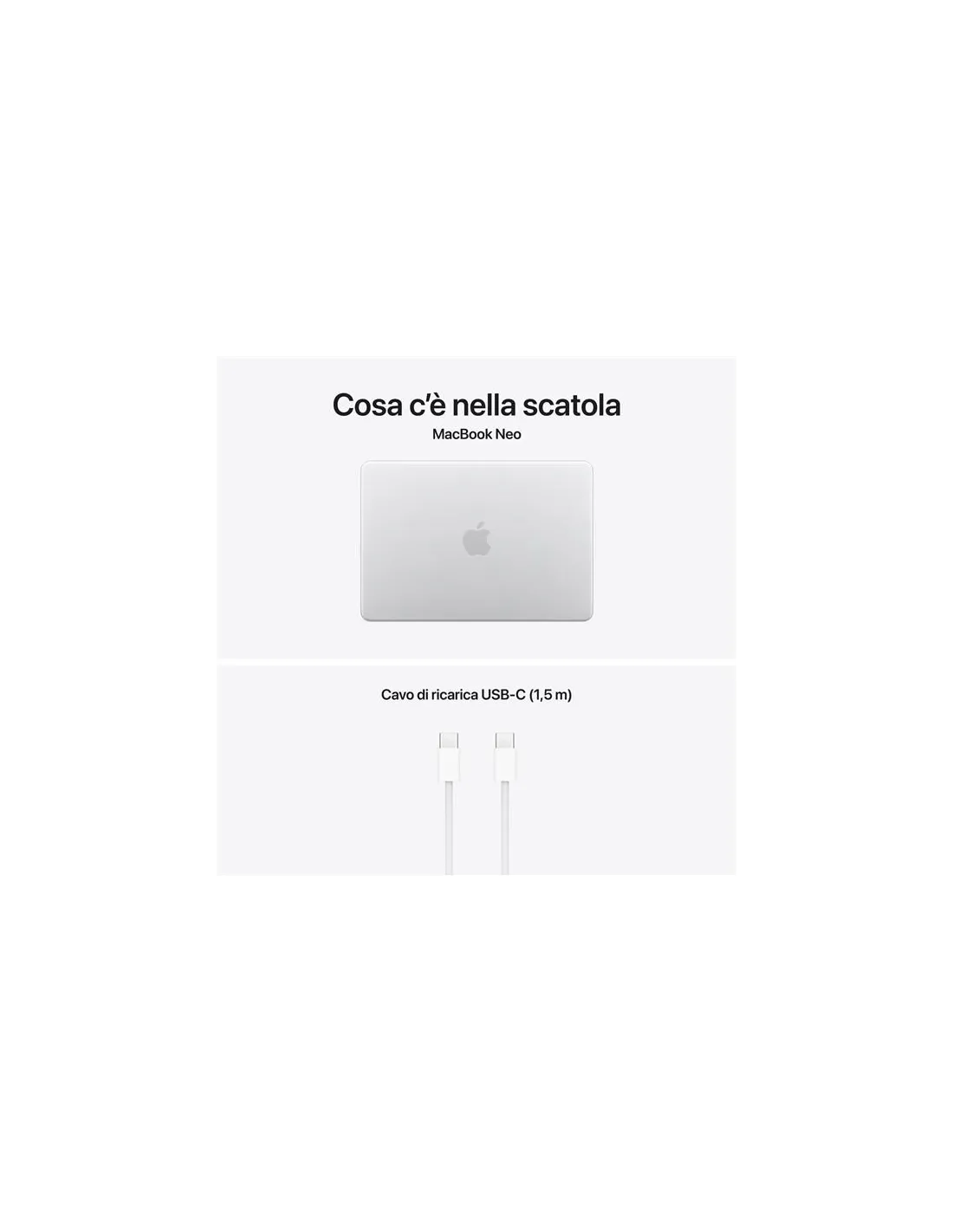 Apple MacBook Neo 13"A18 Pro chip 6-core CPU 5-core GPU 8GB 256GB SSD - ArgentoMacBook Neo. Un Mac eccezionale. A un prezzo che non ti aspetti.Pronto ad affrontare ogni giornata insieme a te, MacBook Neo sfreccia tra i task e le app di tutti i giorni. Ha un robusto design in alluminio in quattro splendidi colori, uno spettacolare display Liquid Retina da 13", il chip A18 Pro progettato per l’AI e Apple Intelligence, e fino a 16 ore di autonomia. È un Mac eccezionale, a un prezzo che non ti aspetti.Caratteristiche principali- LA LINEA DI MACBOOK PIÙ VARIOPINTA DI SEMPRE – Scegli tra argento, rosa pastello, giallo agrume e indaco: ciascuno con tastiera in tinta per creare un look coordinato. E grazie al suo robusto design in alluminio, MacBook Neo ti segue ovunque.- PRESTAZIONI PER LE ATTIVITÀ QUOTIDIANE – Sin da subito, MacBook Neo con il chip A18 Pro offre performance e funzioni AI che ti aiutano a fare tutto in scioltezza: ritoccare le foto di famiglia, lavorare con i fogli di calcolo, riassumere gli appunti delle lezioni con l’AI, o lanciarti nell’ultimo gioco di Apple Arcade.- FINO A 16 ORE DI AUTONOMIA – Con una batteria che dura una giornata intera, MacBook Neo è pronto a seguirti nelle tue attività quotidiane e negli studi, dalle lezioni del mattino alle maratone notturne prima dell’esame.- SPETTACOLARE DISPLAY DA 13" — Lo splendido display Liquid Retina è una gioia per gli occhi. Con una risoluzione di 2408×1506 pixel, fino a 500 nit di luminosità e il supporto per un miliardo di colori, le immagini sono brillanti e il testo nitidissimo.- FATTI VEDERE E SENTIRE ALLA GRANDE — MacBook Neo ha una videocamera FaceTime HD a 1080p, due microfoni in array che rendono più chiara la tua voce durante le chiamate, e due altoparlanti a diffusione laterale con audio spaziale per offrirti un suono avvolgente.- PROGETTATO PER L’AI – Il chip Apple e i suoi principali componenti sono progettati per gestire in modo efficiente le attività AI on device. Apple Intelligence rende più facile scrivere, creare e fare tutto ciò che vuoi, con funzioni di ultima generazione per la tutela della privacy.- MACOS METTE IL TURBO ALLE APP – Su macOS le tue app preferite vanno a tutta velocità, comprese quelle di serie come FaceTime e Messaggi.- SE AMI IL TUO IPHONE, AMERAI ANCHE IL MAC – Il Mac funziona in perfetta sintonia con gli altri dispositivi Apple. Puoi copiare e incollare dall’iPhone al Mac, e usare il Mac per inviare messaggi di testo o rispondere alle chiamate FaceTime.- PRIVACY E SICUREZZA — La protezione antivirus integrata e gli aggiornamenti software gratuiti aiutano a mantenere il tuo MacBook Neo sicuro e perfettamente efficiente. FileVault protegge i tuoi file con la crittografia, così solo tu potrai accedervi. Se perdi il tuo Mac o ti viene rubato, l’app Dov’è può aiutarti a ritrovarlo. Sul modello di MacBook Neo con tasto Blocco, ti basta premerlo per riattivare e bloccare lo schermo e accendere o spegnere il Mac. E sul modello con Touch ID, puoi usare la tua impronta digitale per sbloccare il Mac, autorizzare i pagamenti, e accedere alle app e ai siti web.- ALIMENTATORI – N.B. MacBook Neo include un cavo di ricarica USB C senza alimentatore. Per ricaricare questo dispositivo è necessario un alimentatore USB C o un’altra fonte di alimentazione USB PD da almeno 20W. Per una ricarica ottimale, Apple consiglia l’alimentatore USB C Apple da 20W.Un colpo di fulmine.Questo è MacBook Neo, un Mac eccezionale a un prezzo che non ti aspetti. Con un design robusto, splendidi colori e potenti funzioni, ha tutto per farti scoprire la magia di Mac ogni giorno. Dai il benvenuto all’ultimo arrivato in famiglia.La sua potenza è la tua forza.Il chip A18 Pro è un gran tuttofare: puoi usare le tue app preferite, svolgere in scioltezza le attività di ogni giorno, scatenare la creatività e lanciarti nei giochi più pazzeschi. Ovunque ti porti la tua giornata, hai la velocità che serve per tenere il passo delle idee.