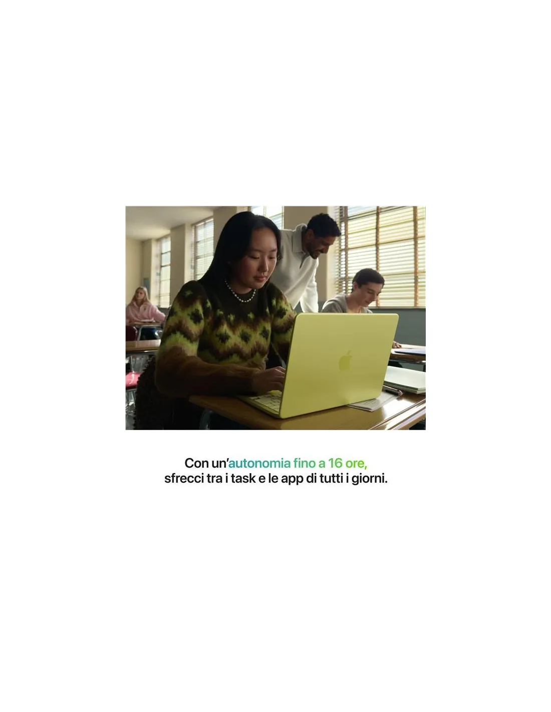 - FINO A 16 ORE DI AUTONOMIA – Con una batteria che dura una giornata intera, MacBook Neo è pronto a seguirti nelle tue attività quotidiane e negli studi, dalle lezioni del mattino alle maratone notturne prima dell’esame.