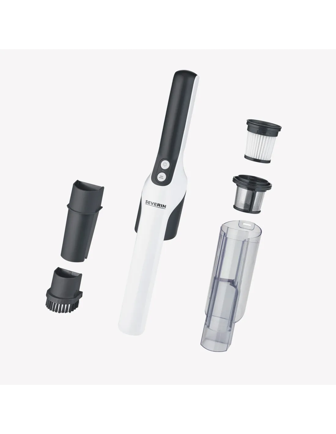 Severin HV 7140. Tipo di pulizia: Secco, Potenza motore: 120 W, Emissione acustica: 79 dB. Tipo di contenitore della polvere: Senza sacchetto, Colore del prodotto: Nero, Bianco, Capacità aspirazione solidi: 0,2 L. Lunghezza cavo: 1,7 m. Alimentazione: Batteria, Durata di funzionamento: 30 min, Tempo di ricarica: 4 h. Peso: 800 g, Larghezza: 80 mm, Profondità: 70 mm