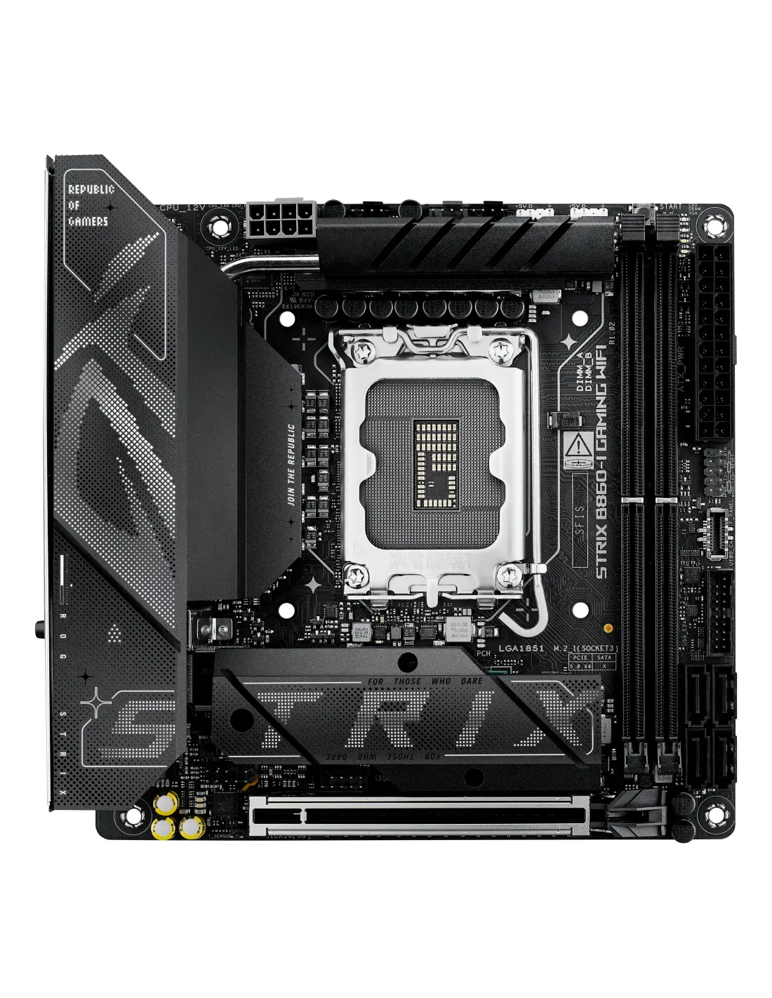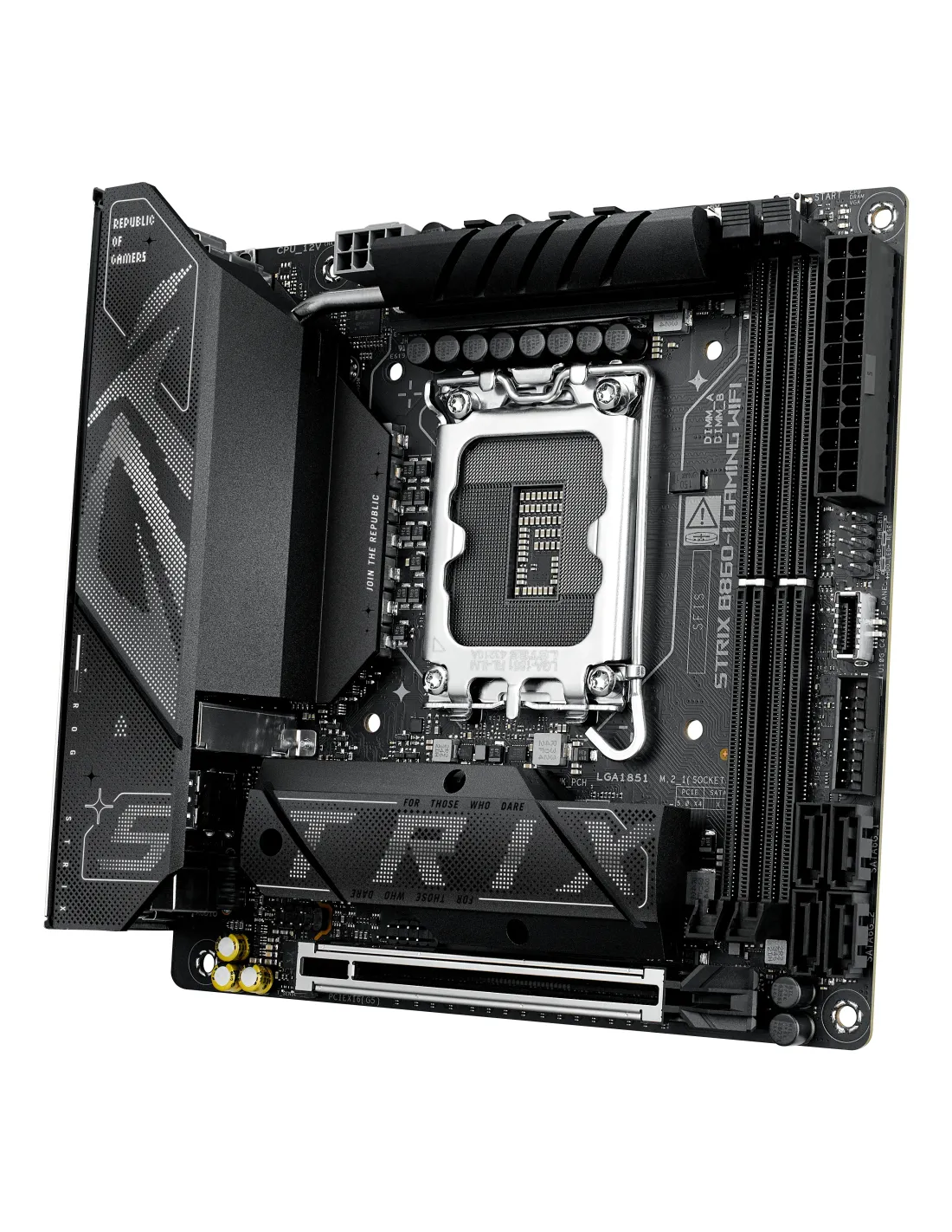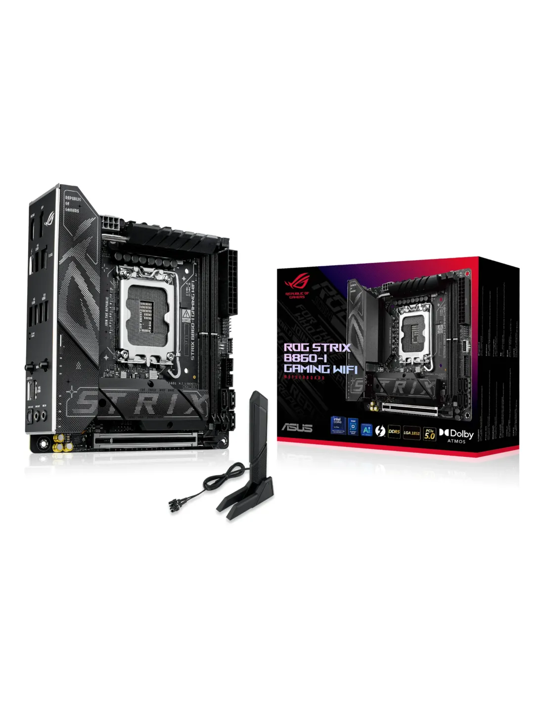 ASUS ROG STRIX B860-I GAMING WIFI. Produttore processore: Intel, Presa per processore: LGA 1851 (Socket V1), Processori compatibili: Intel Core Ultra (Series 2). Tipi di memoria supportati: DDR5-SDRAM, RAM massima supportata: 128 GB, tipo di slot di memoria: DIMM. Interfacce dell'unità di archiviazione supportate: M.2, SATA III, Tipi di unità di archiviazione supportate: HDD & SSD, Livelli RAID: 0, 1, 5, 10. Tipo di interfaccia Ethernet: 2.5 Gigabit Ethernet, Wi-Fi standard: Wi-Fi 7 (802.11be). Componente per: PC, Fattore di forma scheda madre: mini ITX, Famiglia di chipset per scheda madre: Intel