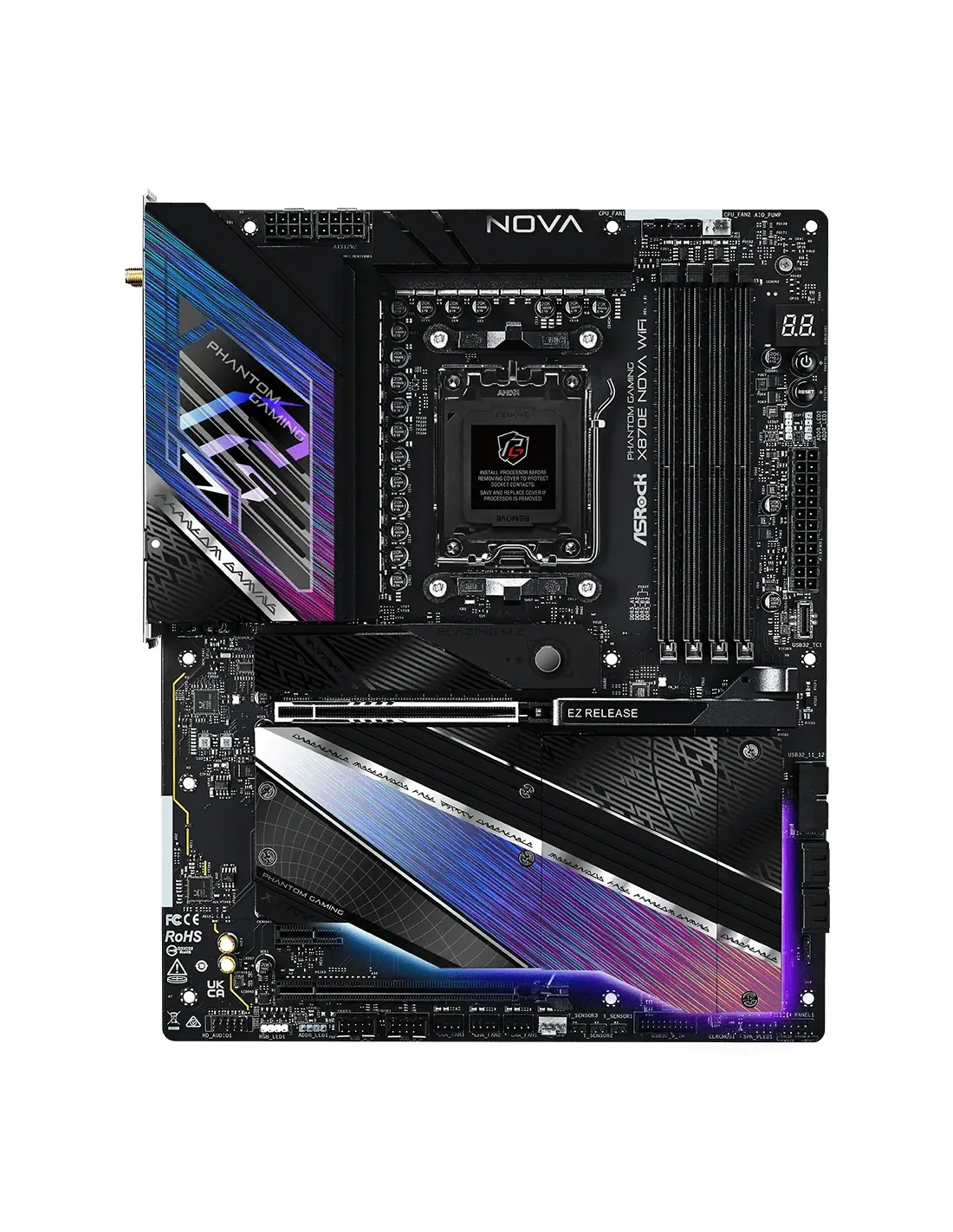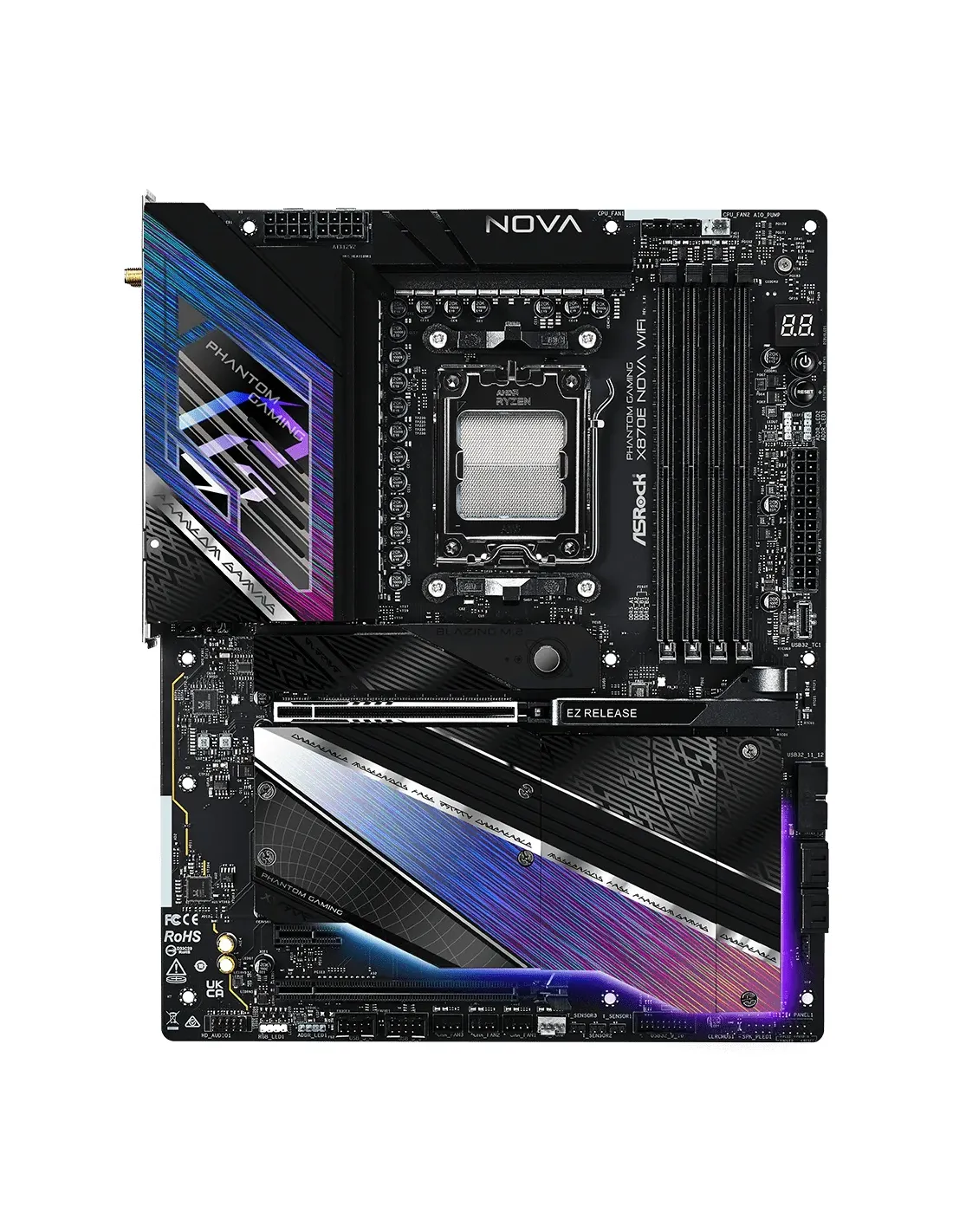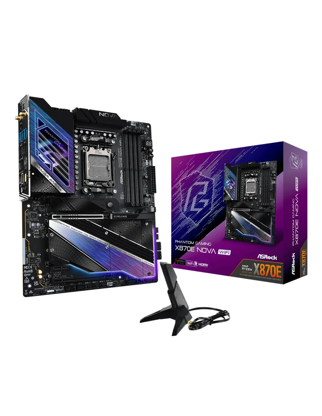 Asrock MK X870E NOVA WIFI. Produttore processore: AMD, Presa per processore: Socket AM5, Processori compatibili: AMD Ryzen 7000 Series, AMD Ryzen 8000 Series, AMD Ryzen 9000 Series. Tipi di memoria supportati: DDR5-SDRAM, RAM massima supportata: 256 GB, tipo di slot di memoria: DIMM. Interfacce dell'unità di archiviazione supportate: M.2, SATA III, Tipi di unità di archiviazione supportate: HDD & SSD, Livelli RAID: 0, 1, 10. Tipo di interfaccia Ethernet: 5 Gigabit Ethernet, Controller LAN: Realtek RTL8126, Wi-Fi standard: Wi-Fi 7 (802.11be). Componente per: PC, Fattore di forma scheda madre: ATX, Famiglia di chipset per scheda madre: AMD