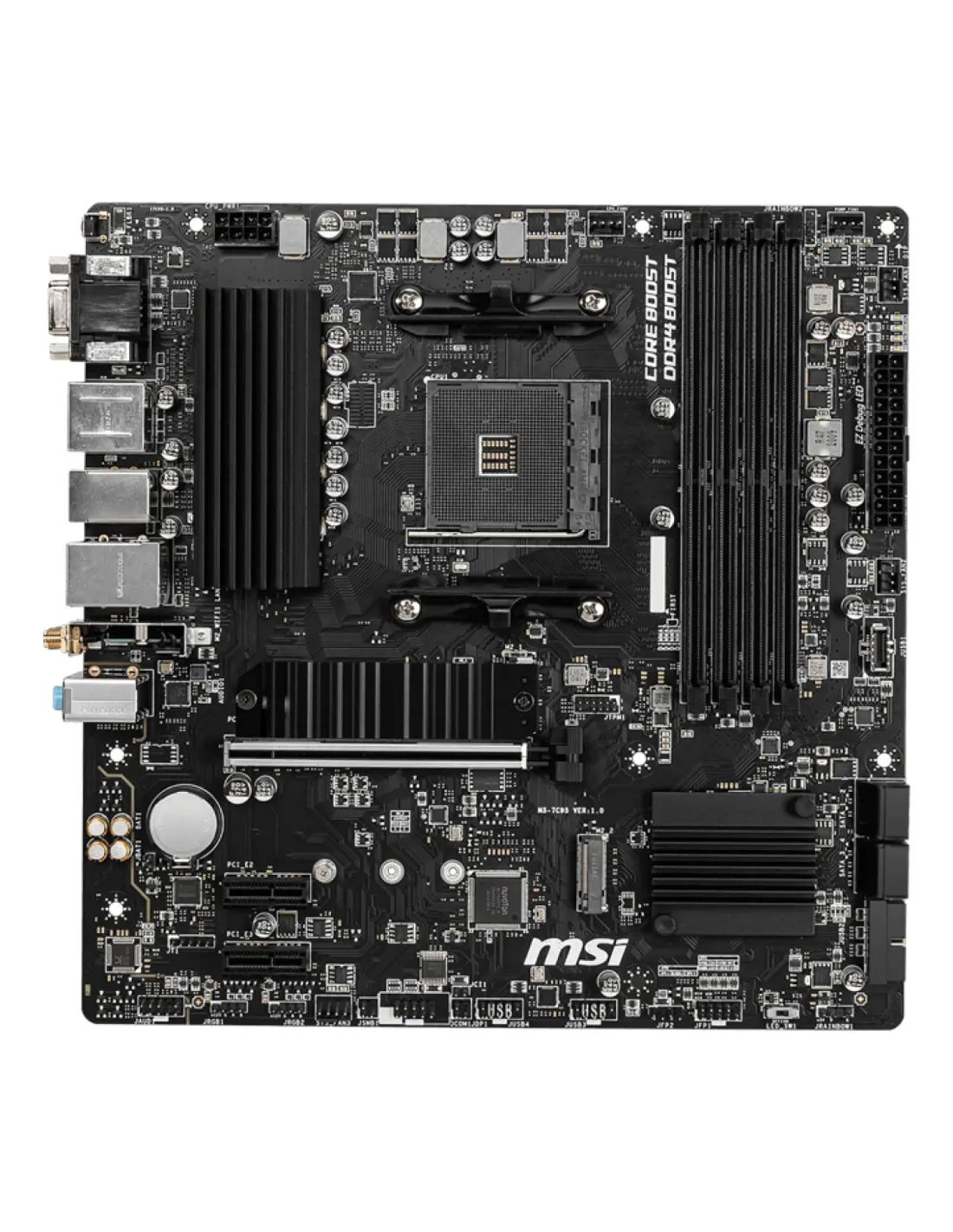 MSI B550M PRO-VDH WIFI. Produttore processore: AMD, Presa per processore: Socket AM4, Processori compatibili: AMD Ryzen 3000 Series. Tipi di memoria supportati: DDR4-SDRAM, RAM massima supportata: 128 GB, tipo di slot di memoria: DIMM. Interfacce dell'unità di archiviazione supportate: SATA III, Tipi di unità di archiviazione supportate: HDD & SSD, Livelli RAID: 0, 1, 10. Memoria massima adattatore grafico: 16000 MB, Risoluzione massima: 4096 x 2160 Pixel. Tipo di interfaccia Ethernet: Gigabit Ethernet, Controller LAN: Realtek 8111HN, Wi-Fi standard: Wi-Fi 5 (802.11ac)