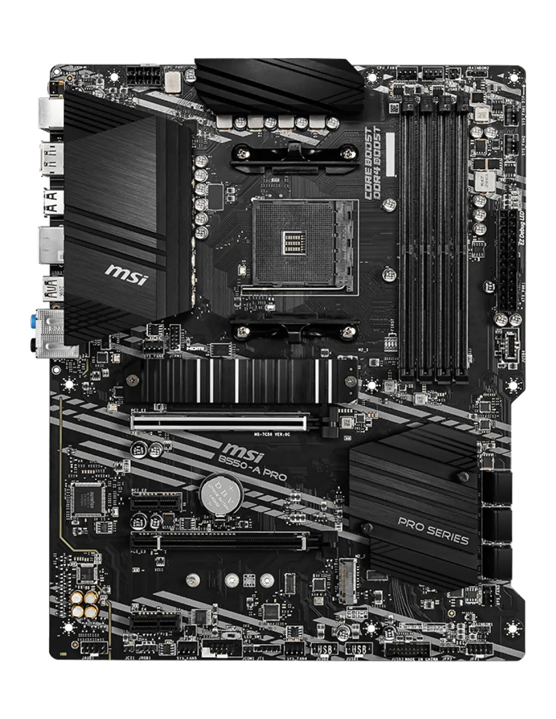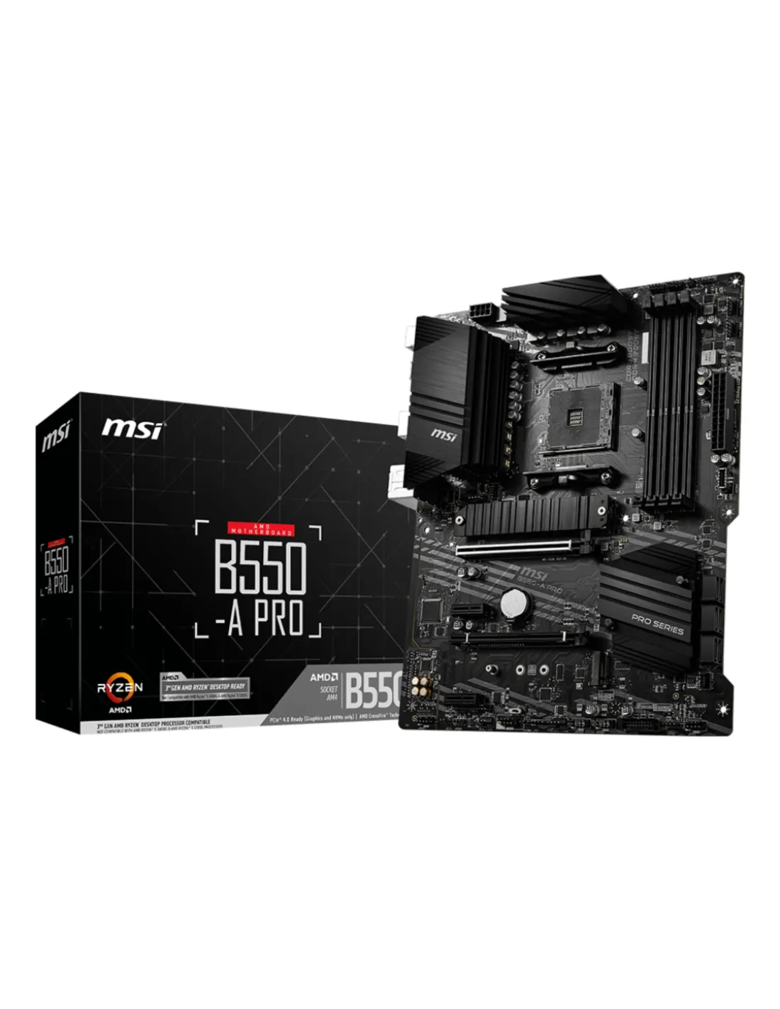 MSI B550-A PRO. Produttore processore: AMD, Presa per processore: Socket AM4, Processori compatibili: AMD Ryzen 3000 Series. Tipi di memoria supportati: DDR4-SDRAM, RAM massima supportata: 128 GB, tipo di slot di memoria: DIMM. Interfacce dell'unità di archiviazione supportate: SATA III, Tipi di unità di archiviazione supportate: HDD & SSD, Livelli RAID: 0, 1, 10. Tecnologia di processo parallela: 2-Way CrossFireX, Memoria massima adattatore grafico: 16000 MB, Risoluzione massima: 4096 x 2160 Pixel. Tipo di interfaccia Ethernet: Gigabit Ethernet, Controller LAN: Realtek 8111H