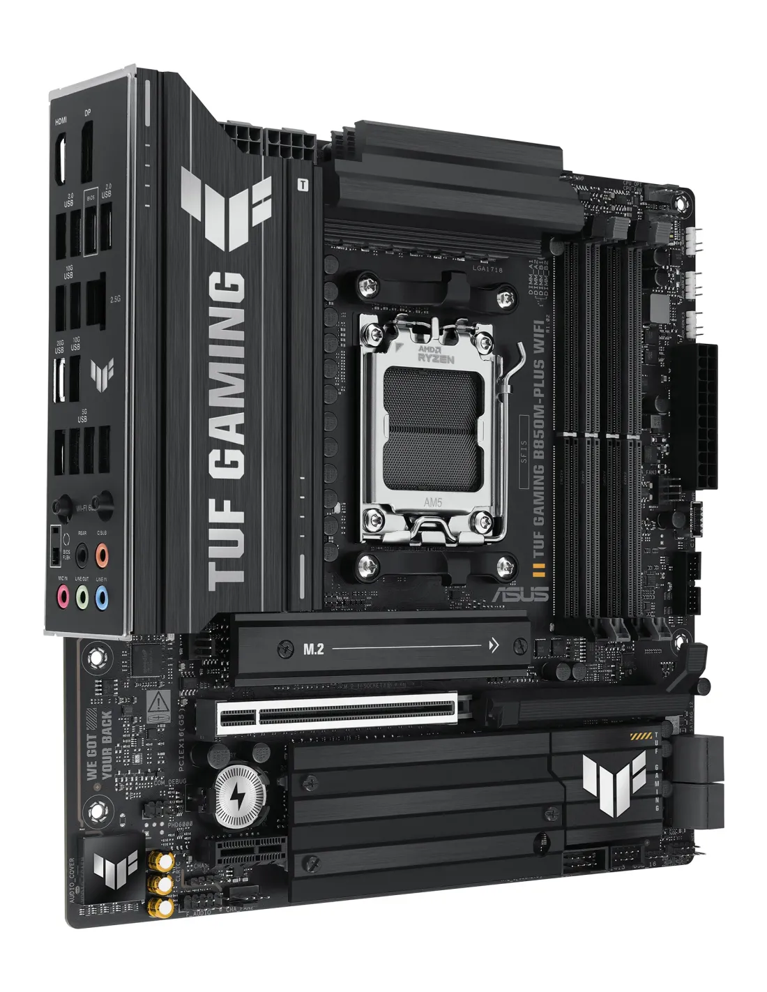ASUS TUF GAMING B850M-PLUS WIFI. Produttore processore: AMD, Presa per processore: Socket AM5, Processori compatibili: AMD Ryzen 7000 Series, AMD Ryzen 8000 Series, AMD Ryzen 9000 Series. Tipi di memoria supportati: DDR5-SDRAM, RAM massima supportata: 192 GB, tipo di slot di memoria: DIMM. Interfacce dell'unità di archiviazione supportate: M.2, SATA III, Tipi di unità di archiviazione supportate: HDD & SSD, Livelli RAID: 0, 1, 5, 10. Tipo di interfaccia Ethernet: 2.5 Gigabit Ethernet, Wi-Fi standard: Wi-Fi 6E (802.11ax), Standard Wi-Fi: Wi-Fi 6E (802.11ax). Componente per: PC, Fattore di forma scheda madre: micro ATX, Famiglia di chipset per scheda madre: AMD