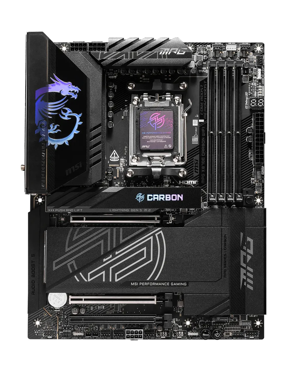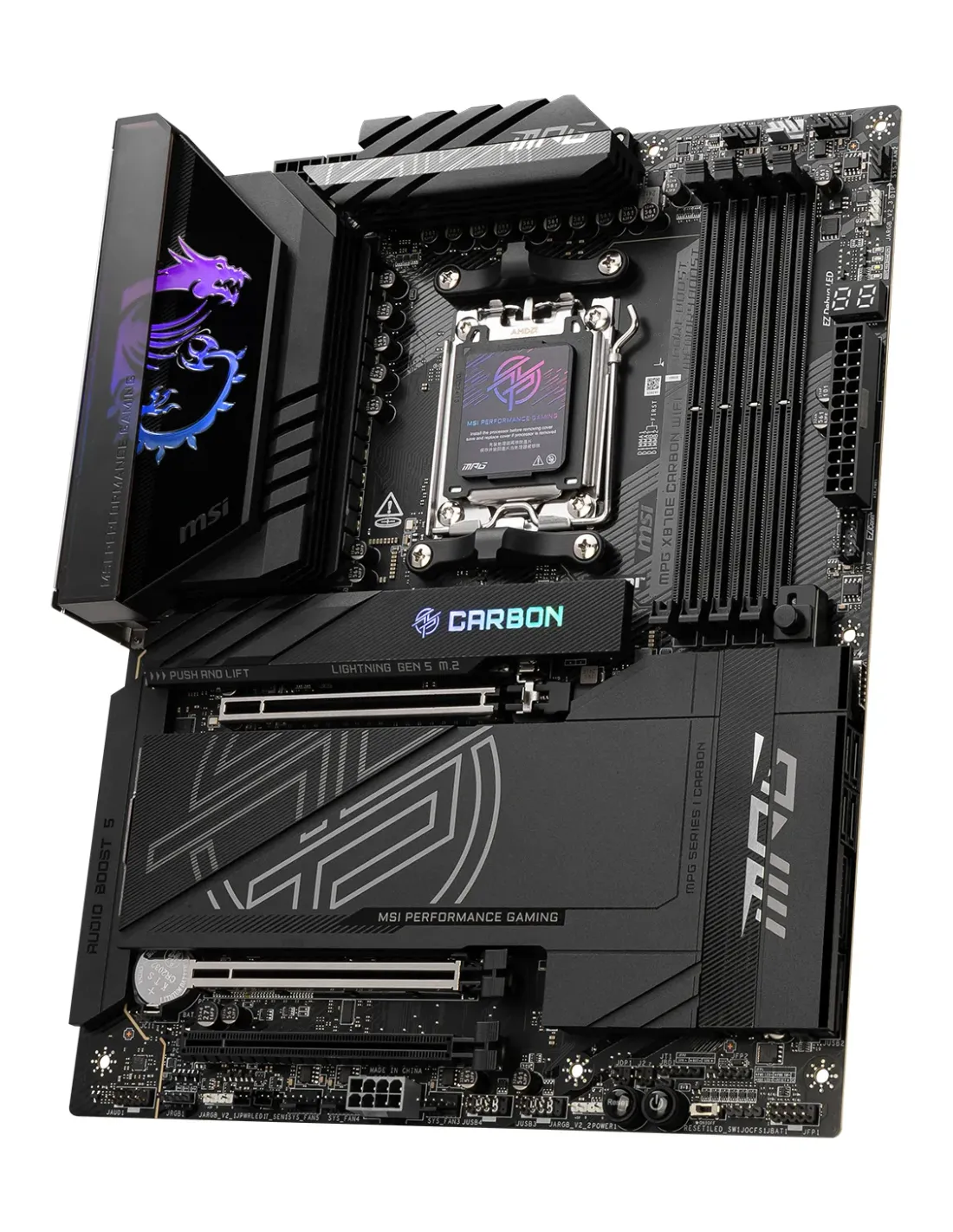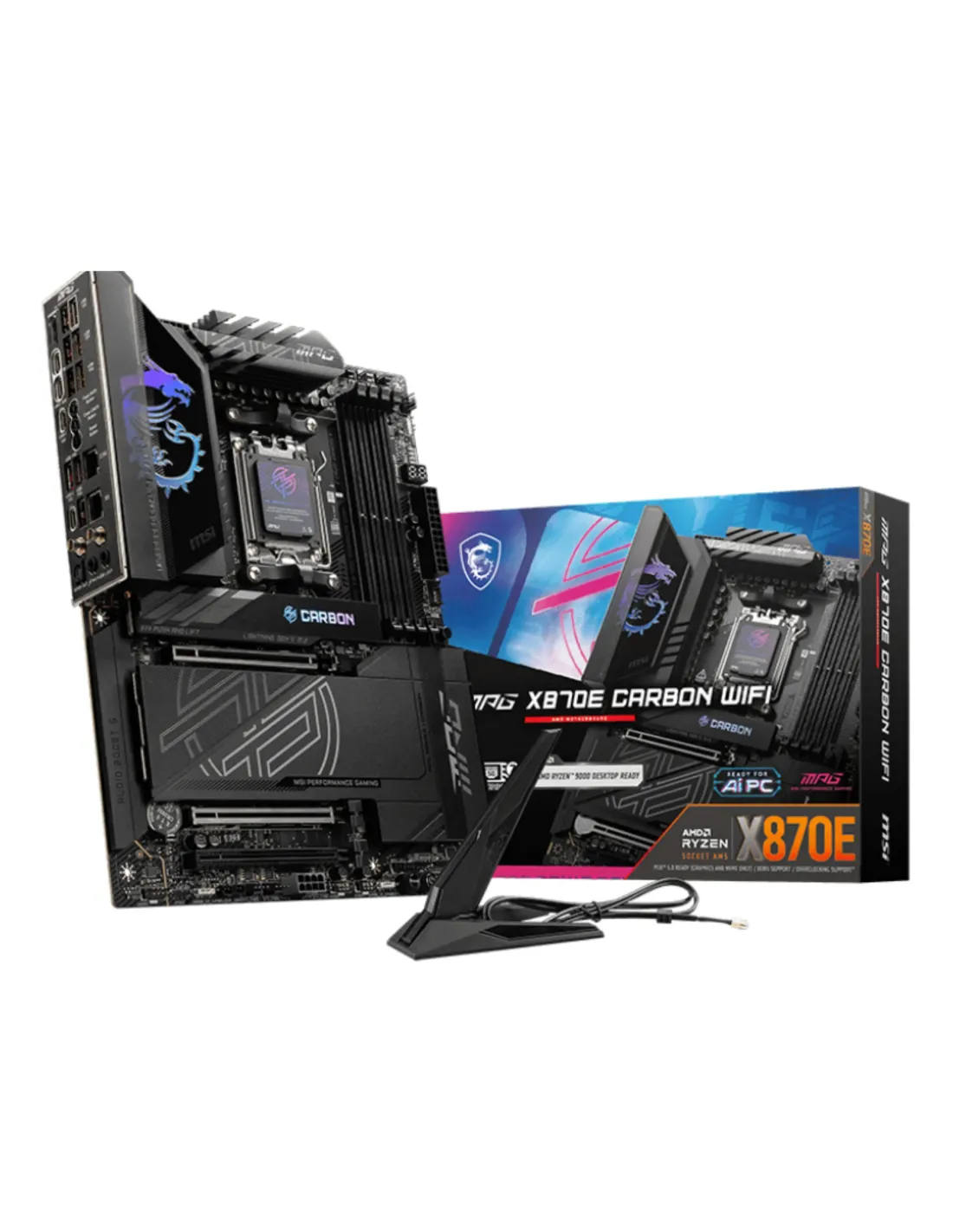MSI MPG X870E CARBON WIFI. Produttore processore: AMD, Presa per processore: Socket AM5, Processori compatibili: AMD Ryzen™ 7. Tipi di memoria supportati: DDR5-SDRAM, RAM massima supportata: 256 GB, tipo di slot di memoria: DIMM. Interfacce dell'unità di archiviazione supportate: M.2, SATA III, Tipi di unità di archiviazione supportate: HDD & SSD. Tipo di interfaccia Ethernet: 2.5 Gigabit Ethernet, Wi-Fi standard: Wi-Fi 7 (802.11be), Standard Wi-Fi: Wi-Fi 7 (802.11be). Componente per: PC, Fattore di forma scheda madre: ATX, Famiglia di chipset per scheda madre: AMD