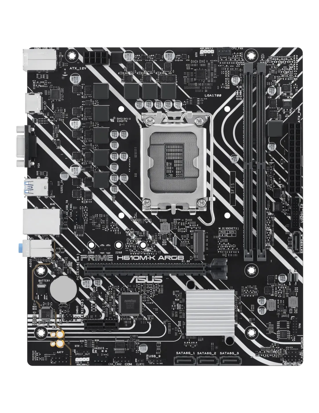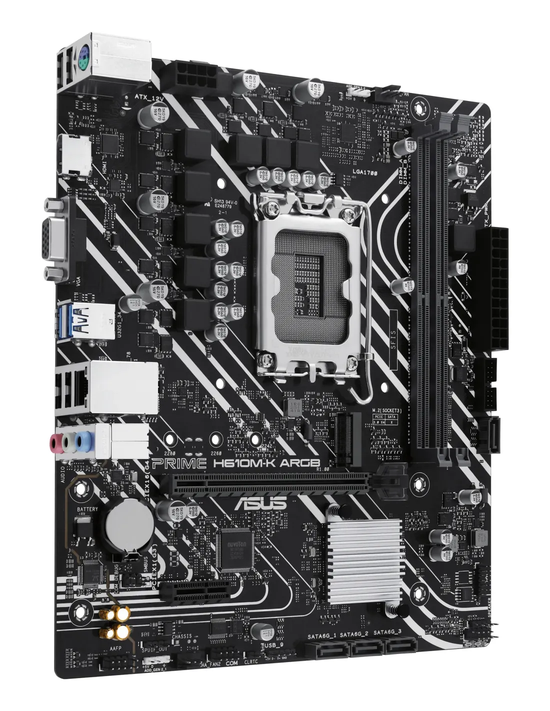 ASUS PRIME H610M-K ARGB. Produttore processore: Intel, Presa per processore: LGA 1700, Processori compatibili: Intel® Celeron®, Intel® Core™ i3, Intel® Core™ i5, Intel® Core™ i7, Intel® Core™ i9,.... Tipi di memoria supportati: DDR5-SDRAM, RAM massima supportata: 96 GB, tipo di slot di memoria: DIMM. Interfacce dell'unità di archiviazione supportate: M.2, SATA, Tipi di unità di archiviazione supportate: HDD & SSD. Tipo di interfaccia Ethernet: Gigabit Ethernet. Componente per: PC, Fattore di forma scheda madre: micro ATX, Famiglia di chipset per scheda madre: Intel