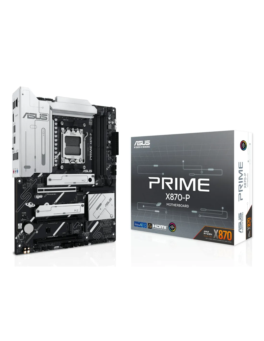 ASUS PRIME X870-P. Produttore processore: AMD, Presa per processore: Socket AM5, Processori compatibili: AMD Ryzen 7000 Series, AMD Ryzen 8000 Series, AMD Ryzen 9000 Series. Tipi di memoria supportati: DDR5-SDRAM, RAM massima supportata: 192 GB, tipo di slot di memoria: DIMM. Interfacce dell'unità di archiviazione supportate: M.2, SATA III, Tipi di unità di archiviazione supportate: HDD & SSD, Livelli RAID: 0, 1, 5, 10. versione DisplayPort: 1.4a. Tipo di interfaccia Ethernet: 2.5 Gigabit Ethernet
