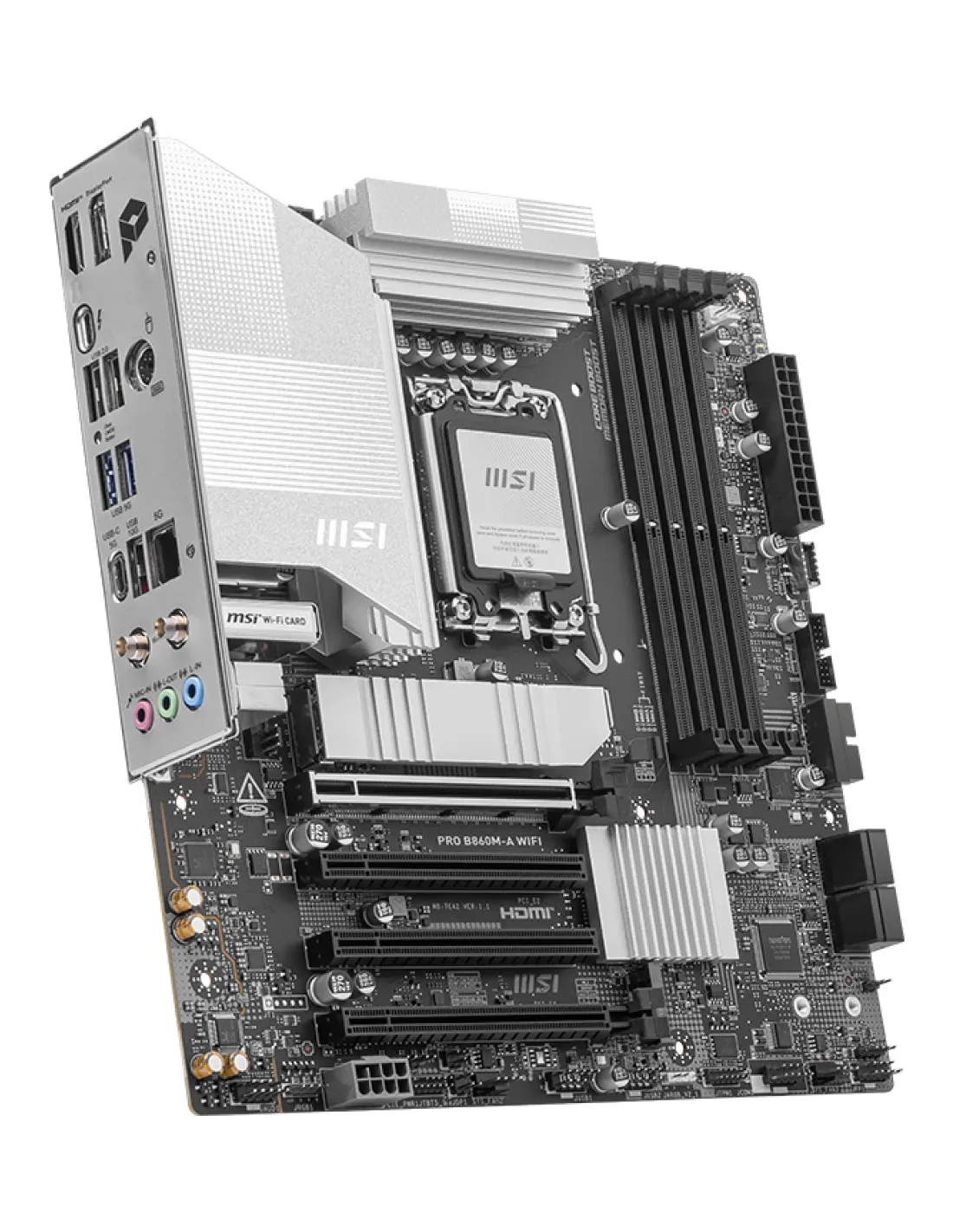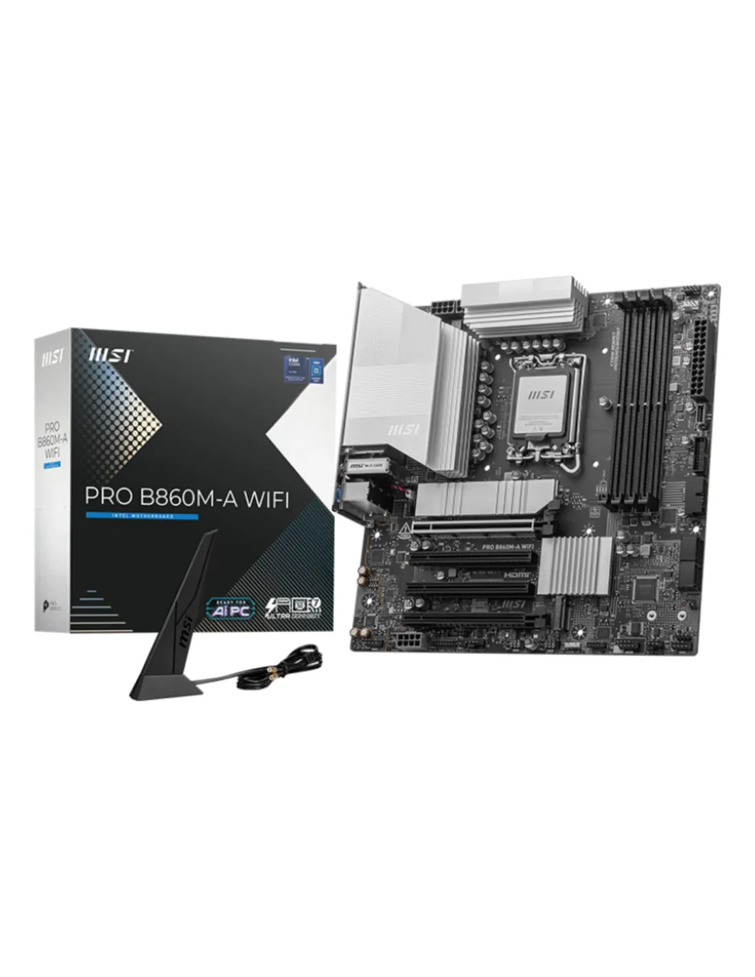 MSI PRO B860M-A WIFI. Produttore processore: Intel, Presa per processore: LGA 1851 (Socket V1), Processori compatibili: Intel Core Ultra (Series 2). Tipi di memoria supportati: DDR5-SDRAM, RAM massima supportata: 256 GB, tipo di slot di memoria: DIMM. Interfacce dell'unità di archiviazione supportate: M.2, Micro SATA III, Tipi di unità di archiviazione supportate: HDD & SSD, Livelli RAID: 0, 1, 5, 10. Tipo di interfaccia Ethernet: 5 Gigabit Ethernet, Wi-Fi standard: Wi-Fi 7 (802.11be), Standard Wi-Fi: 802.11a, 802.11b, 802.11g, Wi-Fi 4 (802.11n), Wi-Fi 5 (802.11ac), Wi-Fi 6 (802.11ax), Wi-Fi 6E.... Componente per: PC, Fattore di forma scheda madre: micro ATX, Famiglia di chipset per scheda madre: AMD