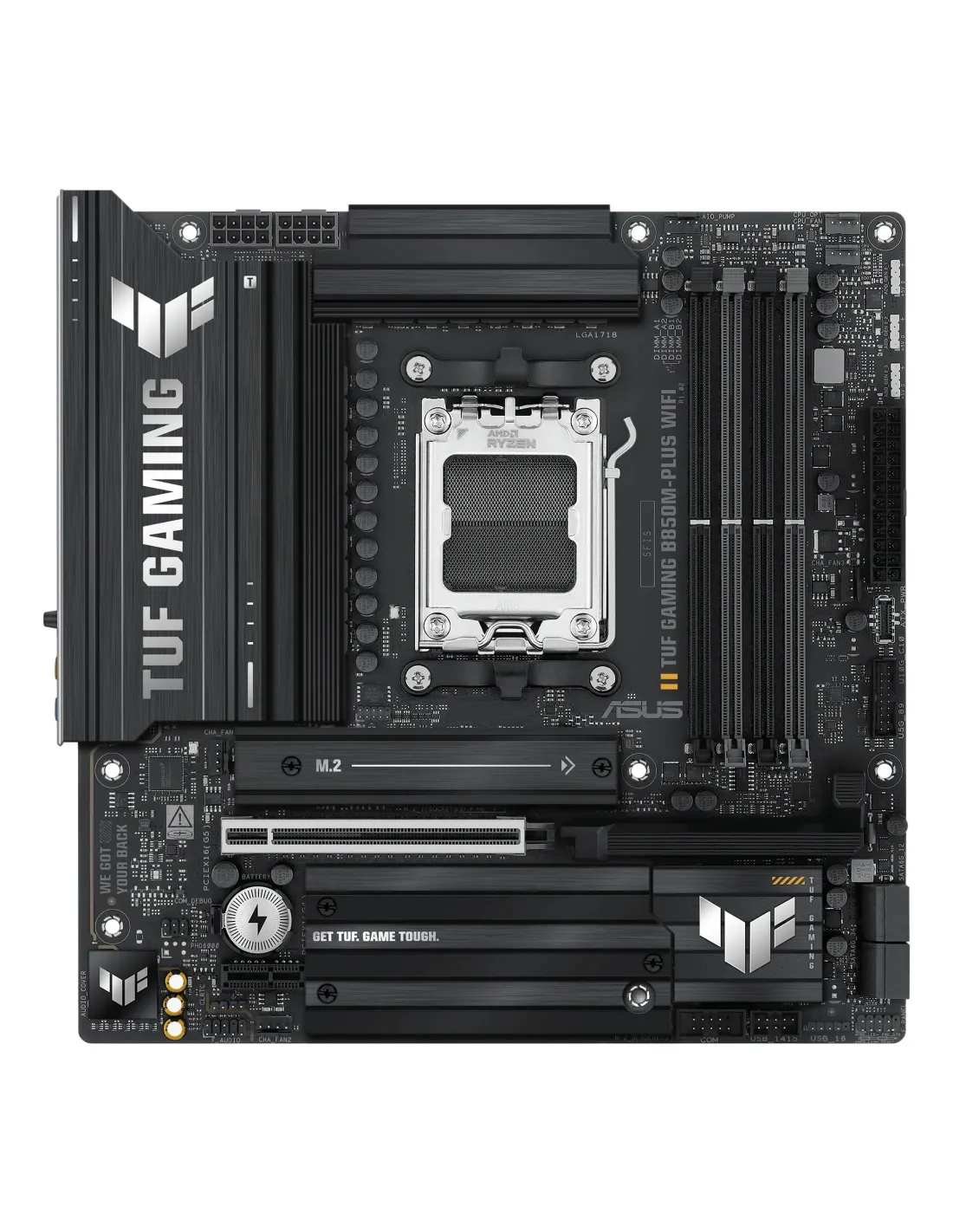 ASUS TUF GAMING B850M-PLUS WIFI. Produttore processore: AMD, Presa per processore: Socket AM5, Processori compatibili: AMD Ryzen 7000 Series, AMD Ryzen 8000 Series, AMD Ryzen 9000 Series. Tipi di memoria supportati: DDR5-SDRAM, RAM massima supportata: 192 GB, tipo di slot di memoria: DIMM. Interfacce dell'unità di archiviazione supportate: M.2, SATA III, Tipi di unità di archiviazione supportate: HDD & SSD, Livelli RAID: 0, 1, 5, 10. Tipo di interfaccia Ethernet: 2.5 Gigabit Ethernet, Wi-Fi standard: Wi-Fi 6E (802.11ax), Standard Wi-Fi: Wi-Fi 6E (802.11ax). Componente per: PC, Fattore di forma scheda madre: micro ATX, Famiglia di chipset per scheda madre: AMD