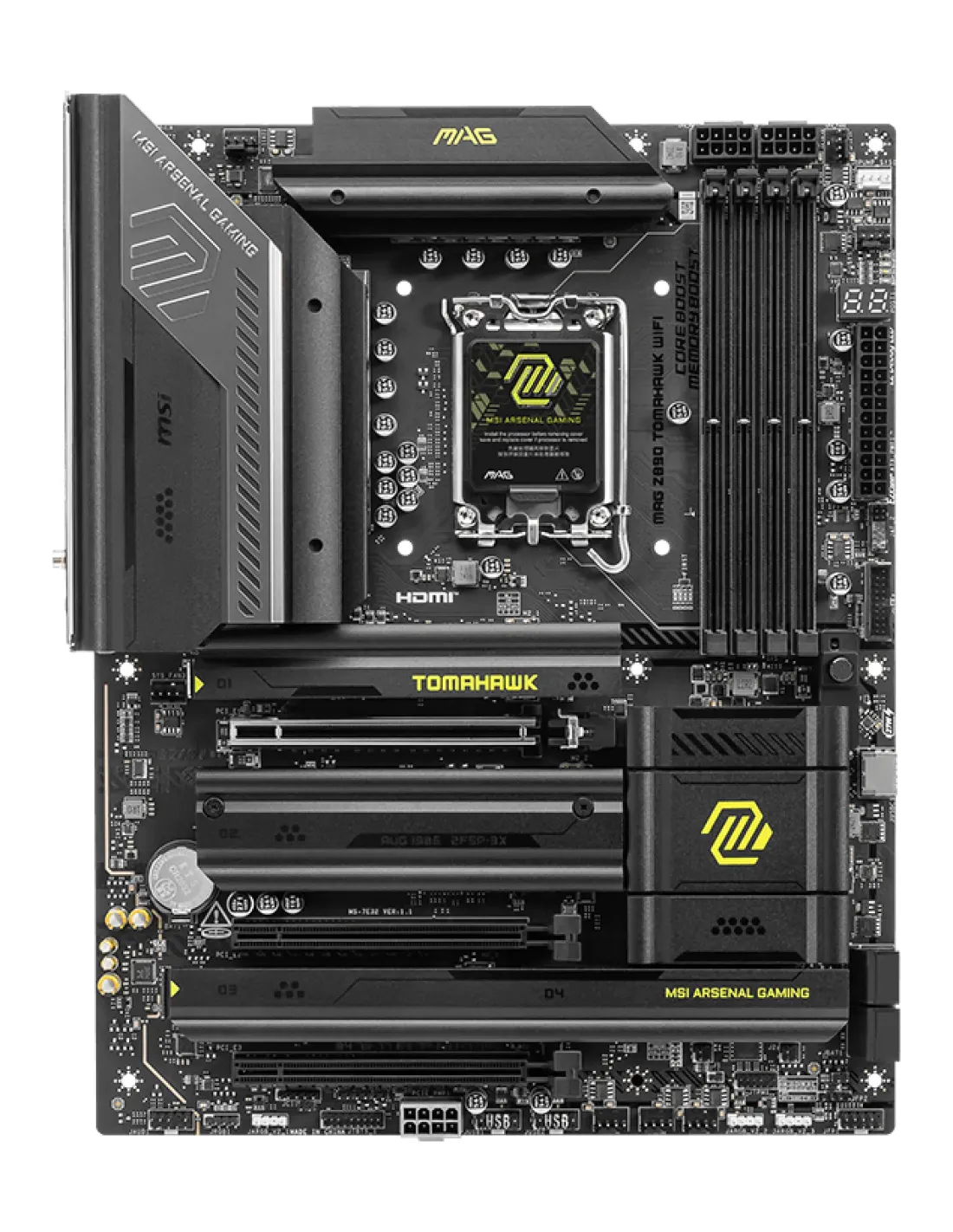 MSI MAG Z890 TOMAHAWK WIFI. Produttore processore: Intel, Presa per processore: LGA 1851 (Socket V1), Processori compatibili: Intel Core Ultra (Series 2). Tipi di memoria supportati: DDR5-SDRAM, RAM massima supportata: 256 GB, tipo di slot di memoria: DIMM. Interfacce dell'unità di archiviazione supportate: M.2, SATA III, Tipi di unità di archiviazione supportate: HDD & SSD, Livelli RAID: 0, 5, 10. Tipo di interfaccia Ethernet: 5 Gigabit Ethernet, Wi-Fi standard: Wi-Fi 7 (802.11be), Standard Wi-Fi: 802.11a, 802.11b, 802.11g, Wi-Fi 4 (802.11n), Wi-Fi 5 (802.11ac), Wi-Fi 6 (802.11ax), Wi-Fi 6E.... Componente per: PC, Fattore di forma scheda madre: ATX, Famiglia di chipset per scheda madre: Intel