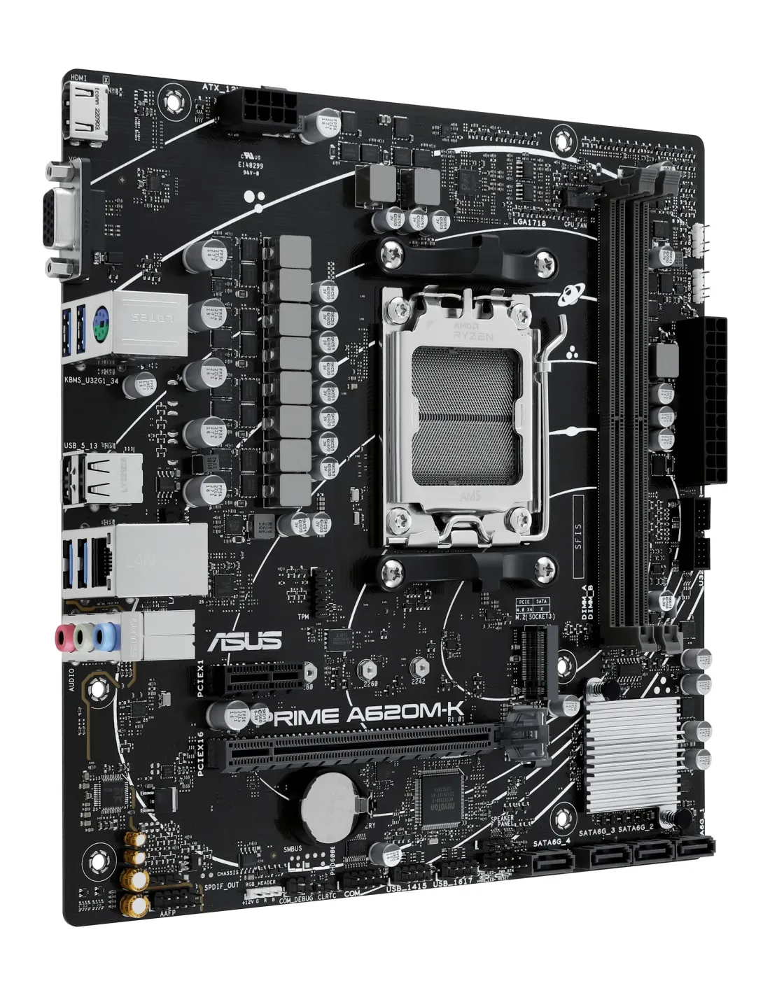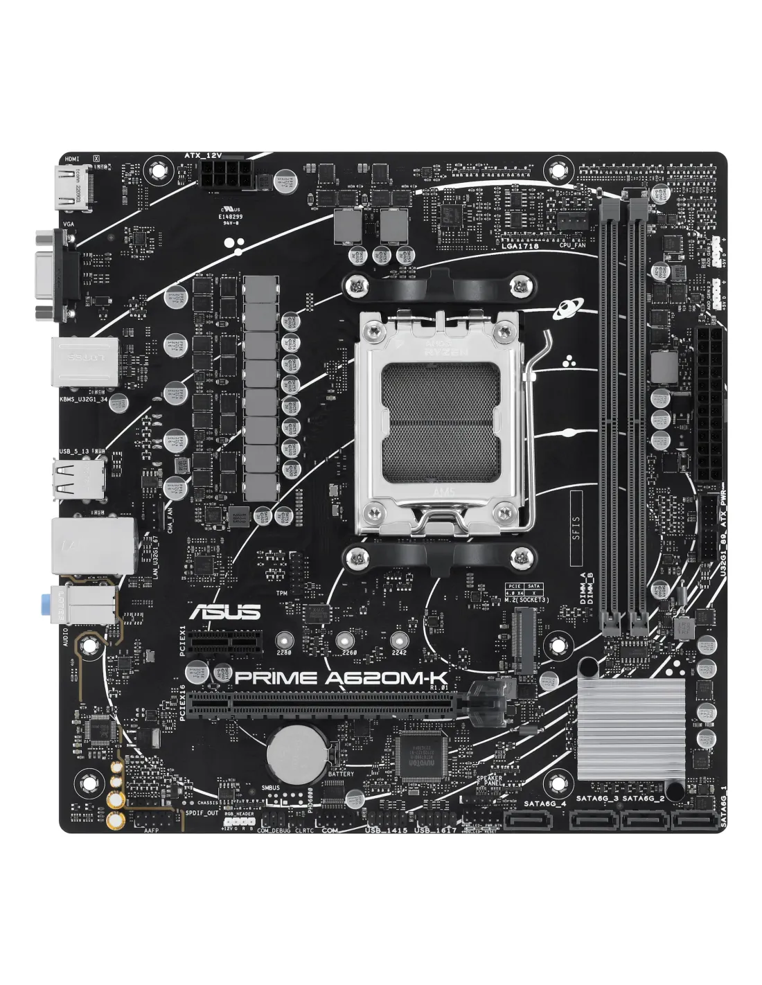 ASUS PRIME A620M-K. Produttore processore: AMD, Presa per processore: Socket AM5, Processori compatibili: AMD Ryzen 7000 Series. Tipi di memoria supportati: DDR5-SDRAM, RAM massima supportata: 96 GB, Canali di memoria: Dual-channel. Interfacce dell'unità di archiviazione supportate: M.2, SATA III, Tipi di unità di archiviazione supportate: HDD & SSD. Tipo di interfaccia Ethernet: Fast Ethernet, Gigabit Ethernet. Componente per: PC, Fattore di forma scheda madre: micro ATX, Famiglia di chipset per scheda madre: AMD