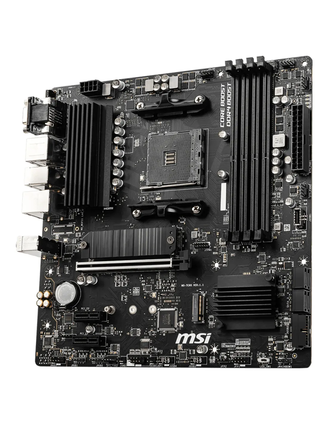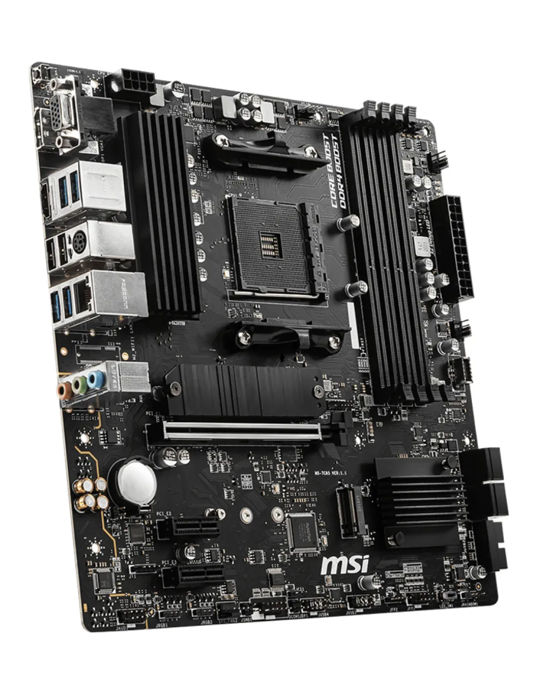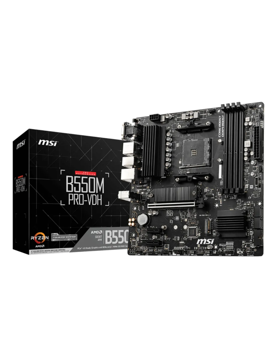 MSI B550M PRO-VDH. Produttore processore: AMD, Presa per processore: Socket AM4, Processori compatibili: AMD Ryzen 3000 Series. Tipi di memoria supportati: DDR4-SDRAM, RAM massima supportata: 128 GB, tipo di slot di memoria: DIMM. Interfacce dell'unità di archiviazione supportate: SATA III, Tipi di unità di archiviazione supportate: HDD & SSD, Livelli RAID: 0, 1, 10. Risoluzione massima: 4096 x 2160 Pixel. Tipo di interfaccia Ethernet: Gigabit Ethernet, Controller LAN: Realtek 8111HN