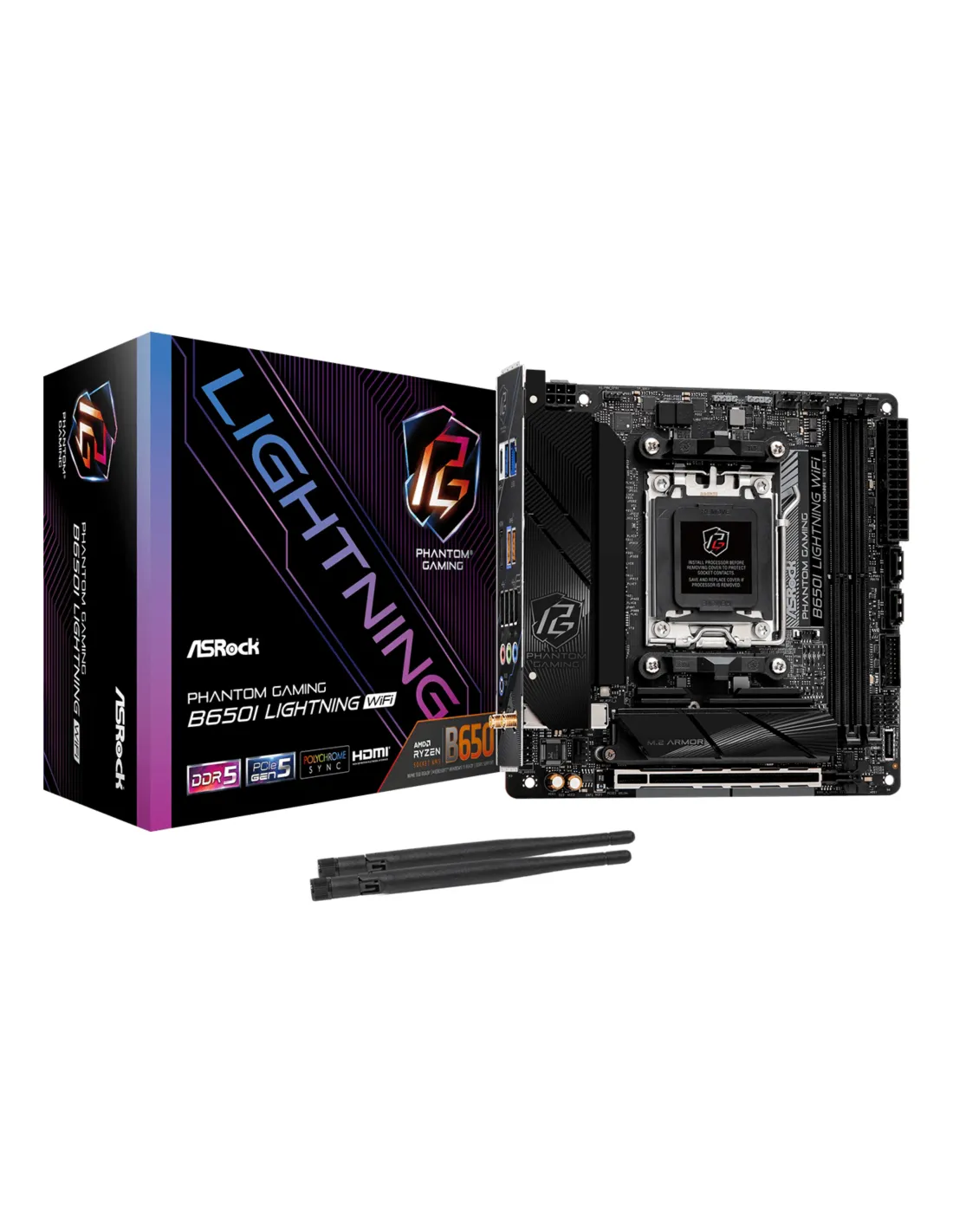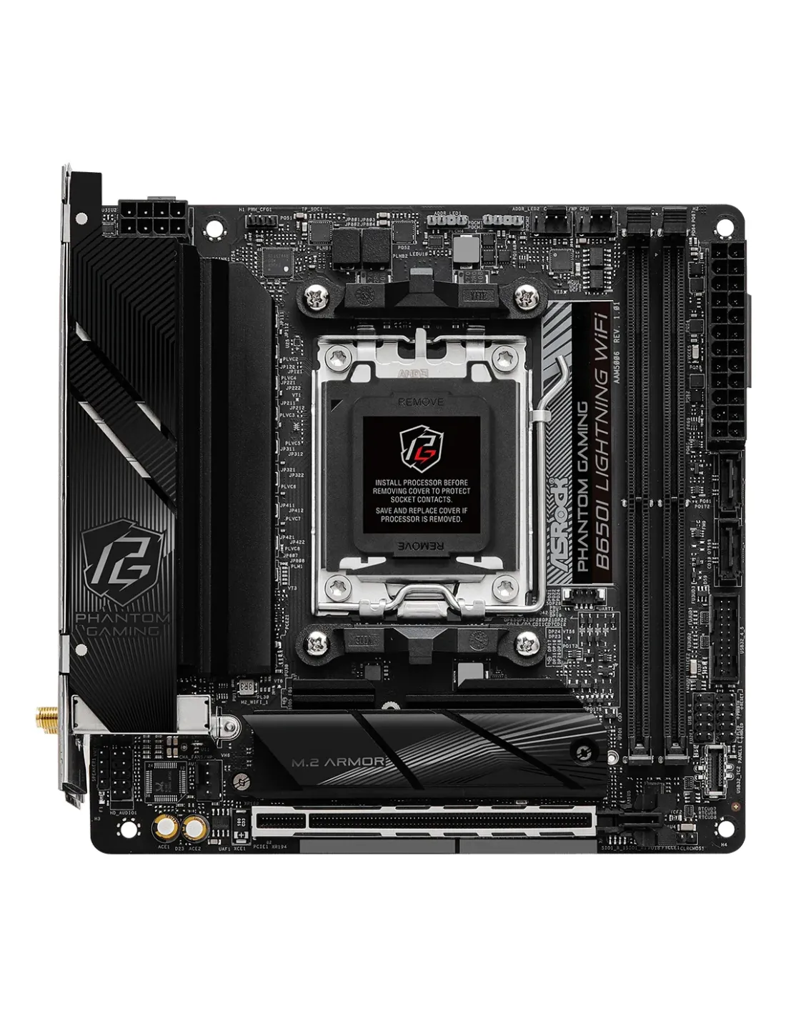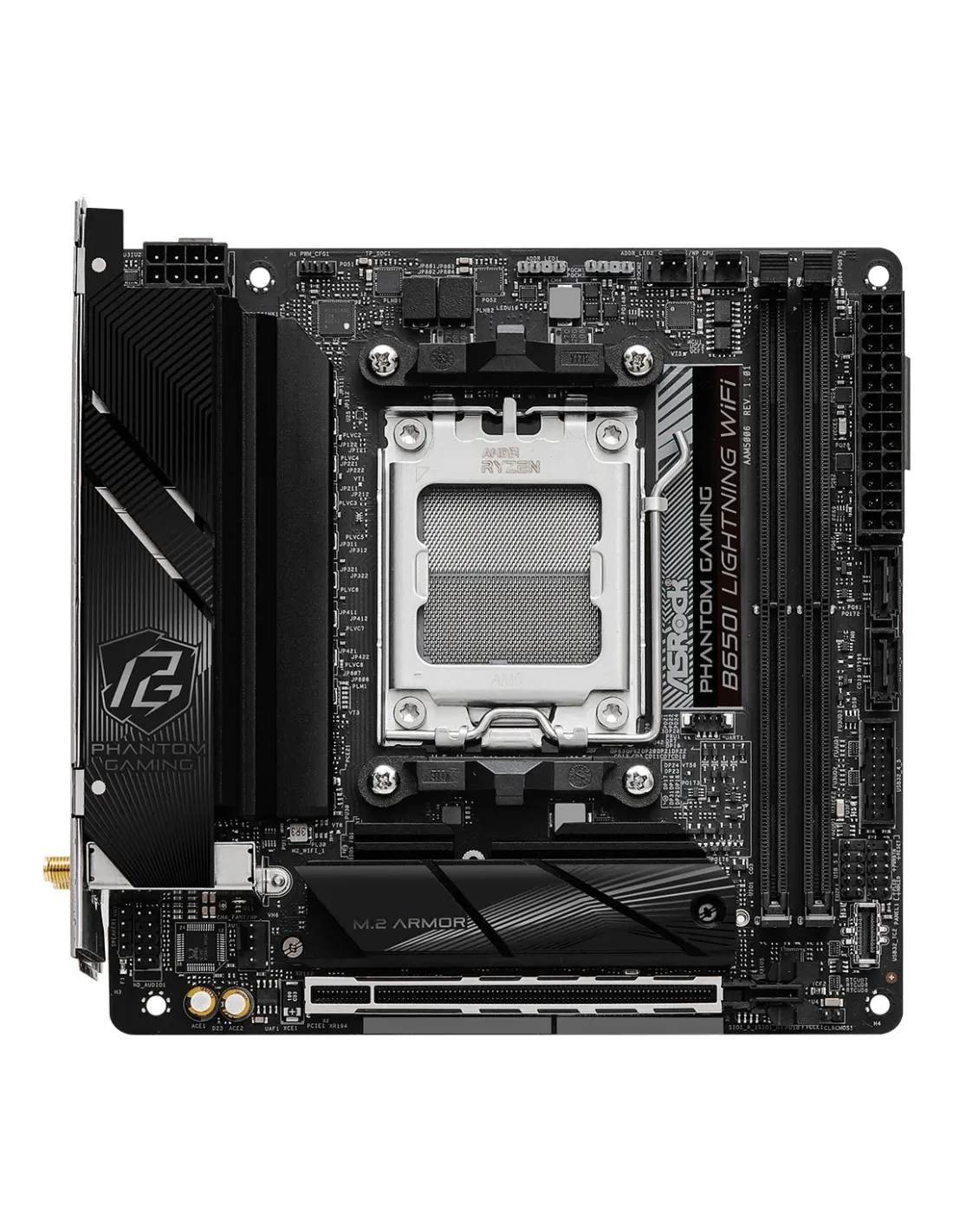Asrock B650I Lightning WiFi. Produttore processore: AMD, Presa per processore: Socket AM5, Processori compatibili: AMD Ryzen 7000 Series. Tipi di memoria supportati: DDR5-SDRAM, RAM massima supportata: 96 GB, tipo di slot di memoria: DIMM. Interfacce dell'unità di archiviazione supportate: M.2, SATA III, Tipi di unità di archiviazione supportate: HDD & SSD, Livelli RAID: 0, 1, 10. Famiglia della scheda grafica: AMD, Adattatore grafico: AMD RDNA 2, Risoluzione massima: 3840 x 2160 Pixel. Tipo di interfaccia Ethernet: 2.5 Gigabit Ethernet, Controller LAN: Dragon RTL8125BG, Wi-Fi standard: Wi-Fi 6E (802.11ax)