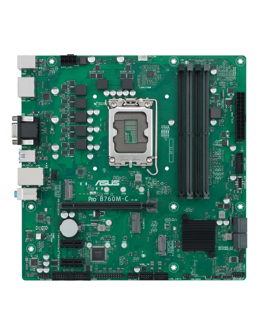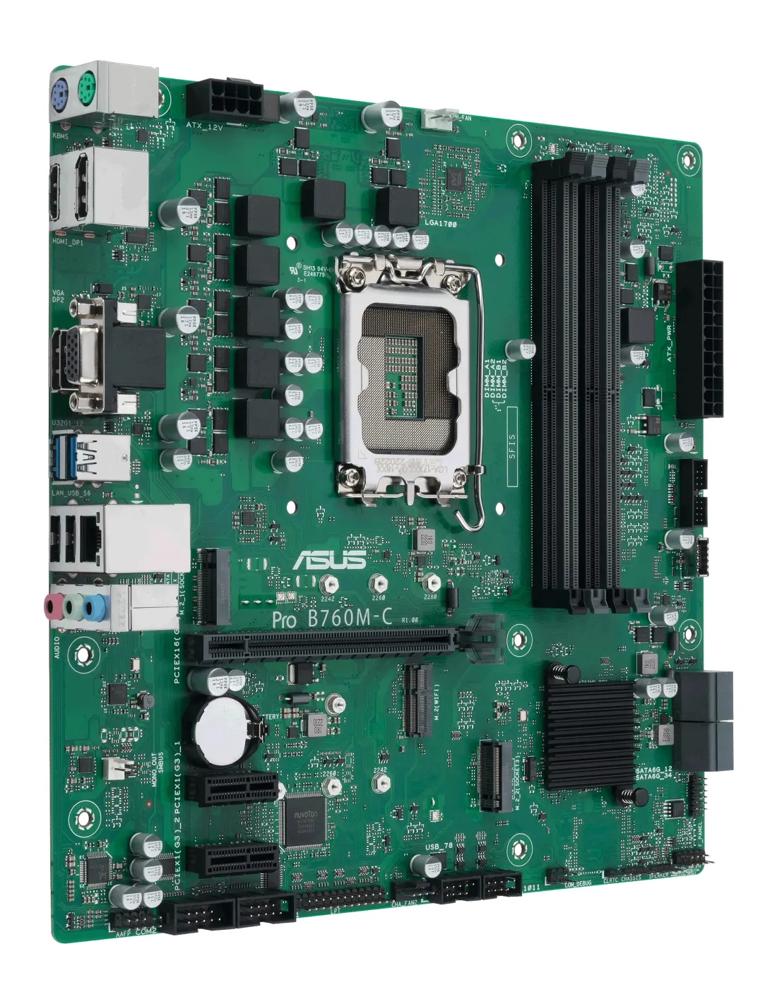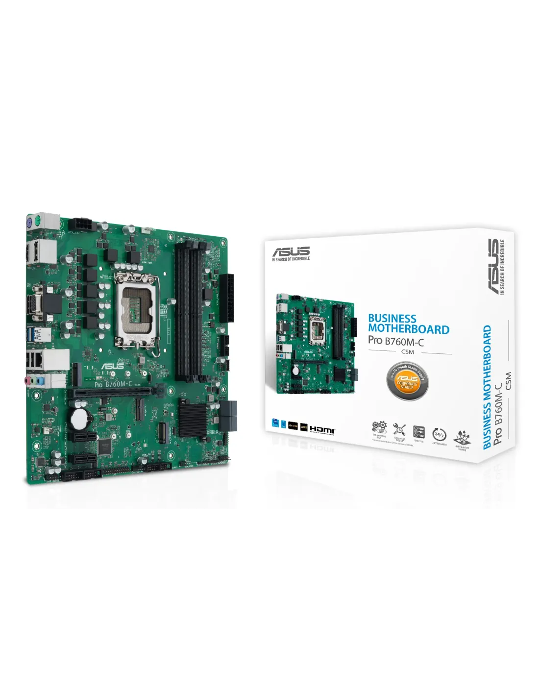 ASUS PRO B760M-C-CSM. Produttore processore: Intel, Presa per processore: LGA 1700, Processori compatibili: Intel® Celeron®, Intel® Core™ i3, Intel® Core™ i5, Intel® Core™ i7, Intel® Core™ i9,.... Tipi di memoria supportati: DDR5-SDRAM, RAM massima supportata: 128 GB, tipo di slot di memoria: DIMM. Interfacce dell'unità di archiviazione supportate: M.2, SATA III, Tipi di unità di archiviazione supportate: HDD & SSD, Livelli RAID: 0, 1, 5, 10. Tipo di interfaccia Ethernet: Gigabit Ethernet. Componente per: PC, Fattore di forma scheda madre: micro ATX, Famiglia di chipset per scheda madre: Intel