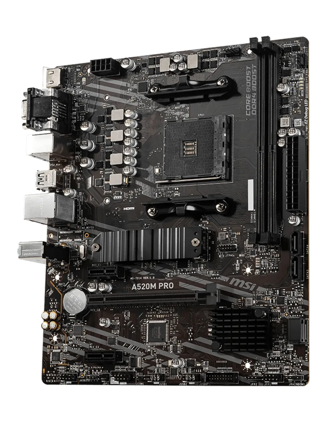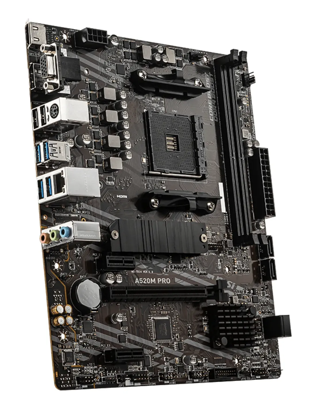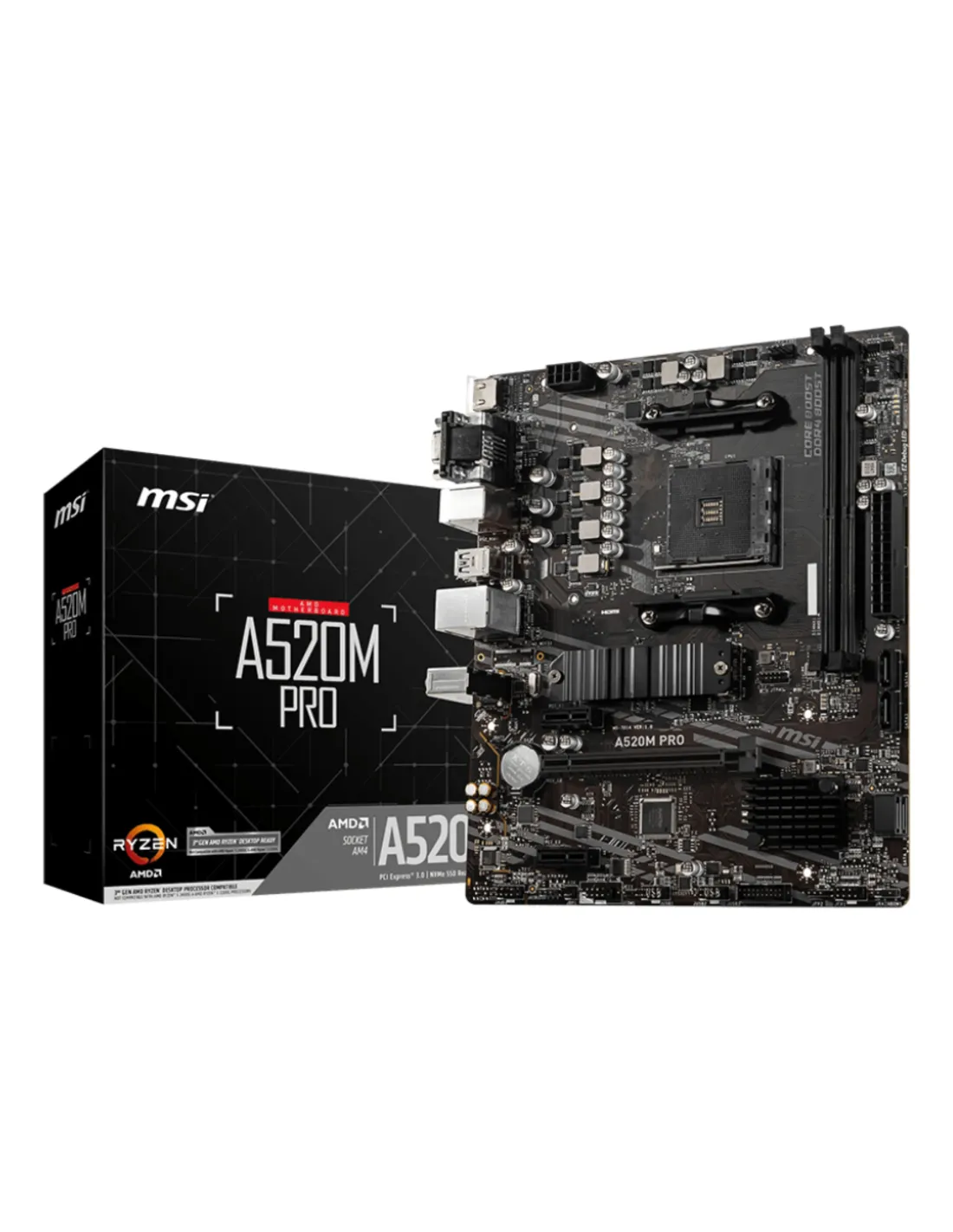 MSI A520M PRO. Produttore processore: AMD, Presa per processore: Socket AM4, Processori compatibili: AMD Ryzen 3000 Series. Tipi di memoria supportati: DDR4-SDRAM, RAM massima supportata: 64 GB, tipo di slot di memoria: DIMM. Interfacce dell'unità di archiviazione supportate: PCI Express 3.0, SATA, Tipi di unità di archiviazione supportate: HDD & SSD, Livelli RAID: 0, 1, 10. Risoluzione massima: 4096 x 2160 Pixel. Tipo di interfaccia Ethernet: Gigabit Ethernet, Controller LAN: Realtek 8111H