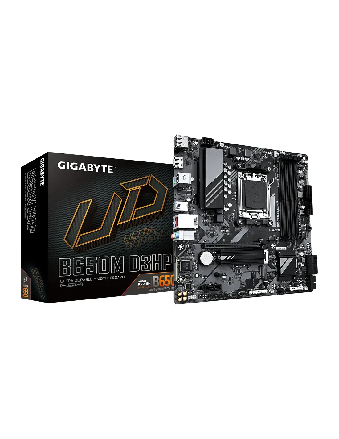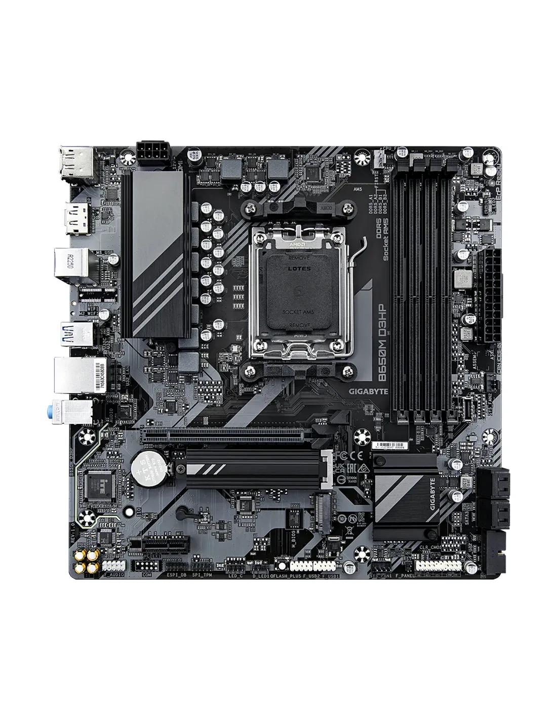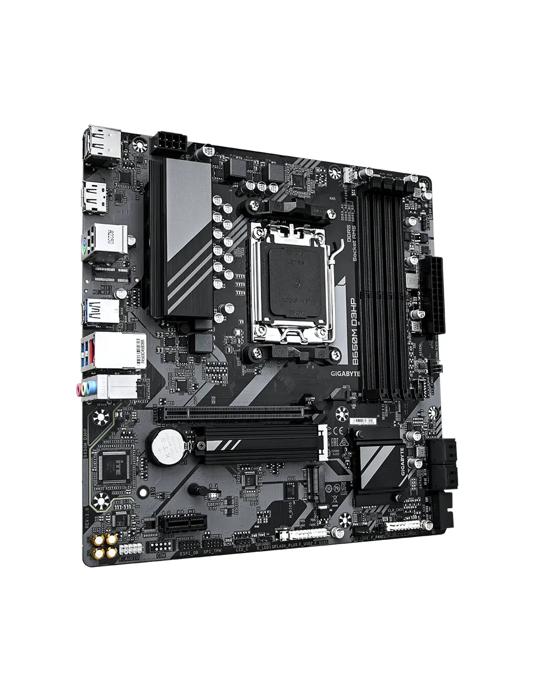 GIGABYTE B650M D3HP Scheda madre - AMD Ryzen serie 9000, VRM a 5+2+2 fasi, fino a 7600 MHz DDR5 (OC), 2xPCIe 4.0 M.2, LAN 2,5 GbE, USB 3.2 Gen 1. Produttore processore: AMD, Presa per processore: Socket AM5, Processori compatibili: AMD Ryzen 7000 Series, AMD Ryzen 8000 Series, AMD Ryzen 9000 Series. Tipi di memoria supportati: DDR5-SDRAM, RAM massima supportata: 256 GB, tipo di slot di memoria: DIMM. Interfacce dell'unità di archiviazione supportate: M.2, SATA III, Tipi di unità di archiviazione supportate: HDD & SSD, Livelli RAID: 0, 1, 10. Risoluzione massima: 4096 x 2160 Pixel. Tipo di interfaccia Ethernet: 2.5 Gigabit Ethernet, Controller LAN: Realtek RTL8125