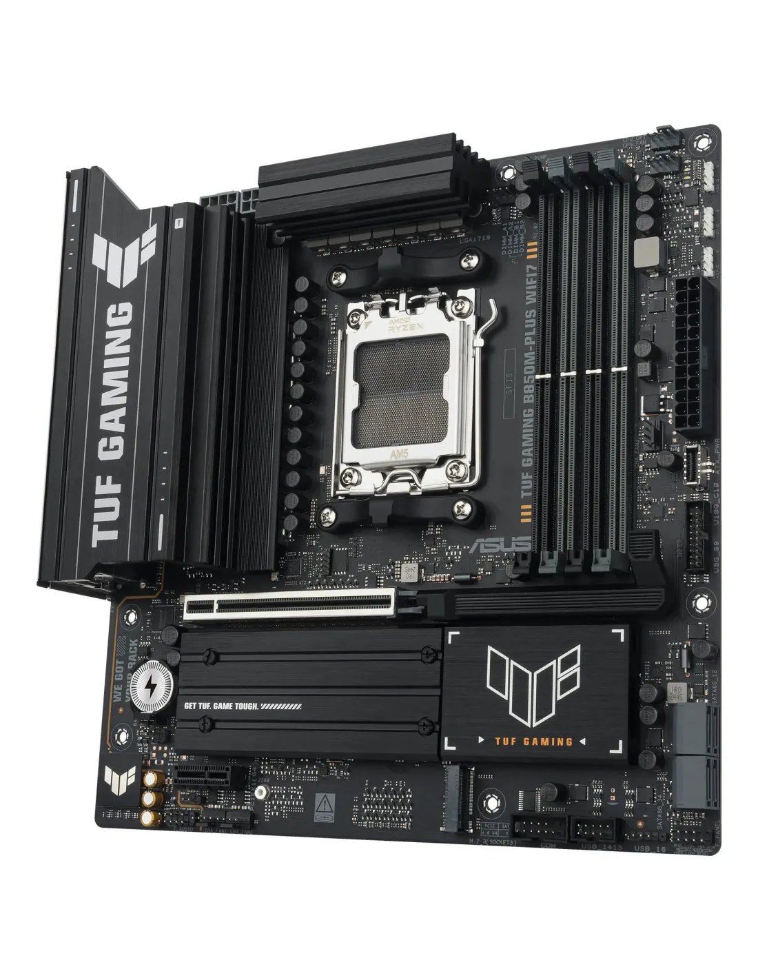 ASUS TUF GAMING B850M-PLUS WIFI7. Produttore processore: AMD, Presa per processore: Socket AM5, Processori compatibili: AMD Ryzen 7000 Series, AMD Ryzen 8000 Series, AMD Ryzen 9000 Series. Tipi di memoria supportati: DDR5-SDRAM, RAM massima supportata: 256 GB, tipo di slot di memoria: DIMM. Interfacce dell'unità di archiviazione supportate: PCI Express 4.0, PCI Express 5.0, Tipi di unità di archiviazione supportate: HDD & SSD, Livelli RAID: 0, 1, 5, 10. Tipo di interfaccia Ethernet: 2.5 Gigabit Ethernet, Wi-Fi standard: Wi-Fi 7 (802.11be), Standard Wi-Fi: Wi-Fi 7 (802.11be). Componente per: PC, Fattore di forma scheda madre: micro ATX, Famiglia di chipset per scheda madre: AMD