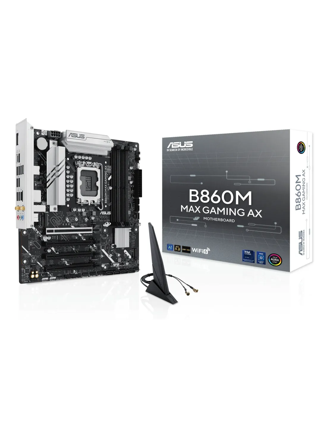 ASUS B860M MAX GAMING AX. Produttore processore: Intel, Presa per processore: LGA 1851 (Socket V1), Processori compatibili: Intel Core Ultra (Series 2). Tipi di memoria supportati: DDR5-SDRAM, RAM massima supportata: 256 GB, tipo di slot di memoria: DIMM. Interfacce dell'unità di archiviazione supportate: PCI Express 4.0, PCI Express 5.0, Tipi di unità di archiviazione supportate: HDD & SSD, Livelli RAID: 0, 1, 5, 10. Risoluzione massima: 3840 x 2160 Pixel. Tipo di interfaccia Ethernet: 2.5 Gigabit Ethernet, Wi-Fi standard: Wi-Fi 6 (802.11ax), Standard Wi-Fi: Wi-Fi 6 (802.11ax)