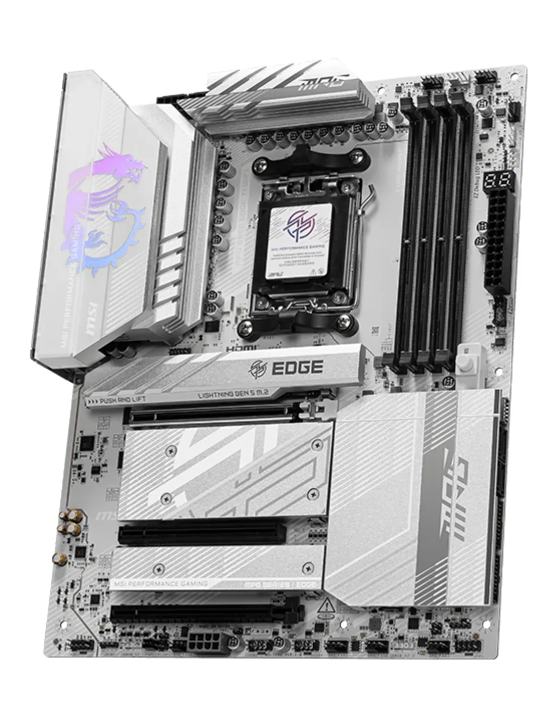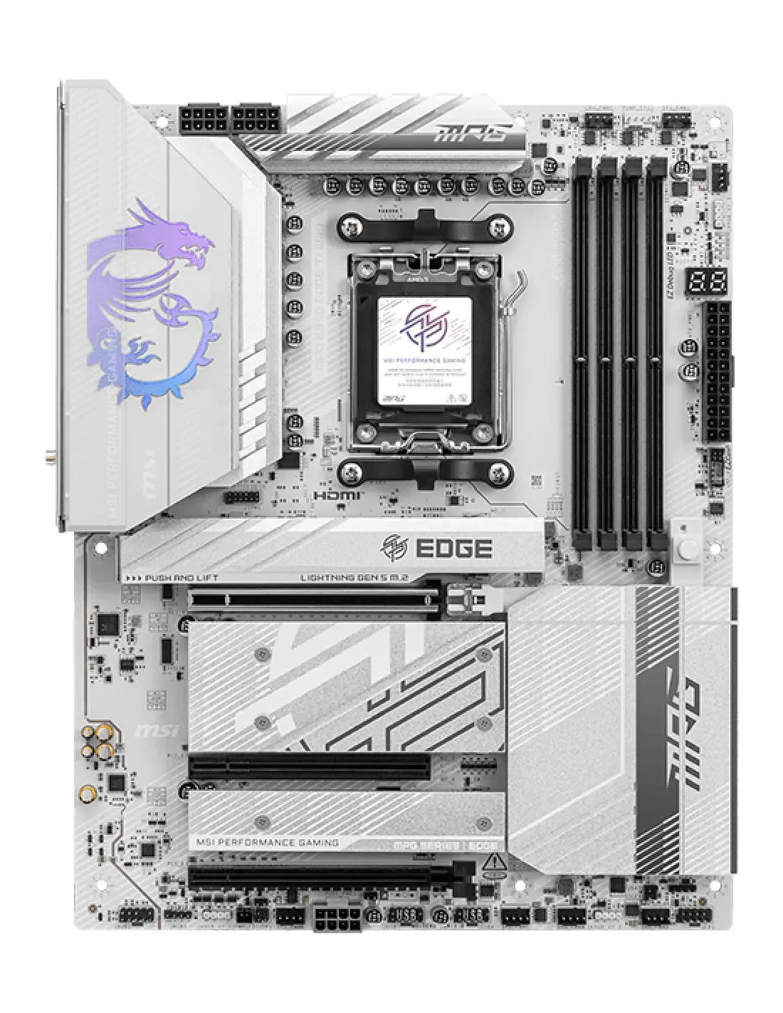 MSI MPG B850 EDGE TI WIFI. Produttore processore: AMD, Presa per processore: Socket AM5, Processori compatibili: AMD Ryzen 7000 Series, AMD Ryzen 8000 Series, AMD Ryzen 9000 Series. Tipi di memoria supportati: DDR5-SDRAM, RAM massima supportata: 256 GB, tipo di slot di memoria: DIMM. Interfacce dell'unità di archiviazione supportate: M.2, Micro SATA III, Tipi di unità di archiviazione supportate: HDD & SSD, Livelli RAID: 0, 1, 10. Tipo di interfaccia Ethernet: 2.5 Gigabit Ethernet, Wi-Fi standard: Wi-Fi 7 (802.11be), Standard Wi-Fi: 802.11a, 802.11b, 802.11g, Wi-Fi 4 (802.11n), Wi-Fi 5 (802.11ac), Wi-Fi 6 (802.11ax), Wi-Fi 6E.... Componente per: PC, Fattore di forma scheda madre: ATX, Famiglia di chipset per scheda madre: AMD