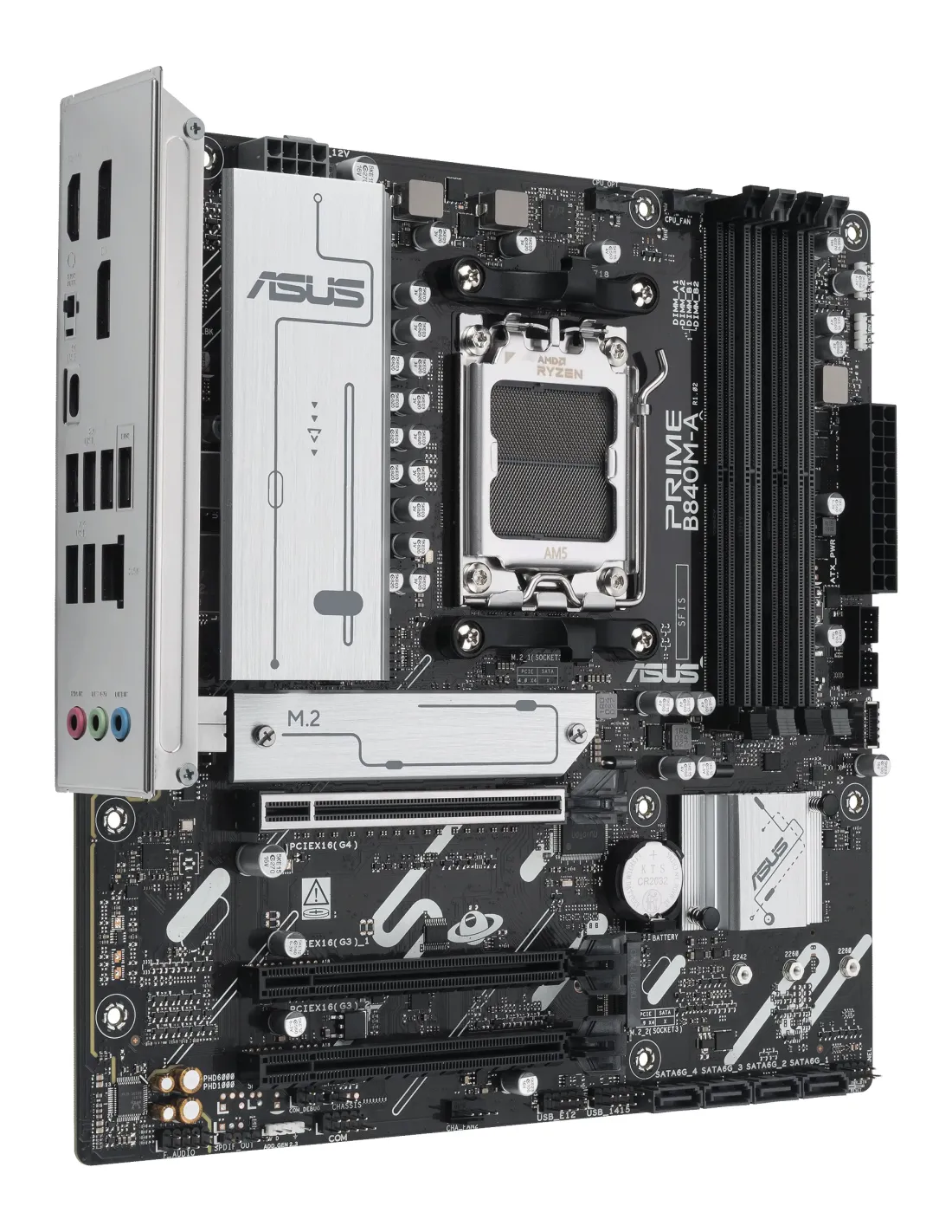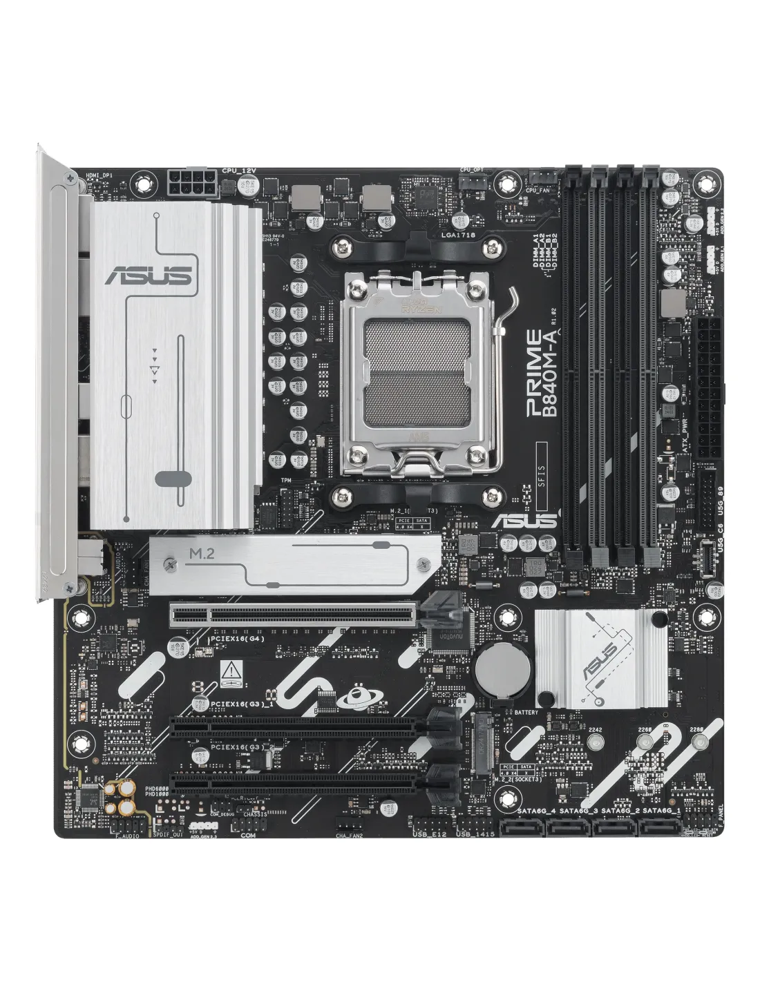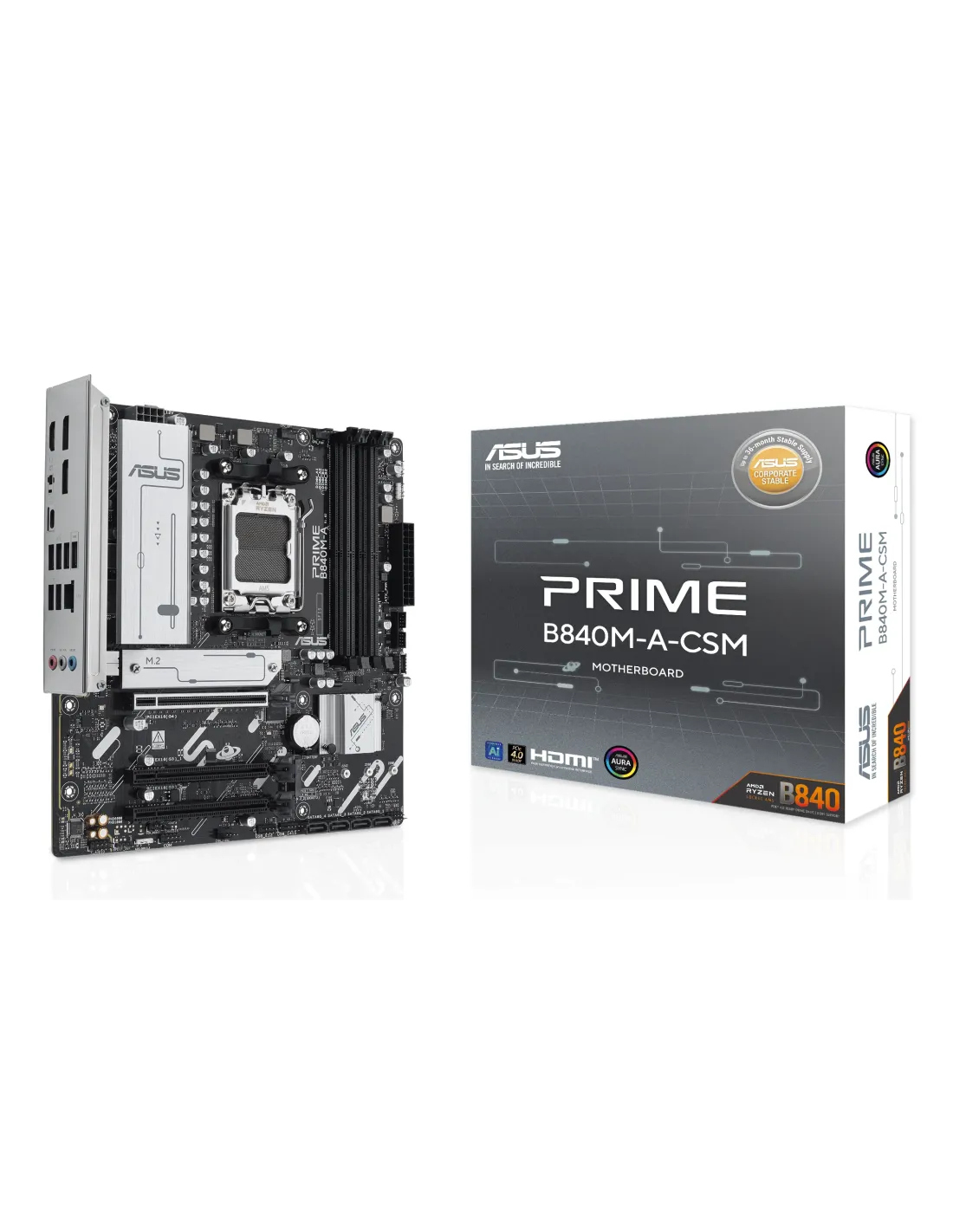 ASUS PRIME B840M-A-CSM. Produttore processore: AMD, Presa per processore: Socket AM5, Processori compatibili: AMD Ryzen 7000 Series, AMD Ryzen 8000 Series, AMD Ryzen 9000 Series. Tipi di memoria supportati: DDR5-SDRAM, RAM massima supportata: 192 GB, tipo di slot di memoria: DIMM. Interfacce dell'unità di archiviazione supportate: M.2, SATA III, Tipi di unità di archiviazione supportate: HDD & SSD, Livelli RAID: 0, 1, 5, 10. Risoluzione massima: 7680 x 4320 Pixel. Tipo di interfaccia Ethernet: 2.5 Gigabit Ethernet