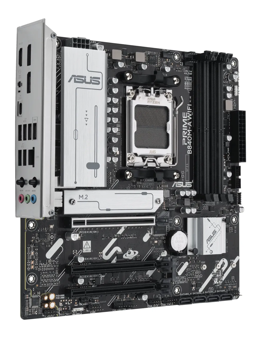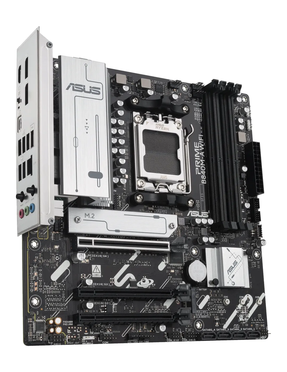 ASUS PRIME B840M-A WIFI. Produttore processore: AMD, Presa per processore: Socket AM5, Processori compatibili: AMD Ryzen 7000 Series, AMD Ryzen 8000 Series, AMD Ryzen 9000 Series. Tipi di memoria supportati: DDR5-SDRAM, RAM massima supportata: 192 GB, tipo di slot di memoria: DIMM. Interfacce dell'unità di archiviazione supportate: M.2, SATA III, Tipi di unità di archiviazione supportate: HDD & SSD, Livelli RAID: 0, 1, 5, 10. Tipo di interfaccia Ethernet: 2.5 Gigabit Ethernet, Wi-Fi standard: Wi-Fi 6E (802.11ax), Standard Wi-Fi: Wi-Fi 6E (802.11ax). Componente per: PC, Fattore di forma scheda madre: micro ATX, Famiglia di chipset per scheda madre: AMD
