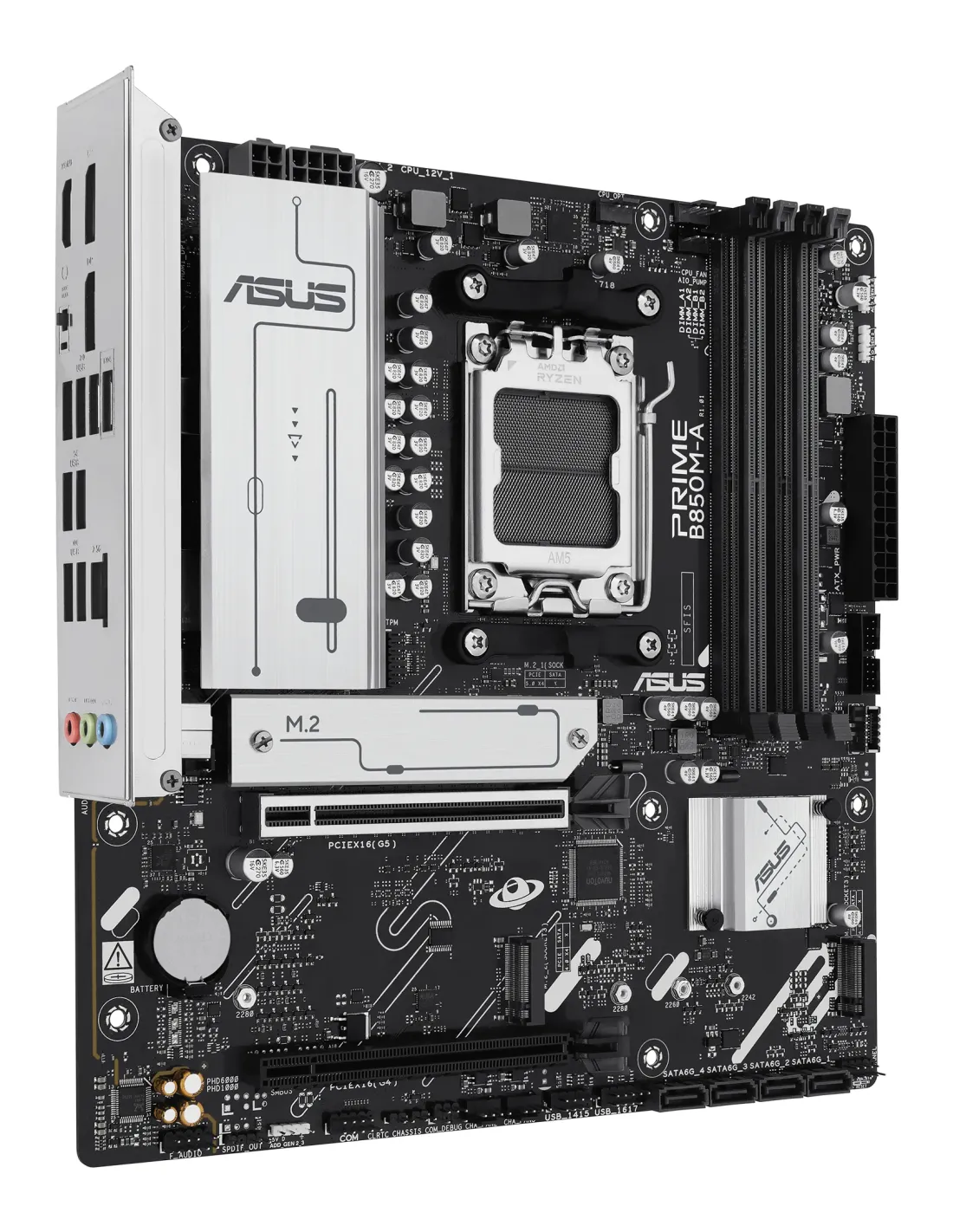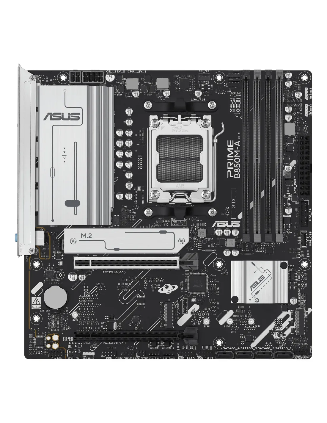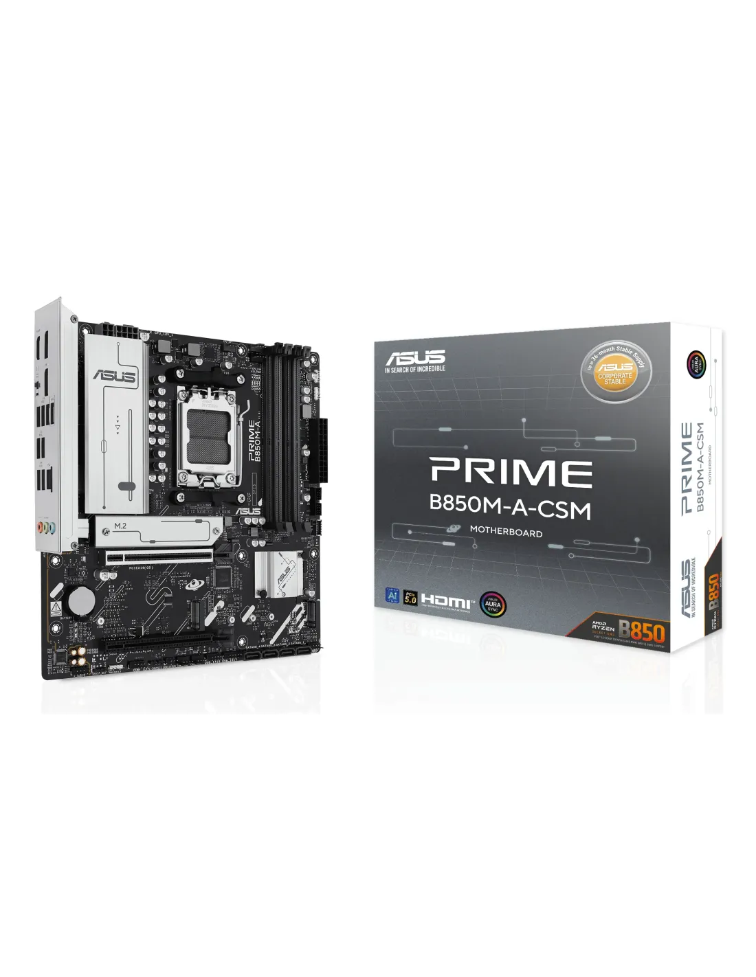 ASUS PRIME B850M-A-CSM. Produttore processore: AMD, Presa per processore: Socket AM5, Processori compatibili: AMD Ryzen 7000 Series, AMD Ryzen 8000 Series, AMD Ryzen 9000 Series. Tipi di memoria supportati: DDR5-SDRAM, RAM massima supportata: 256 GB, tipo di slot di memoria: DIMM. Interfacce dell'unità di archiviazione supportate: PCI Express 4.0, PCI Express 5.0, Tipi di unità di archiviazione supportate: HDD & SSD, Livelli RAID: 0, 1, 5, 10. Risoluzione massima: 7680 x 4320 Pixel. Tipo di interfaccia Ethernet: 2.5 Gigabit Ethernet