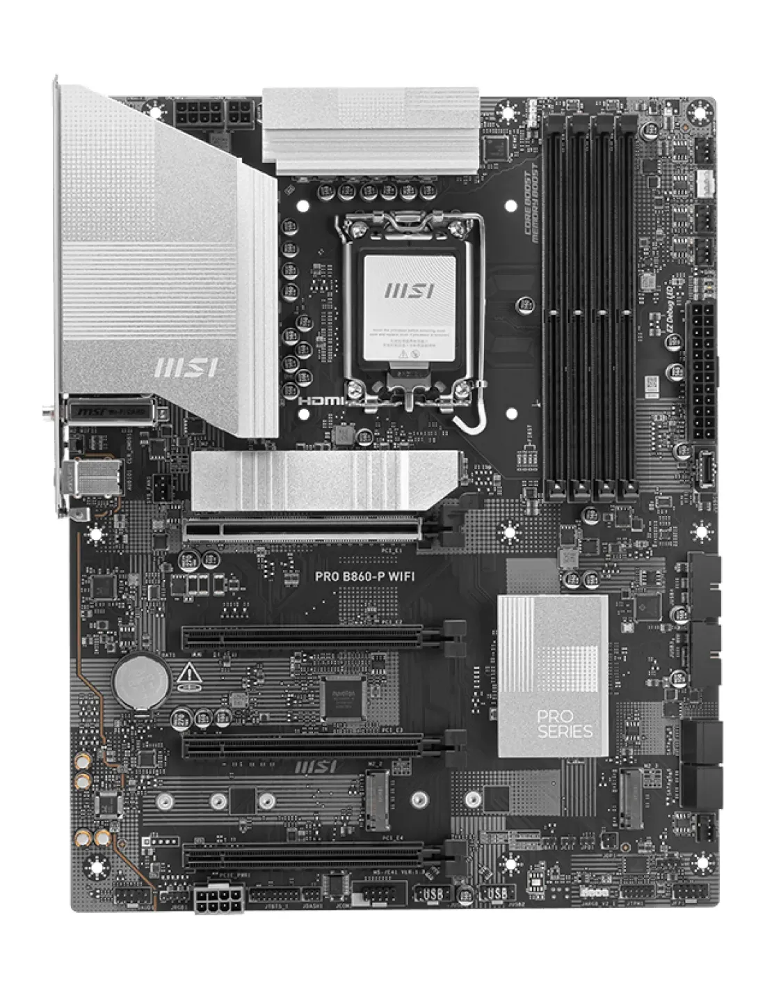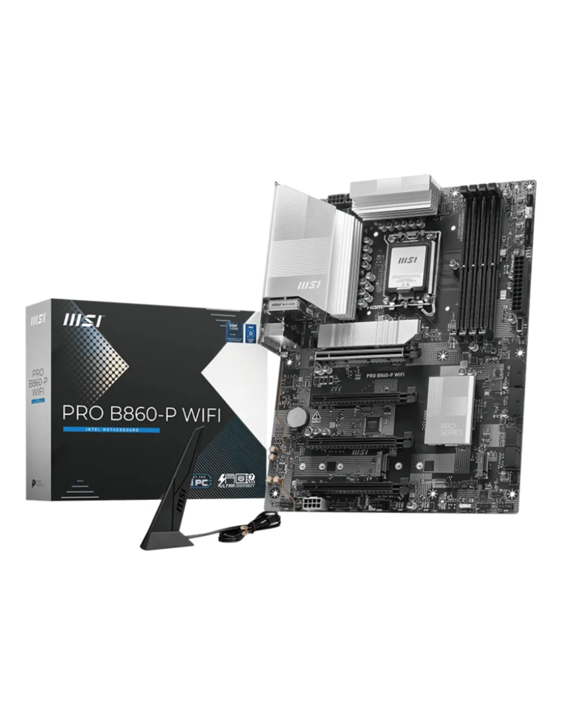 MSI PRO B860-P WIFI. Produttore processore: Intel, Presa per processore: LGA 1851 (Socket V1), Processori compatibili: Intel Core Ultra (Series 2). Tipi di memoria supportati: DDR5-SDRAM, RAM massima supportata: 256 GB, tipo di slot di memoria: DIMM. Interfacce dell'unità di archiviazione supportate: M.2, Micro SATA III, Tipi di unità di archiviazione supportate: HDD & SSD, Livelli RAID: 0, 1, 5, 10. Tipo di interfaccia Ethernet: 5 Gigabit Ethernet, Wi-Fi standard: Wi-Fi 7 (802.11be), Standard Wi-Fi: 802.11a, 802.11b, 802.11g, Wi-Fi 4 (802.11n), Wi-Fi 5 (802.11ac), Wi-Fi 6 (802.11ax), Wi-Fi 6E.... Componente per: PC, Fattore di forma scheda madre: ATX, Famiglia di chipset per scheda madre: AMD