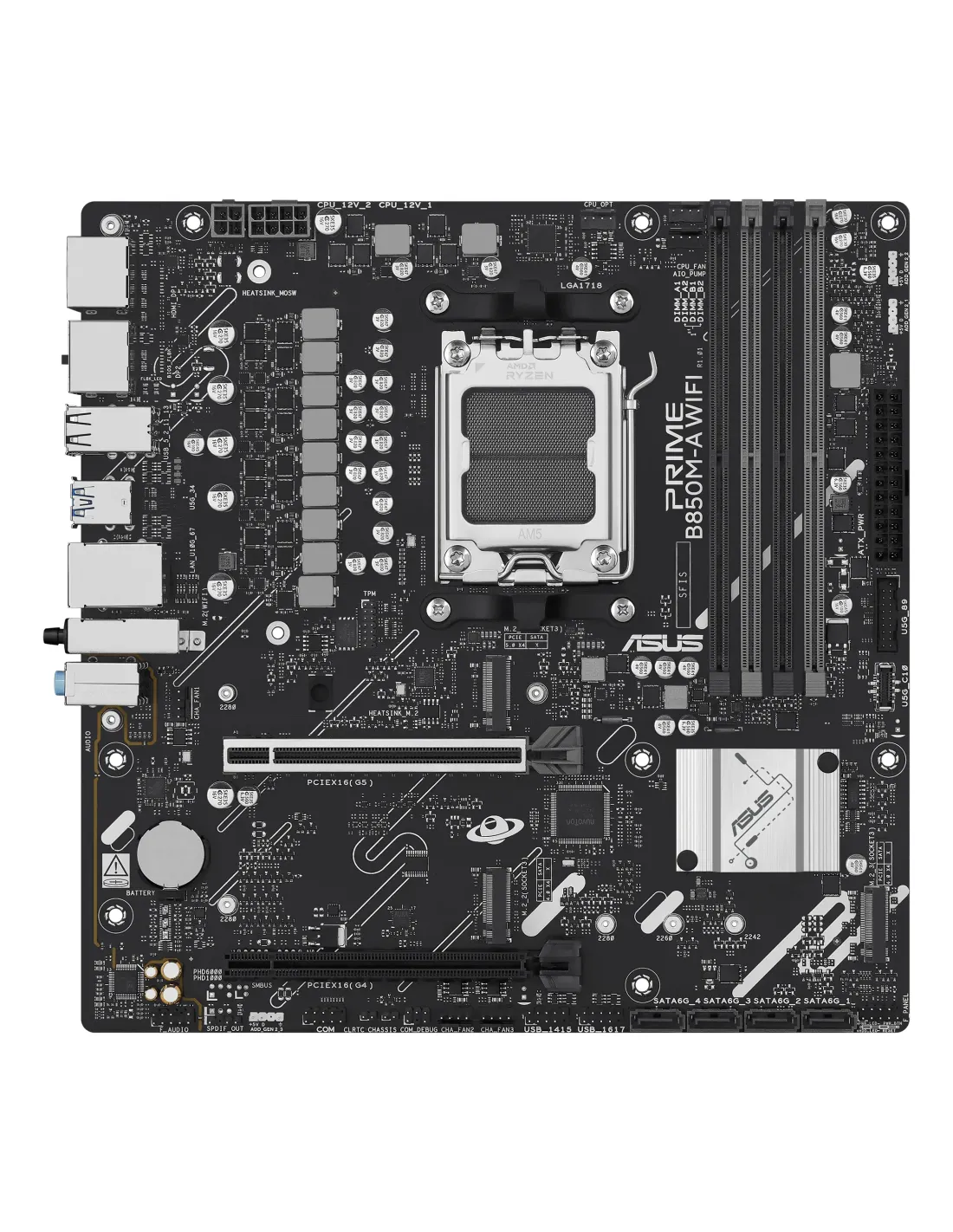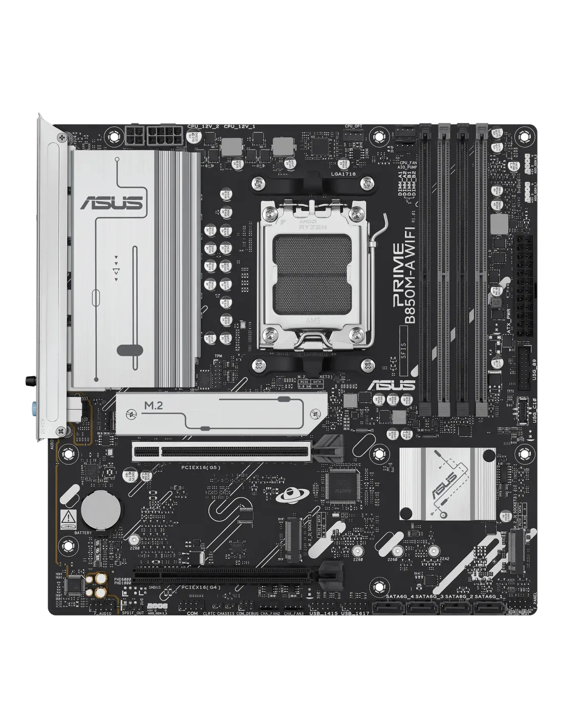 ASUS PRIME B850M-A WIFI. Produttore processore: AMD, Presa per processore: Socket AM5, Processori compatibili: AMD Ryzen 7000 Series, AMD Ryzen 8000 Series, AMD Ryzen 9000 Series. Tipi di memoria supportati: DDR5-SDRAM, RAM massima supportata: 256 GB, tipo di slot di memoria: DIMM. Interfacce dell'unità di archiviazione supportate: M.2, SATA III, Tipi di unità di archiviazione supportate: HDD & SSD, Livelli RAID: 0, 1, 5, 10. Tipo di interfaccia Ethernet: 2.5 Gigabit Ethernet, Fast Ethernet, Gigabit Ethernet, Wi-Fi standard: Wi-Fi 6E (802.11ax). Componente per: PC, Fattore di forma scheda madre: micro ATX, Famiglia di chipset per scheda madre: AMD