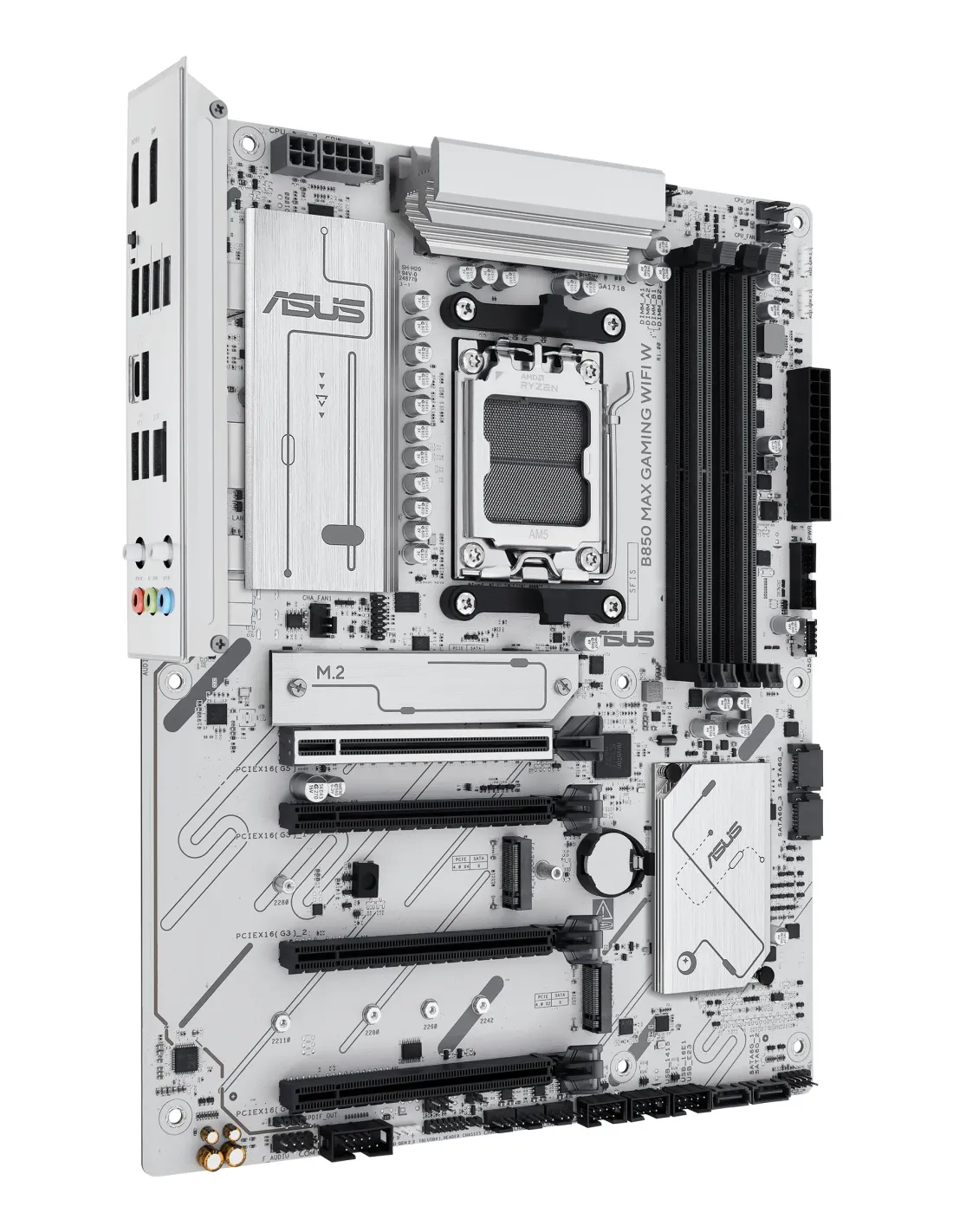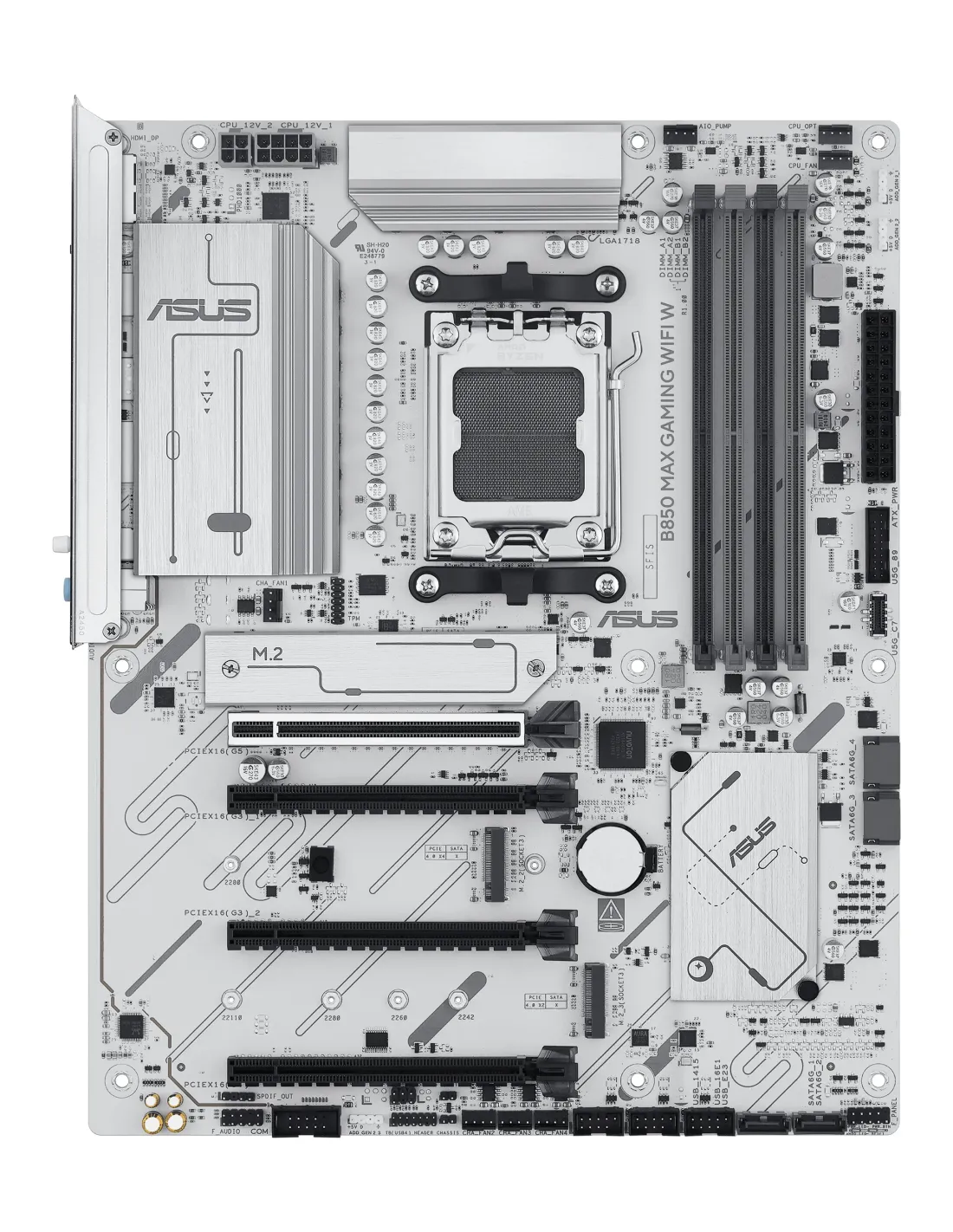 ASUS B850 MAX GAMING WIFI W. Produttore processore: AMD, Presa per processore: Socket AM5, Processori compatibili: AMD Ryzen 7000 Series, AMD Ryzen 8000 Series, AMD Ryzen 9000 Series. Tipi di memoria supportati: DDR5-SDRAM, RAM massima supportata: 256 GB, tipo di slot di memoria: DIMM. Interfacce dell'unità di archiviazione supportate: M.2, SATA III, Tipi di unità di archiviazione supportate: HDD & SSD, Livelli RAID: 0, 1, 5, 10. Tipo di interfaccia Ethernet: 2.5 Gigabit Ethernet, Wi-Fi standard: Wi-Fi 6E (802.11ax), Standard Wi-Fi: Wi-Fi 6E (802.11ax). Componente per: PC, Fattore di forma scheda madre: ATX, Famiglia di chipset per scheda madre: AMD