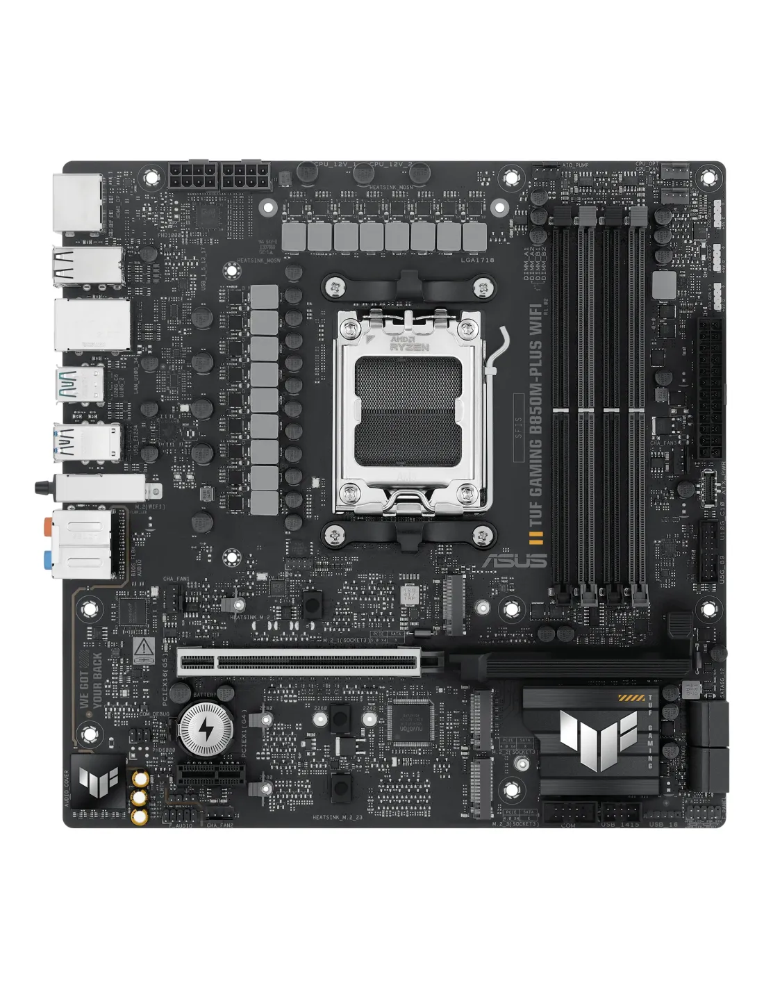 ASUS TUF GAMING B850M-PLUS WIFI. Produttore processore: AMD, Presa per processore: Socket AM5, Processori compatibili: AMD Ryzen 7000 Series, AMD Ryzen 8000 Series, AMD Ryzen 9000 Series. Tipi di memoria supportati: DDR5-SDRAM, RAM massima supportata: 192 GB, tipo di slot di memoria: DIMM. Interfacce dell'unità di archiviazione supportate: M.2, SATA III, Tipi di unità di archiviazione supportate: HDD & SSD, Livelli RAID: 0, 1, 5, 10. Tipo di interfaccia Ethernet: 2.5 Gigabit Ethernet, Wi-Fi standard: Wi-Fi 6E (802.11ax), Standard Wi-Fi: Wi-Fi 6E (802.11ax). Componente per: PC, Fattore di forma scheda madre: micro ATX, Famiglia di chipset per scheda madre: AMD