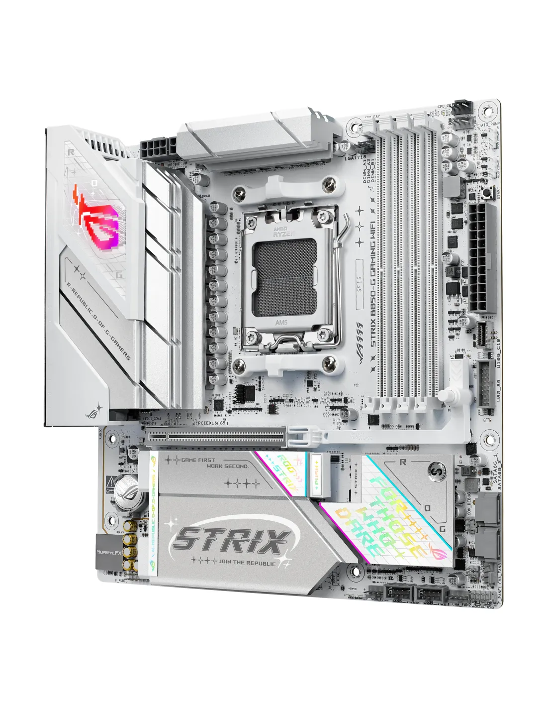 ASUS ROG STRIX B850-G GAMING WIFI. Produttore processore: AMD, Presa per processore: Socket AM5, Processori compatibili: AMD Ryzen 7000 Series, AMD Ryzen 8000 Series, AMD Ryzen 9000 Series. Tipi di memoria supportati: DDR5-SDRAM, RAM massima supportata: 256 GB, tipo di slot di memoria: DIMM. Interfacce dell'unità di archiviazione supportate: M.2, SATA III, Tipi di unità di archiviazione supportate: HDD & SSD, Livelli RAID: 0, 1, 5, 10. Tipo di interfaccia Ethernet: 2.5 Gigabit Ethernet, Wi-Fi standard: Wi-Fi 7 (802.11be), Standard Wi-Fi: Wi-Fi 7 (802.11be). Componente per: PC, Fattore di forma scheda madre: micro ATX, Famiglia di chipset per scheda madre: AMD