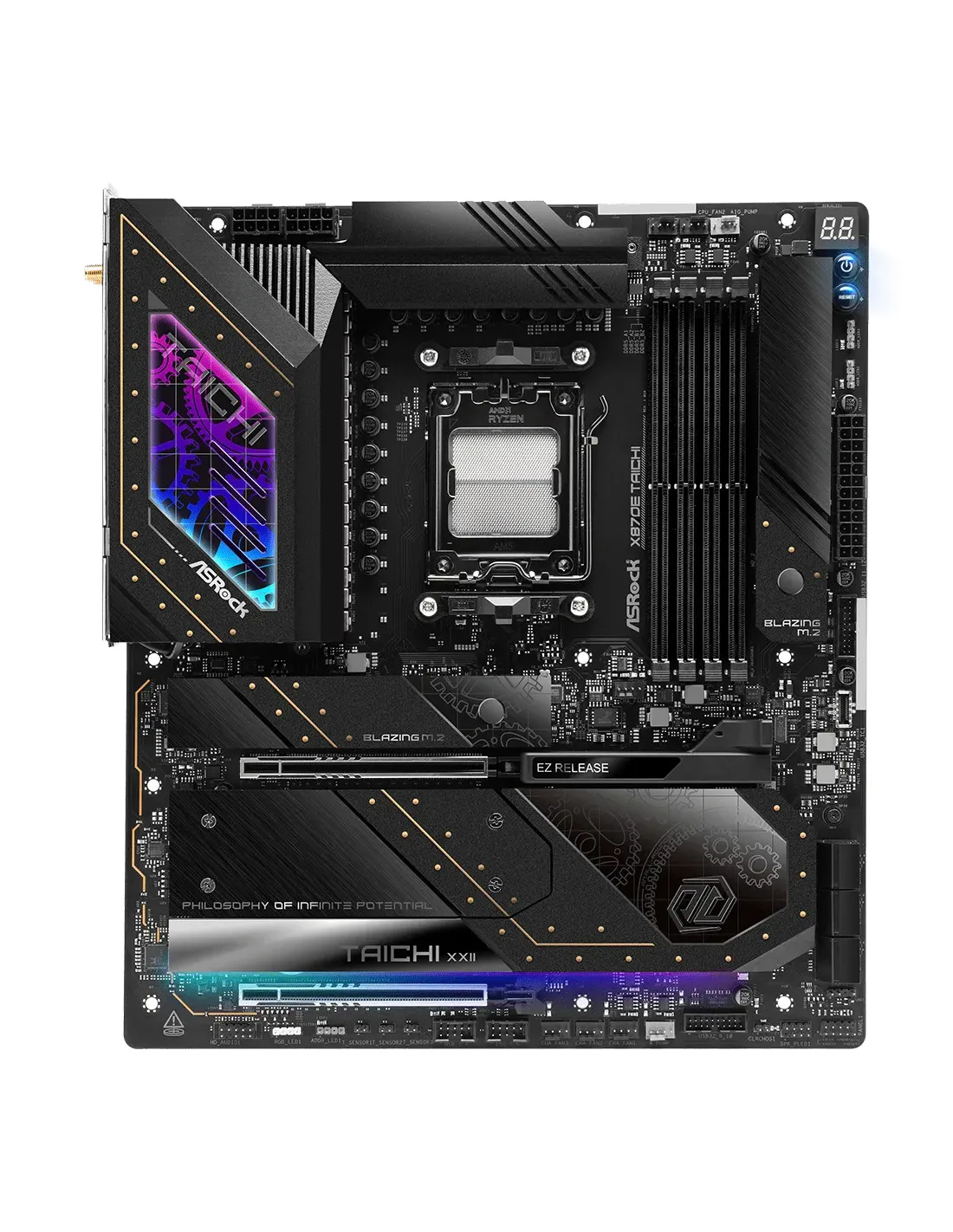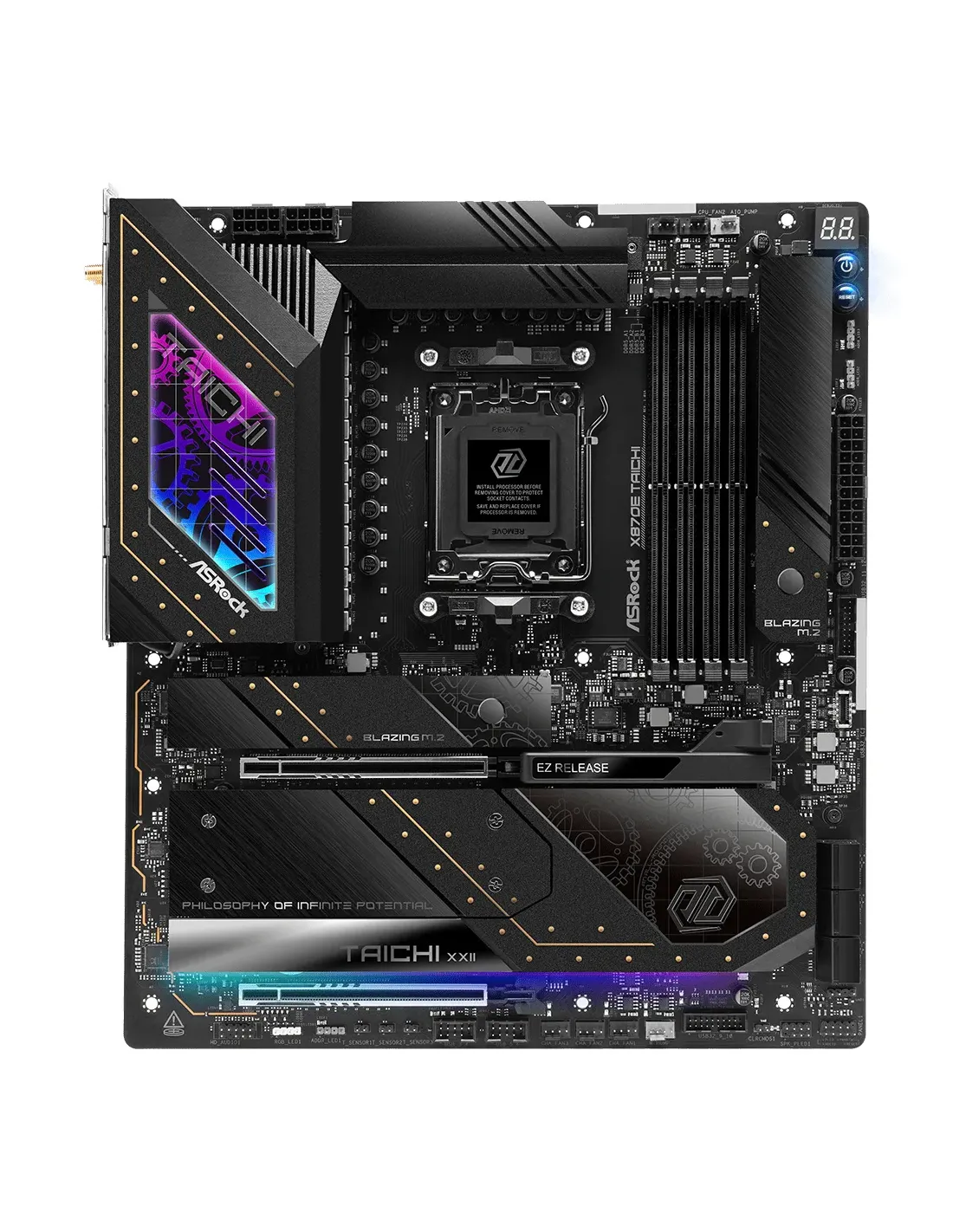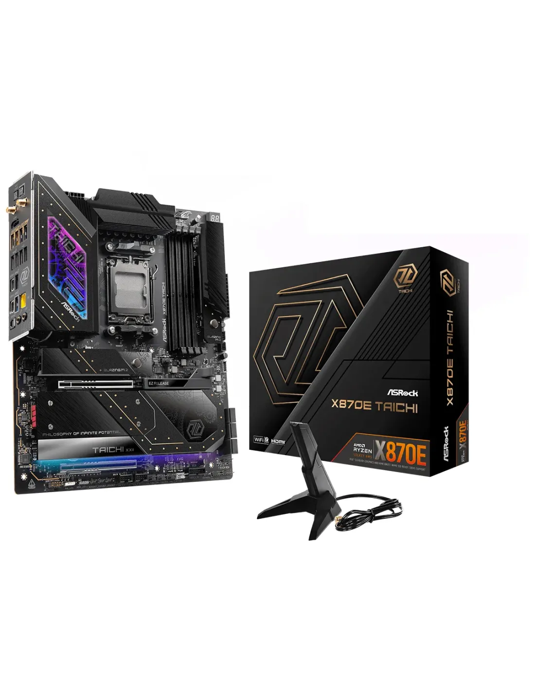 Asrock X870E Taichi. Produttore processore: AMD, Presa per processore: Socket AM5, Processori compatibili: AMD Ryzen 7000 Series, AMD Ryzen 8000 Series, AMD Ryzen 9000 Series. Tipi di memoria supportati: DDR5-SDRAM, RAM massima supportata: 256 GB, tipo di slot di memoria: DIMM. Interfacce dell'unità di archiviazione supportate: M.2, SATA III, Tipi di unità di archiviazione supportate: HDD & SSD, Livelli RAID: 0, 1, 10. Tipo di interfaccia Ethernet: 2.5 Gigabit Ethernet, 5 Gigabit Ethernet, Fast Ethernet, Gigabit Ethernet, Controller LAN: Realtek RTL8126, Wi-Fi standard: Wi-Fi 7 (802.11be). Componente per: PC, Fattore di forma scheda madre: ATX esteso, Famiglia di chipset per scheda madre: AMD