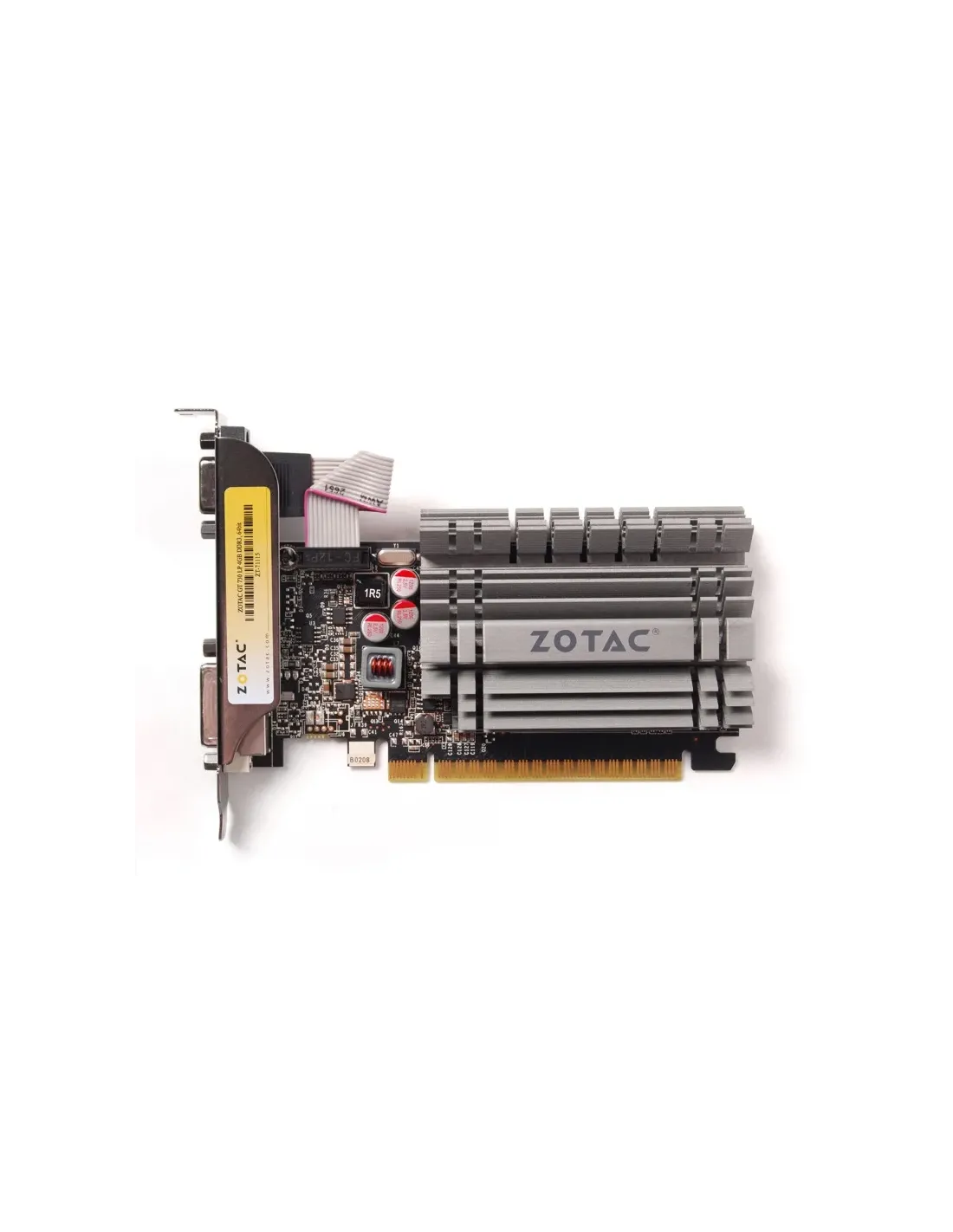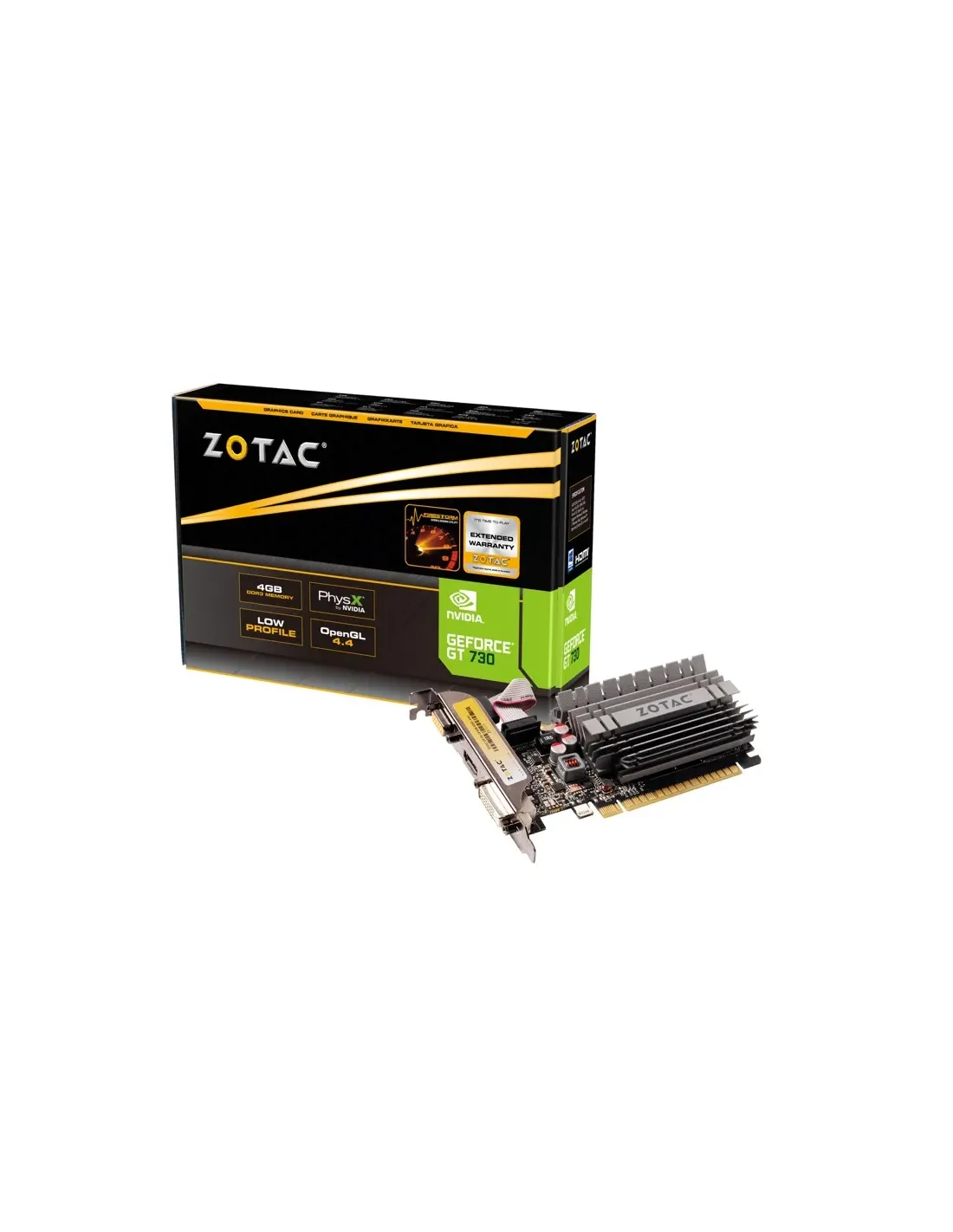 Zotac ZT-71115-20L. Processore grafico / fornitore: NVIDIA, Processore grafico: GeForce GT 730, Frequenza del processore: 902 MHz. Memoria Grafica Dedicata: 4 GB, Tipo memoria adattatore grafico: GDDR3, Ampiezza dati: 64 bit, Velocità memoria: 1600 MHz. Risoluzione massima: 4096 x 2160 Pixel. Versione DirectX: 12.0, Versione OpenGL: 4.4, Dual Link DVI. Tipo interfaccia: PCI Express x16 2.0. Tipo di raffreddamento: Passivo, Numero di ventole: 0 ventola(e)