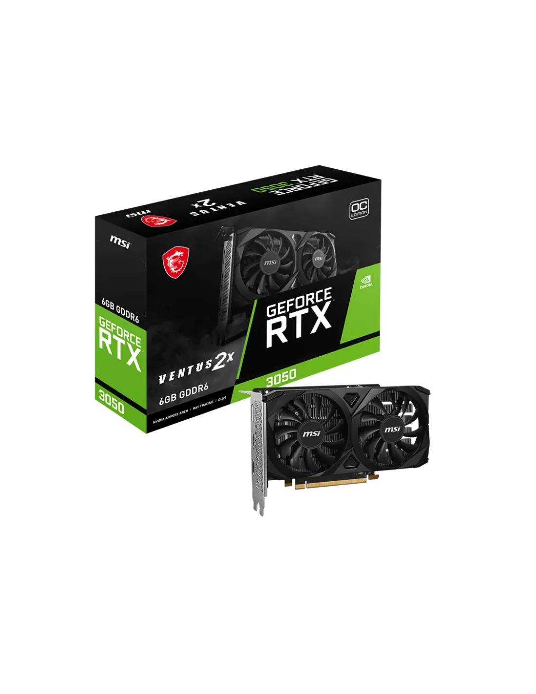 MSI VENTUS GeForce RTX 3050 2X E 6G OC. Processore grafico / fornitore: NVIDIA, Processore grafico: GeForce RTX 3050. Memoria Grafica Dedicata: 6 GB, Tipo memoria adattatore grafico: GDDR6, Ampiezza dati: 96 bit. Risoluzione massima: 7680 x 4320 Pixel. Versione DirectX: 12 Ultimate, Versione OpenGL: 4.6. Tipo interfaccia: PCI Express x8 4.0. Tipo di raffreddamento: Attivo, Numero di ventole: 2 ventola(e)