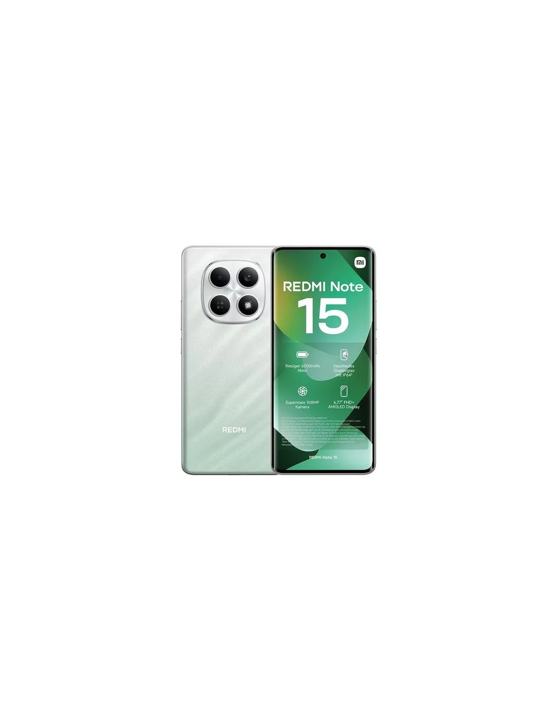 Xiaomi Redmi Note 15. Dimensioni diagonale schermo: 17,2 cm (6.77"), Risoluzione del display: 2392 x 1080 Pixel. Frequenza del processore: 2 GHz, Famiglia processore: MediaTek, Modello del processore: Helio G100 Ultra. Capacità della RAM: 8 GB, Tipo di RAM: LPDDR4X, Capacità memoria interna: 256 GB. Risoluzione fotocamera posteriore (numerico): 108 MP, Tipo di fotocamera posteriore: Tripla fotocamera. Capacità della batteria: 6000 mAh. Colore del prodotto: Verde. Peso: 183,7 g
