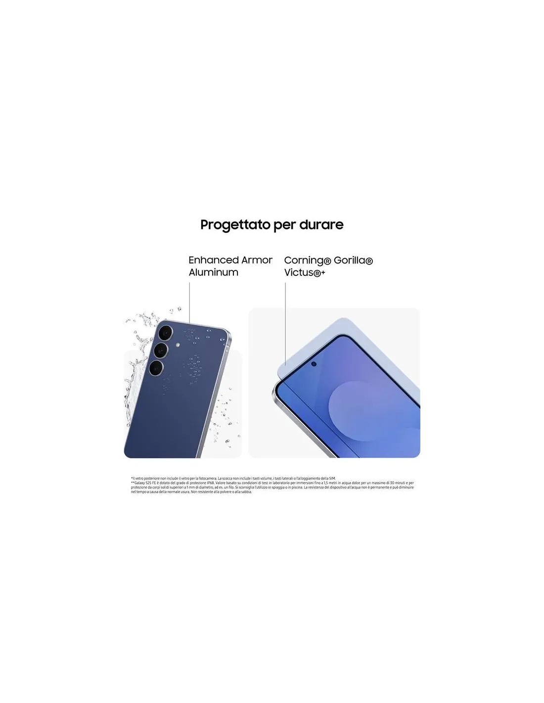 2_Galaxy S25 FE è resistente all’acqua e alla polvere, ma non è impermeabile. Lo smartphone è stato testato in un ambiente controllato ed è certificato in situazioni specifiche (soddisfa i requisiti di classificazione IP68 previsti dallo standard internazionale IEC 60529). Condizioni di test: immersione in acqua dolce, temperatura ambiente, 1,5 metri, 30 minuti. Non adatti ad utilizzo in condizioni diverse da quelle di test. Non usare in spiaggia o in piscina, doccia, spa o sauna, né esporre ad intensi flussi d'acqua o all'acqua corrente, né usare durante sport acquatici. I danni da liquidi non sono coperti dalla garanzia convenzionale Samsung. La resistenza all’acqua e alla polvere del dispositivo potrebbe diminuire nel tempo a causa della normale usura.