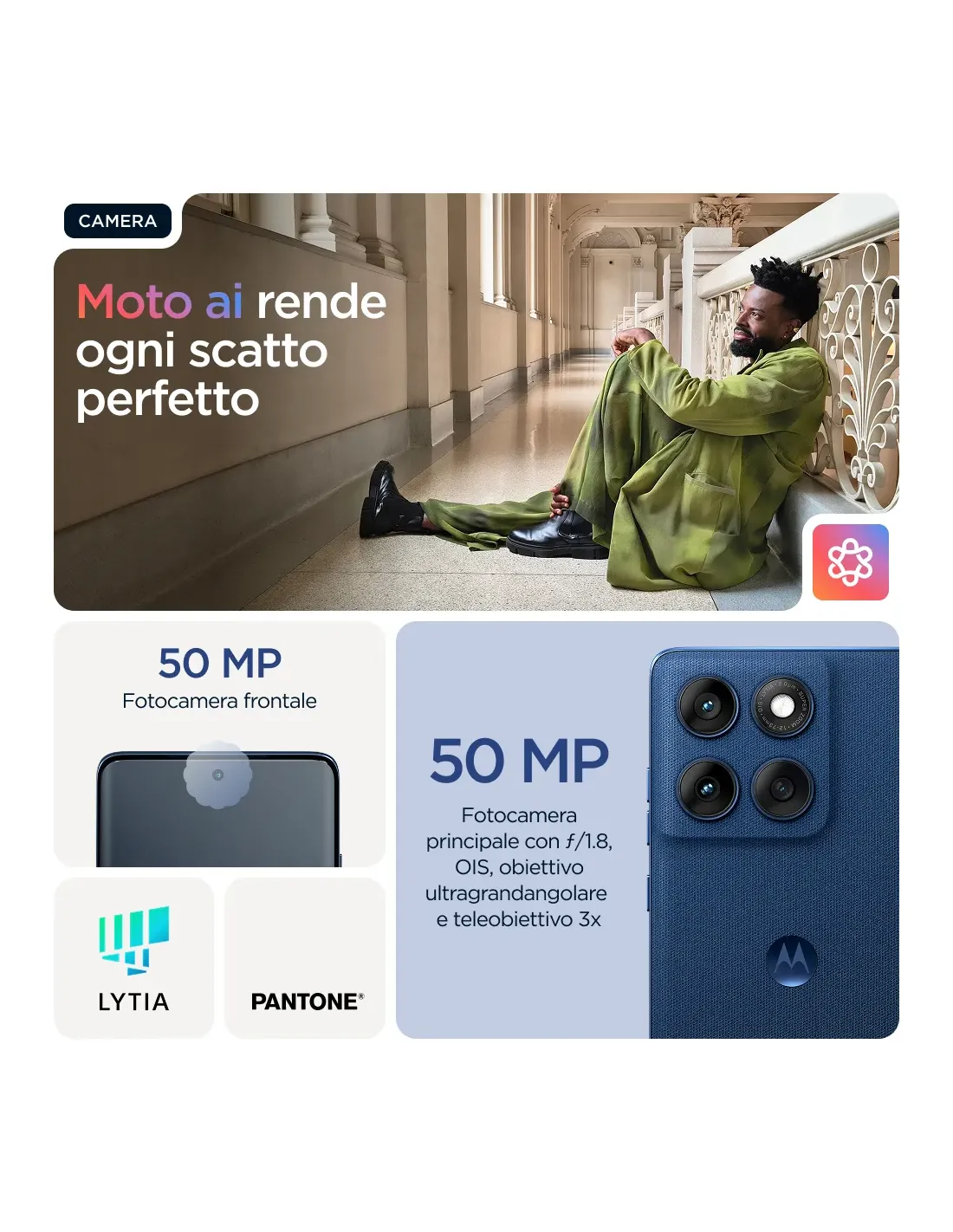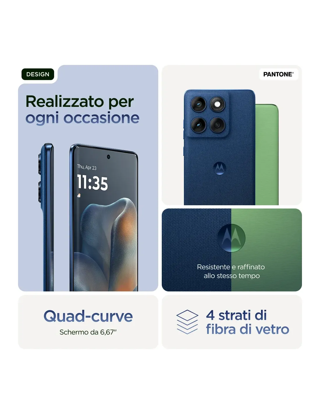 Per esprimerti al meglio ci vuole qualcosa di adatto al tuo stile. Il suo nome è Motorola Edge 60. Con un design quad-curved realizzato con precisione, è eccezionale da ogni angolazione. Scatta foto iconiche con quattro fotocamere professionali — principale, ultragrandangolare e selfie da 50 MP più teleobiettivo 3x dedicato — e Moto AI per una creatività immediata. Goditi uno smartphone dal design elegante e sofisticato, sempre protetto da cadute(1,2), temperature estreme(2) e acqua(3). Lasciati incantare dallo schermo Super HD (1220p) da 6,67", il più luminoso di sempre. Carica la batteria per l'intera giornata in soli 8 minuti (4) con la ricarica TurboPower™ da 68 W. In più c'è Moto AI, che rende i momenti di ogni giorno più semplici e intuitivi, dallo scatto di foto perfette all'organizzazione delle notifiche. È arrivato il nuovo Motorola Edge 60. What's your edge?