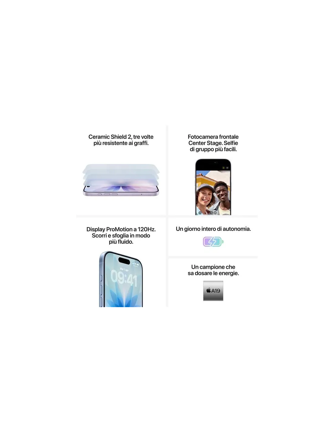 Apple iPhone 17 256GB Azzurro NebbiaFantasticolor.iPhone 17. Sempre più bello. Sempre più robusto. Display ProMotion da 6,3", Ceramic Shield 2, fotocamere posteriori tutte da 48MP, fotocamera frontale Center Stage, chip A19 e molto altro.Caratteristiche principali- NATO PER PIACERE, FATTO PER DURARE — iPhone 17 è disponibile in cinque splendidi colori, ha un display da 6,3" più luminoso e la parte frontale in Ceramic Shield 2, tre volte più resistente ai graffi.- DISPLAY DA 6,3" CON PROMOTION: PIÙ LUMINOSO E BRILLANTE — Con la tecnologia ProMotion fino a 120Hz tutto scorre alla grande, e 3000 nit di luminosità di picco garantiscono un contrasto migliore all’aperto. E il display ha il 33% di riflessi in meno.- FOTO STREPITOSE — Foto ad altissima risoluzione per impostazione predefinita, grazie al sistema a doppia fotocamera Fusion da 48MP con zoom 2x di qualità ottica e ultra-grandangolo Fusion da 48MP.- FOTOCAMERA FRONTALE CENTER STAGE DA 18MP — Ancora più modi per trovare l’inquadratura giusta. Selfie di gruppo più facili, video con Acquisizione doppia per riprendere in simultanea te e la scena che hai davanti. E molto altro.- CHIP A19: UN CAMPIONE CHE SA DOSARE LE ENERGIE — Con una GPU 5 core, il Neural Engine migliorato scatena Apple Intelligence, i giochi più evoluti e tutto quel che fai sul tuo iPhone.- MINUTI PER RICARICARE, ORE PER CIÒ CHE VUOI FARE — La batteria dura tutto il giorno e ti dà fino a 30 ore di riproduzione video. E bastano 20 minuti per ricaricare fino al 50%.- iOS 26: L’ASPETTO CAMBIA, LA MAGIA AUMENTA — Liquid Glass. Il nuovo, bellissimo design che rende la tua esperienza d’uso più uniforme e ti farà subito sentire a casa. Con una schermata di blocco più d’impatto, sondaggi e sfondi personalizzabili in Messaggi, Filtro delle chiamate e molto altro.- PROGETTATO PER APPLE INTELLIGENCE – Fa di tutto per te, tenendo tutto per sé. Scrivere, creare e far tutto ciò che vuoi ora è più facile che mai.- FUNZIONI VIA SATELLITE — Se non c’è campo o non si sono reti Wi-Fi disponibili, puoi usare SOS emergenze via satellite. E in caso di grave incidente d’auto, iPhone può chiamare i soccorsi se tu non puoi.- UNA CONNESSIONE MIGLIORE, UNA VELOCITÀ SUPERIORE — Con il Wi-Fi 7, il 5G, il Bluetooth 6 e l’eSIM puoi contare su connessioni più veloci e sicure.- eSIM: SEMPLICE, VERSATILE, SICURA — È una tecnologia più comoda e flessibile che ti offre maggiore sicurezza e una connessione senza intoppi, ideale quando viaggi all’estero.- PRIVACY — Un nuovo livello di privacy e sicurezza. Di serie.Fotocamera frontale Center Stage da 18MP. Tutta un’altra posa.Un nuovissimo sensore quadrato ti permette di zoomare e ruotare a piacimento. Così, quando scatti un selfie o giri un video, l’inquadratura è sempre perfetta. E include automaticamente tutti i soggetti quando fai le foto di gruppo.Fotocamere posteriori tutte da 48MP. Uno scatto evolutivo.iPhone 17 ha una fotocamera principale Fusion da 48MP con teleobiettivo 2x di qualità ottica, e un ultra-grandangolo Fusion da 48MP. Quest’ultimo ha il quadruplo della risoluzione rispetto a quello di iPhone 16 e ora scatta di default foto da 24MP: la dimensione ideale per conservare e condividere versioni di alta qualità. Così, da vicino o da lontano, al chiuso o all’aperto, in pieno sole o con poca luce, avrai sempre foto spettacolari ad altissima risoluzione. E con l’archiviazione base che parte da 256GB, cioè il doppio dello spazio iniziale rispetto al modello precedente, puoi scattare come se non ci fosse un domani.Teleobiettivo 2xAllarga l’inquadratura o ingrandisci con lo zoom: avrai sempre dettagli incredibili.RipulisciRimuovi oggetti, persone e altri elementi indesiderati dalle tue fotoFoto con poca luce e in modalità NotteCattura immagini più nitide, dettagliate e luminose, con colori naturali e disturbo ridotto, anche quando è buio.Stili fotografici di nuova generazioneScegli uno dei vari stili predefiniti, come il nuovo Luminoso, per personalizzare la tonalità, il colore e l’aspetto generale delle tue foto.MacroScatta primissimi piani d’effetto catturando ogni minimo dettaglio in modo incredibilmente nitido.Video di livello professionaleRegistra video fino a 4K a 60 fps oppure attiva la modalità Cinema per risultati da film. E con Mix audio puoi regolare il suono delle voci nei tuoi video.Chip A19. Una batteria che dura tutto il giorno. Un campione che sa dosare le energie.Il chip A19 è il motore di tutto quello che fai sul tuo iPhone. Rende possibili funzioni di Apple Intelligence come Traduzione in tempo reale e Image Playground, e grazie alla tecnologia ProMotion manda in orbita anche i giochi AAA più evoluti. Con un’autonomia che dura tutto il giorno puoi lavorare, guardare video e restare fuori casa senza pensieri. E se vai di fretta, bastano 10 minuti di carica per avere fino a 8 ore di riproduzione video quando usi un alimentatore ad alta potenza.La famiglia iPhone. Tutto quello che cercavi. E quello che non immaginavi.Ci sono tantissimi motivi per amare i nuovi iPhone. Apple Intelligence e le sue funzioni utili, come l’intelligenza visiva e gli Strumenti di scrittura, ti semplificano la vita ogni giorno. Le connessioni sono veloci e sicure grazie al Wi-Fi 7, al Bluetooth, alla connettività 5G e all’eSIM.Liquid GlassIl nuovo design di iOS riflette e rifrange in tempo reale le immagini sottostanti, adattandosi in maniera dinamica ai tuoi contenuti tra app e dispositivi diversi.Una schermata di blocco più d’impattoL’ora si adatta dinamicamente alla foto sullo sfondo e alle notifiche, in modo che il soggetto dell’immagine non venga mai coperto. E quando muovi l’iPhone, l’immagine prende vita con un nuovo effetto 3D.Sondaggi in MessaggiCrea un sondaggio all’interno di una conversazione, e tutti i contatti presenti potranno partecipare e tenere d’occhio i voti man mano che arrivano.Intelligenza visivaInquadra qualcosa con 