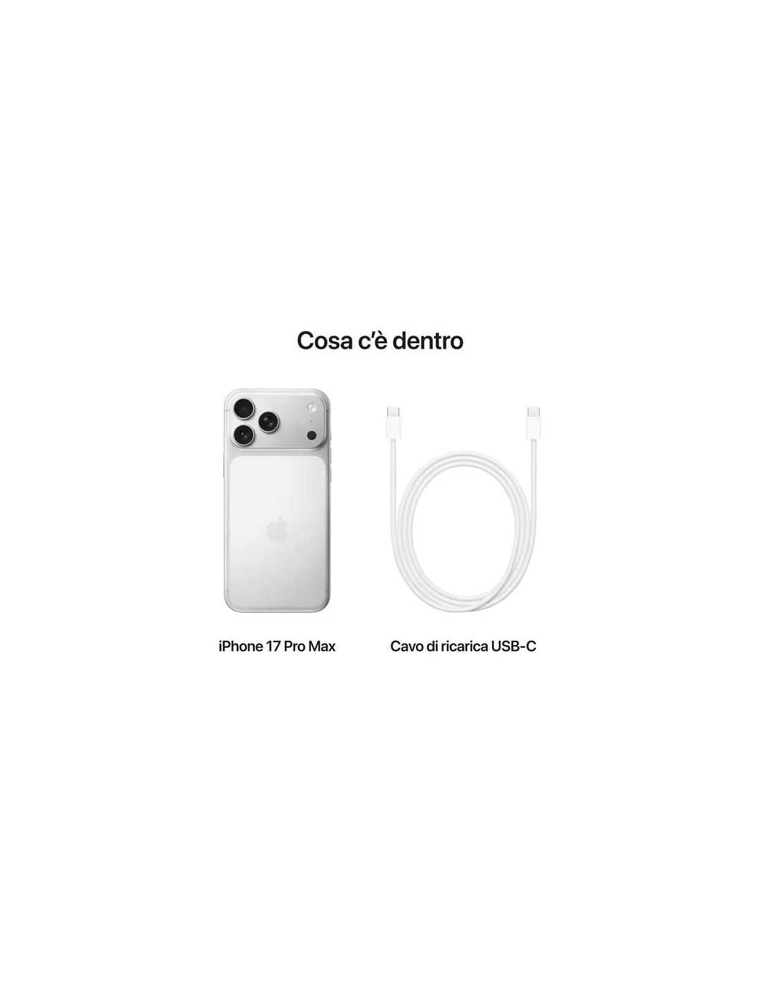 Apple iPhone 17 Pro Max 256GB ArgentoMai così Pro.Pro assoluto.iPhone 17 Pro Max. L’iPhone più potente di sempre. Brillante display da 6,9", design unibody in alluminio, chip A19 Pro, fotocamere posteriori tutte da 48MP e la migliore autonomia di sempre.Caratteristiche principali - DESIGN UNIBODY PER UNA POTENZA ECCEZIONALE — Il design unibody in alluminio forgiato a caldo offre performance mai viste su un iPhone.- ROBUSTO CERAMIC SHIELD DAVANTI E DIETRO — Il Ceramic Shield protegge il retro di iPhone 17 Pro Max rendendolo quattro volte più resistente agli urti. E il nuovo Ceramic Shield 2 nella parte frontale è tre volte più resistente ai graffi.- SISTEMA DI FOTOCAMERE PRO IPEREVOLUTO — Tutte le fotocamere posteriori sono da 48MP e lo zoom di qualità ottica arriva a 8x: l’estensione focale maggiore di sempre su un iPhone. In pratica, è come avere in tasca 8 obiettivi professionali.- FOTOCAMERA FRONTALE CENTER STAGE DA 18MP — Ancora più modi per trovare l’inquadratura giusta. Selfie di gruppo più facili, video con Acquisizione doppia per riprendere in simultanea te e la scena che hai davanti. E molto altro.- CHIP A19 PRO: RAFFREDDATO A VAPORE, VELOCE COME IL FULMINE — A19 Pro è il chip per iPhone più potente di sempre, con prestazioni costanti fino al 40% superiori.- PIÙ AUTONOMIA DI OGNI ALTRO IPHONE — Il design unibody aumenta in modo significativo lo spazio per la batteria, che arriva a darti fino a 37 ore di riproduzione video. E bastano 20 minuti per ricaricare fino al 50%.- iOS 26: L’ASPETTO CAMBIA, LA MAGIA AUMENTA — Liquid Glass. Il nuovo, bellissimo design che rende la tua esperienza d’uso più uniforme e ti farà subito sentire a casa. Con una schermata di blocco più d’impatto, sondaggi e sfondi personalizzabili in Messaggi, Filtro delle chiamate e molto altro.- PROGETTATO PER APPLE INTELLIGENCE – Fa di tutto per te, tenendo tutto per sé. Scrivere, creare e far tutto ciò che vuoi ora è più facile che mai.- FUNZIONI VIA SATELLITE — Se non c’è campo o non si sono reti Wi-Fi disponibili, puoi usare SOS emergenze via satellite. E in caso di grave incidente d’auto, iPhone può chiamare i soccorsi se tu non puoi.- UNA CONNESSIONE MIGLIORE, UNA VELOCITÀ SUPERIORE — Con il Wi-Fi 7, il 5G, il Bluetooth 6 e l’eSIM puoi contare su connessioni più veloci e sicure.- eSIM: SEMPLICE, VERSATILE, SICURA — È una tecnologia più comoda e flessibile che ti offre maggiore sicurezza e una connessione senza intoppi, ideale quando viaggi all’estero.- PRIVACY — Un nuovo livello di privacy e sicurezza. Di serie.Guscio unibody. Esaltatore di potenza.I nuovi iPhone 17 Pro e iPhone 17 Pro Max sono progettati in ogni singolo dettaglio per essere gli iPhone più potenti di sempre. L’essenza del nuovo design è il guscio unibody in alluminio forgiato a caldo, che ottimizza prestazioni, durata della batteria e resistenza.Guardalo da vicino.Colori. Scegli fra tre audaci colori. iPhone 17 Pro arancione cosmico.